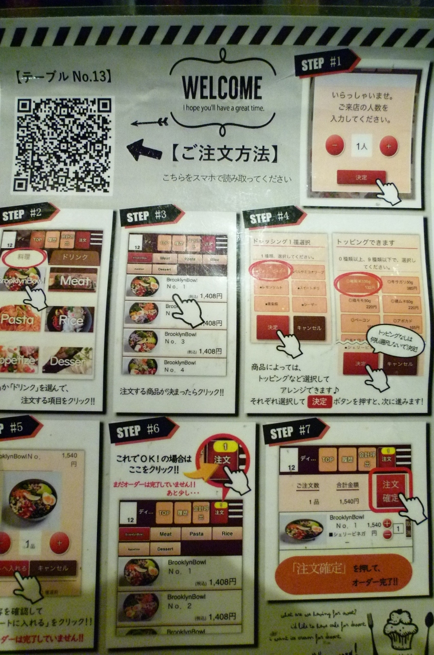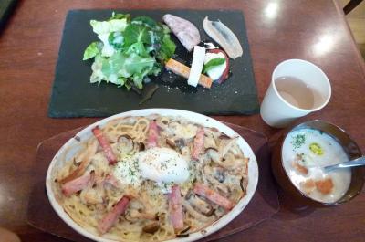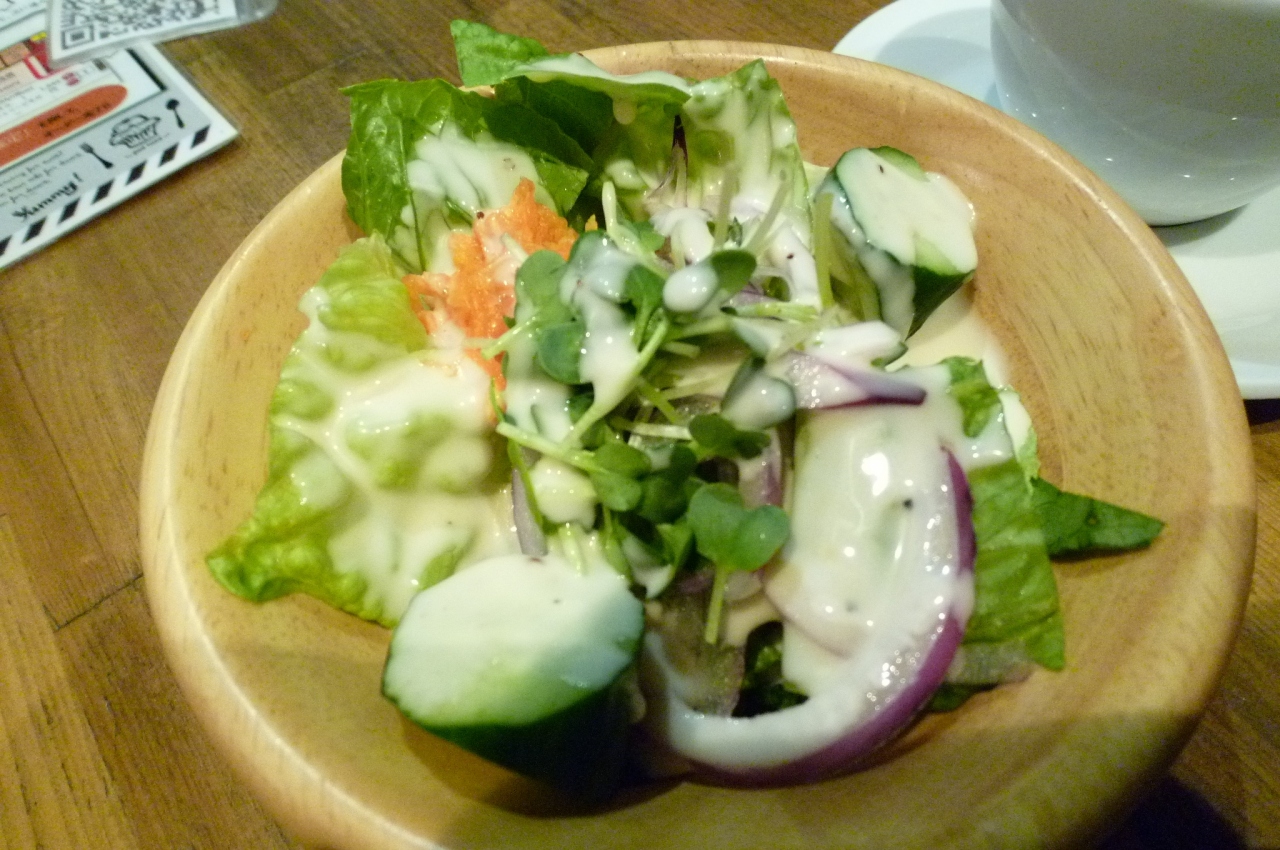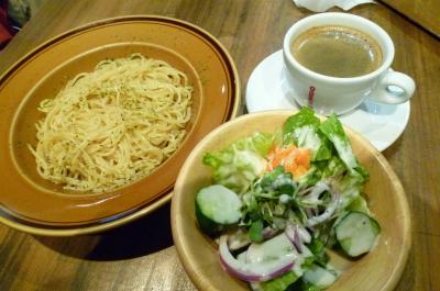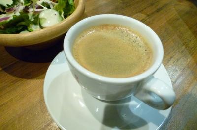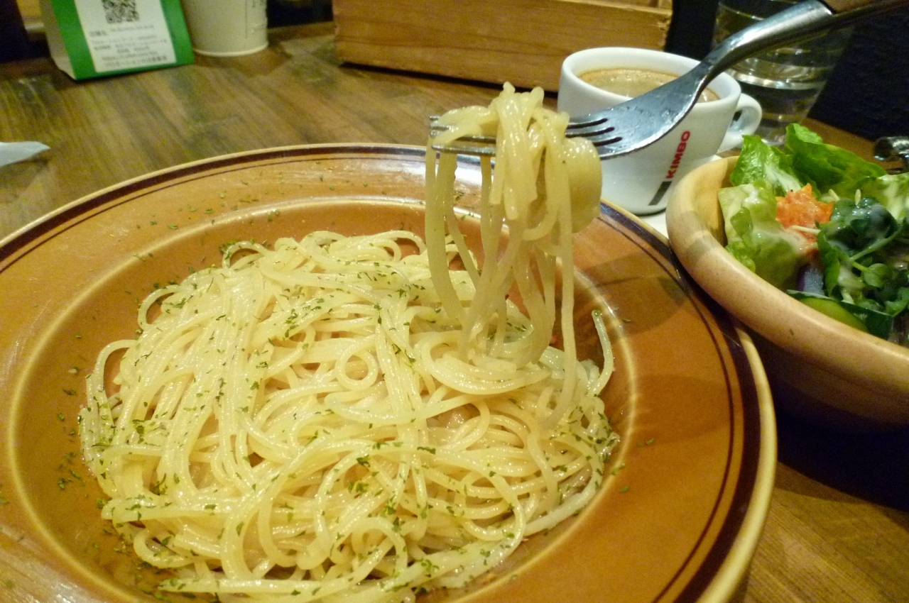 入口にドアがなく一瞬戸惑う。透明シートを開けて入店。店内はBGMヴォーカルが流れ、アメリカ・ダウンタウン風の雰囲気。注文方法が変わっている。携帯でテーブル番号のQRコードを読みこむのだ。オーダーしたのは、平日ランチAセット (サラダ ホットコーヒー)にペペロンチーノをプラス。コーヒーはややスモーキー味で濃いめ。普段濃いめが好みだから、美味しく感じられる。サラダボウルが木製、最近木製が流行しているようだ。野菜が新鮮で、ドレッシングがほどよくかかっている。ペペロンチーノは細麺、ニンニクとオリーブオイルでやや辛めに炒めてある。アッサリとした味で食べやすい。ニューヨークのカフェにいるような雰囲気が気分を心地よくさせてくれる。