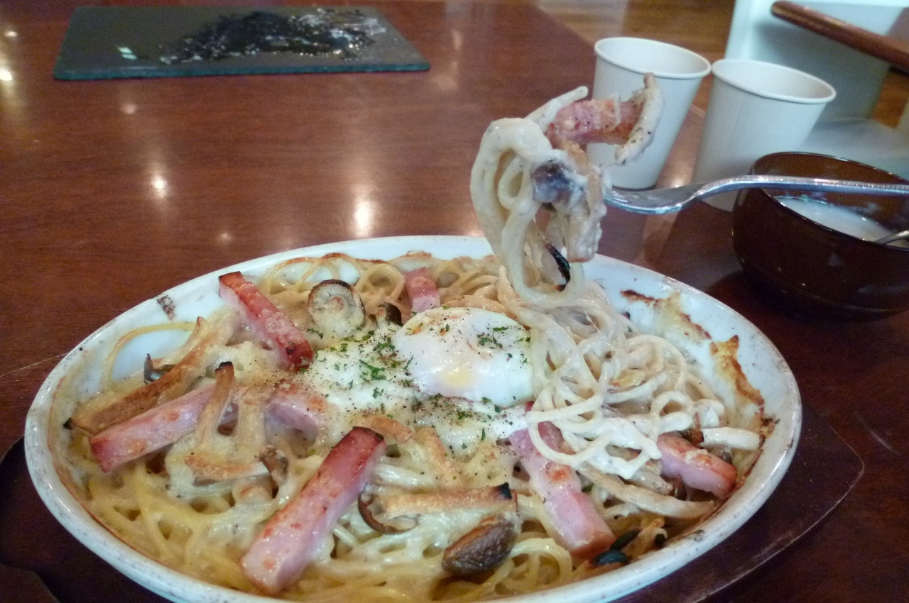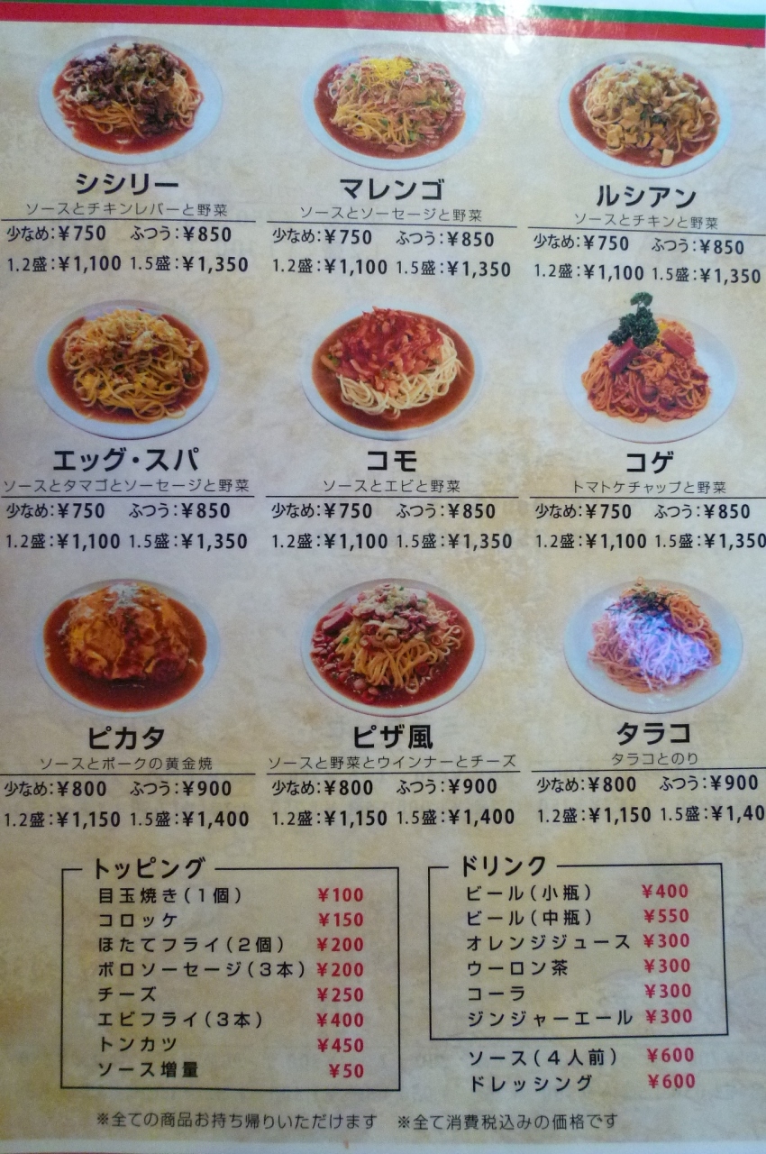 栄スカイルの9階にあるスパゲッティ専門店です。時々、マスコミでも取り上げられるお店です。壁に著名人の色紙や写真がいっぱい。中日ドラゴンズ選手の色紙が多い。置かれてある白い胡蝶蘭がお店の雰囲気をグレードアップしてくれる。テーブル席よりもカウンター席が圧倒的に多い。オーダーしたのはピカタ。ソースとポークの黄金焼、キャベツがメインの野菜サラダ付きだ。普通サイズでもボリュームがある。麺は中太麺でソースが絶妙。玉子焼きはポーク入りだから一層美味しい。スパゲッティとの相性が抜群。メニューを見直すと、何と!プラス料金で二割増しや五割増しまである。あとで店員さんに教えてもらったが、人気メニューはシガツだとか。次回はシガツを食べてみたい。