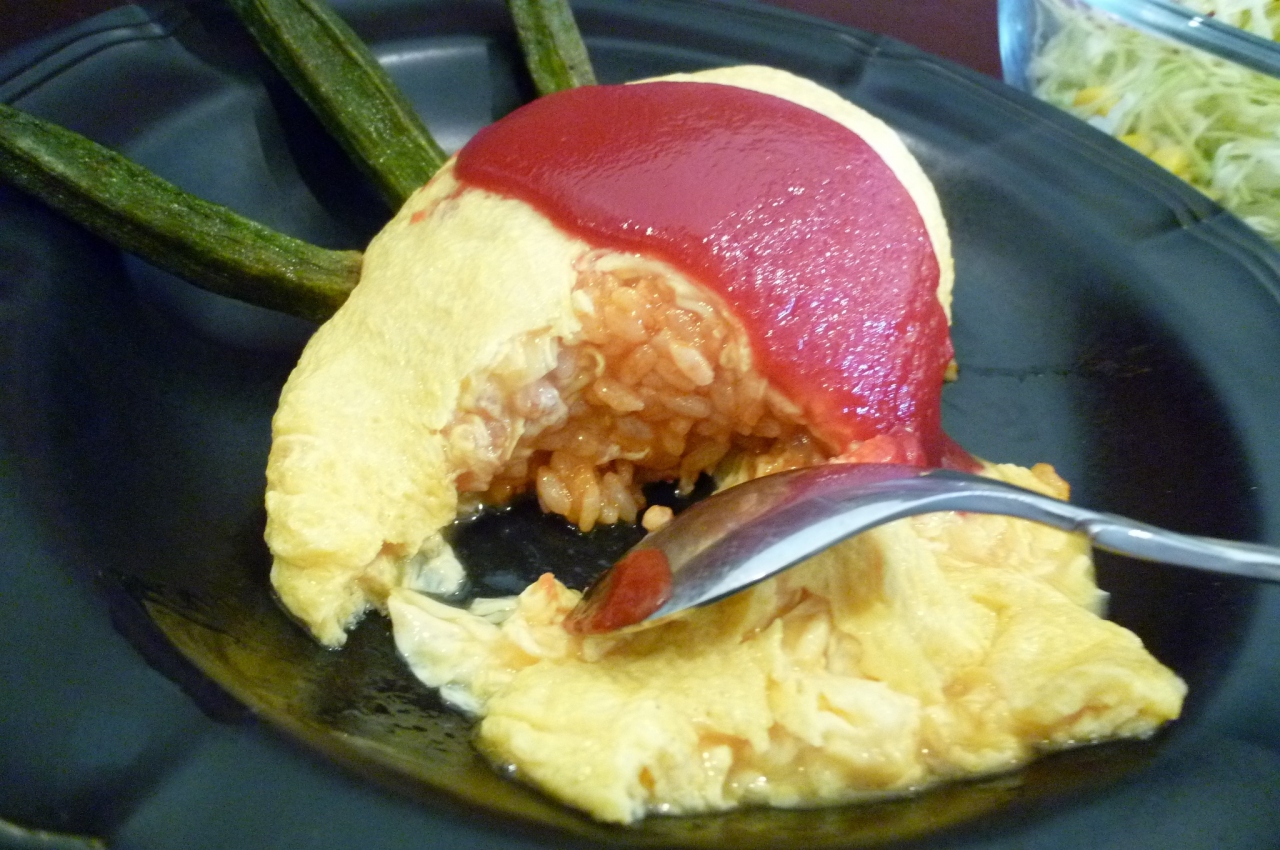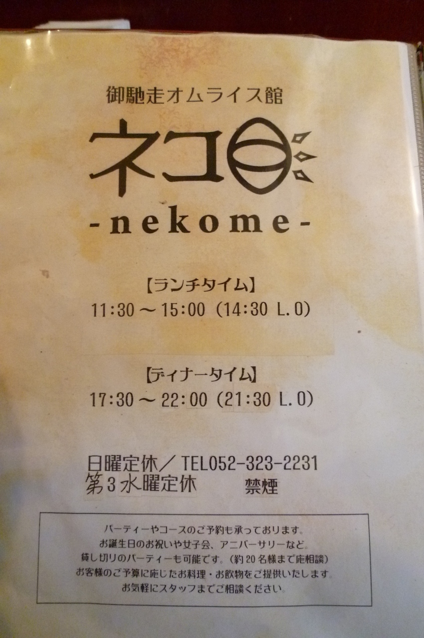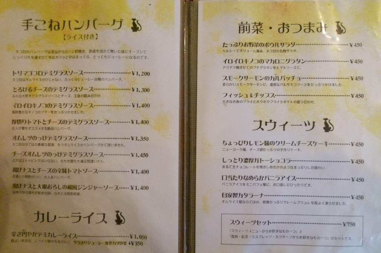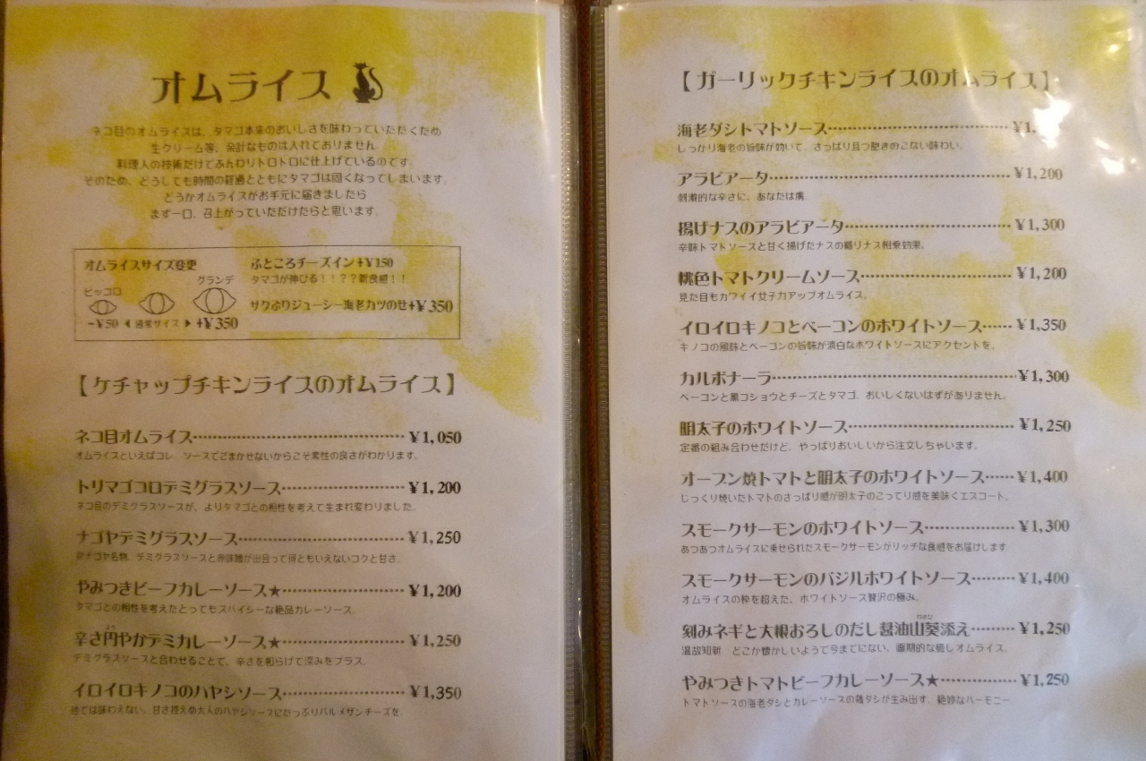 店内至るところ(トイレ内も)にネコのインテリアや絵本•小物などが置いてあります。こじんまりとした店内は四人掛けと二人掛けのテーブルが8席。静かなBGMヴォーカルも流れ、落ち着いて食事が楽しめる雰囲気。客層は若い女性がメインだ。オーダーしたのはネコ目オムライス、野菜サラダ付き。ケチャップチキンライスが入ったふわトロのオムライス。オムライスはネコの目、オクラがまつ毛を表現している。面白い。見た目だけでなく、オムライスはとても美味しい。テーブルサービスのレベルが高く、食器の片付けのタイミングもいい。支払いは現金のみ。退店時はドアを開けていただき、お店の外まで見送りも。恐縮しました。