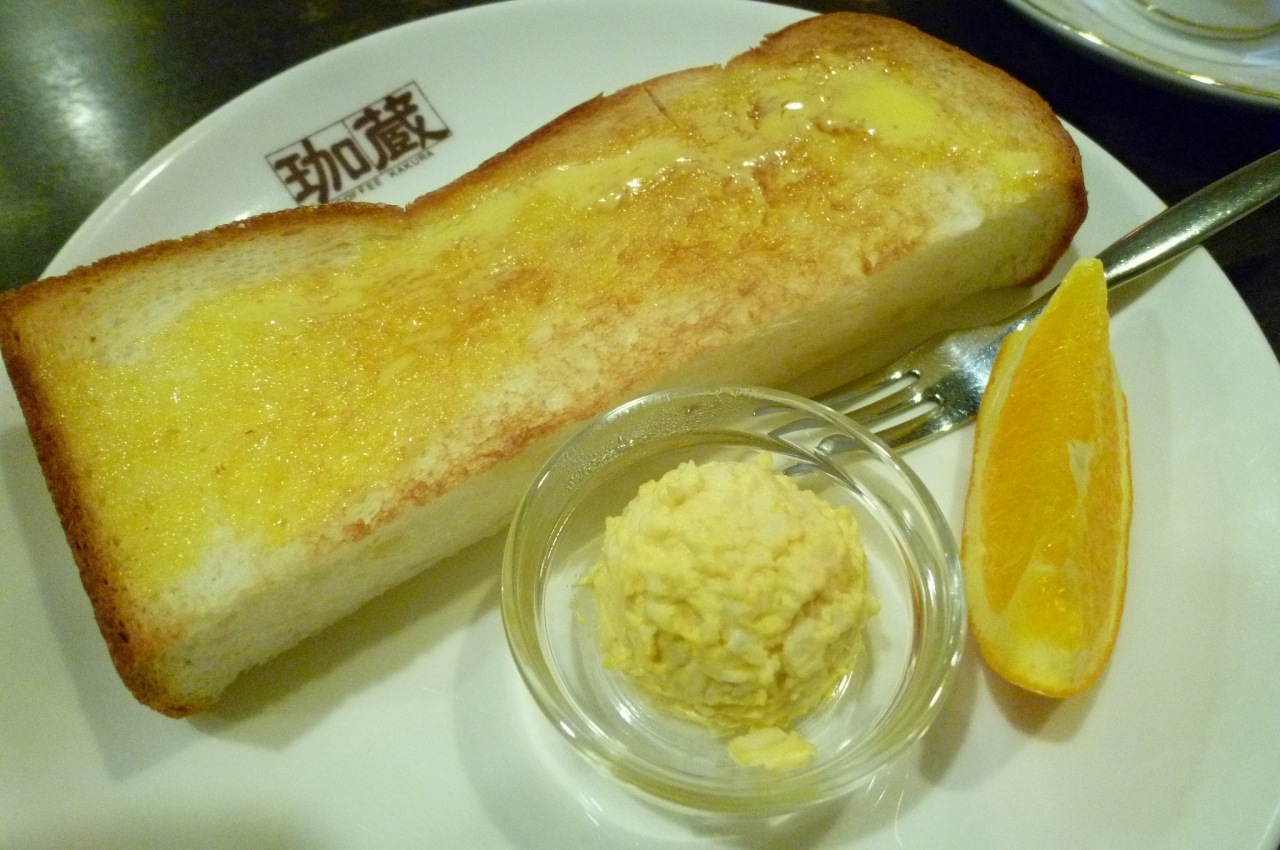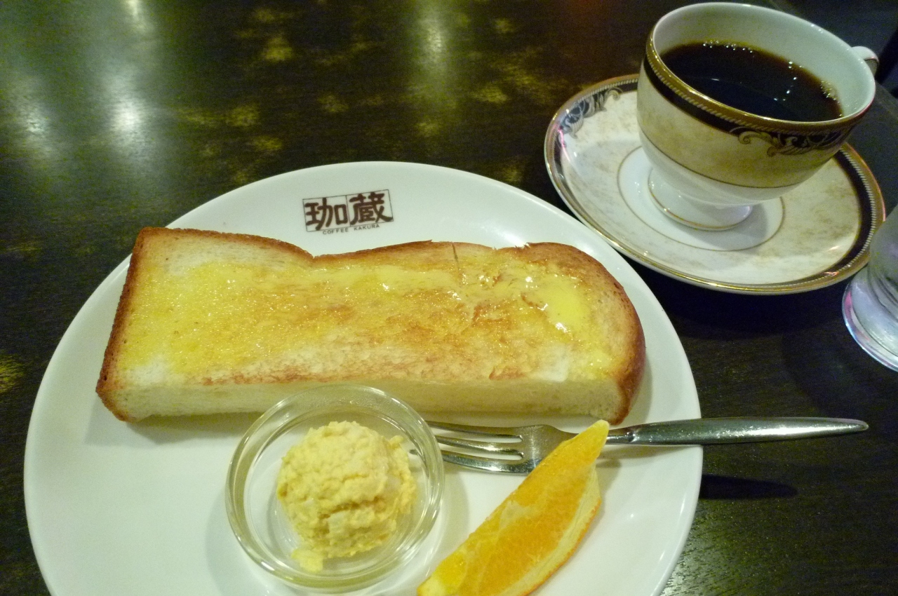 久々に2回目の入店。オーダーしたのはスタンダードモーニング。ドリンク料金のみ。イギリス食パンはもっちりしていて、こんがりと焼き上げてあります。本日のコーヒーはキリマンジャロ。苦味とコクあり。店内は床・調度品ともダーク調。壁・天井はクリーム色。落ち着いた雰囲気だ。人気のある喫茶店でお客は多いが、午後1時を過ぎる頃には半分ほどの空きがでる。ゆったりしたいなら、平日の午後がおすすめ。