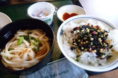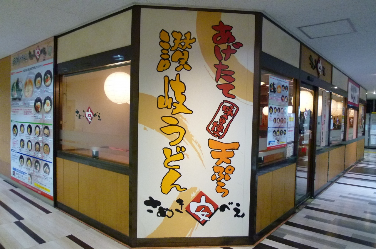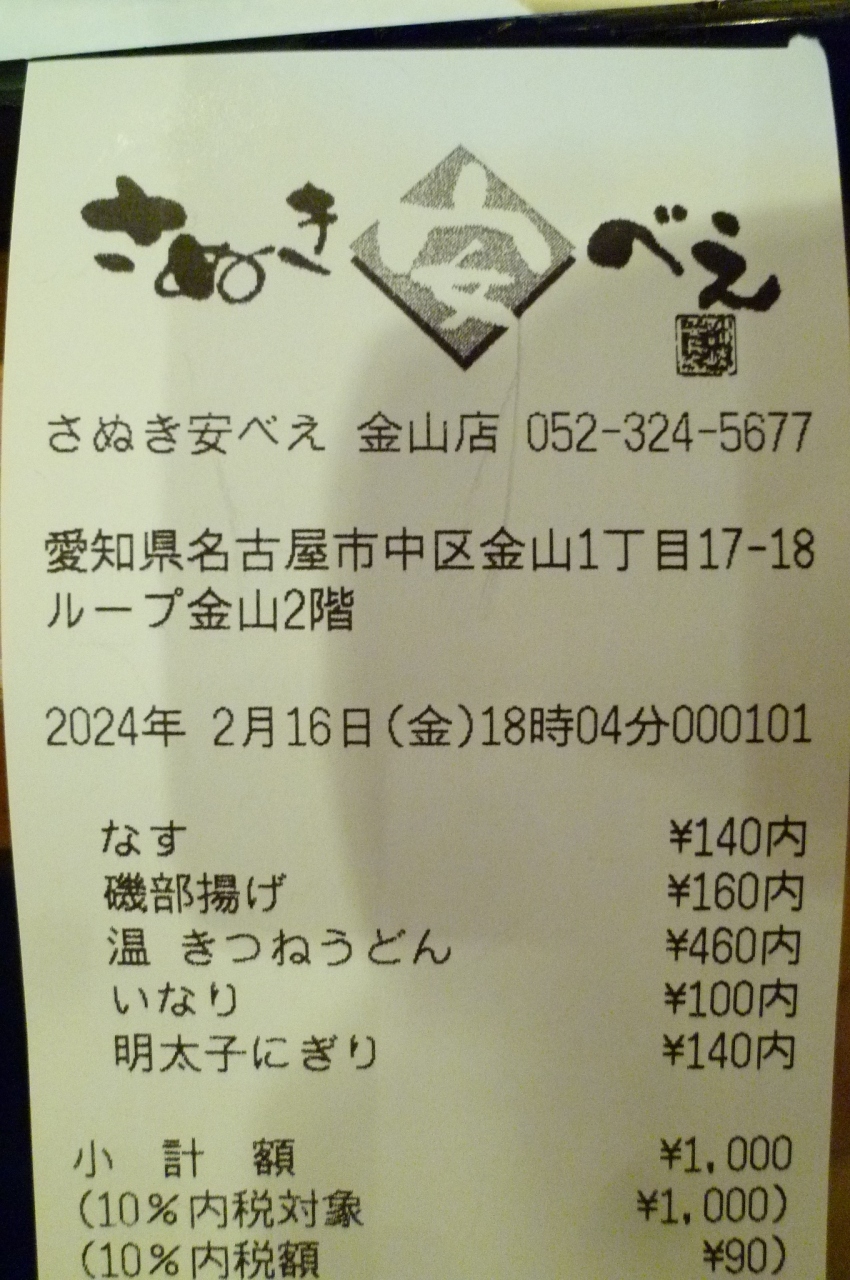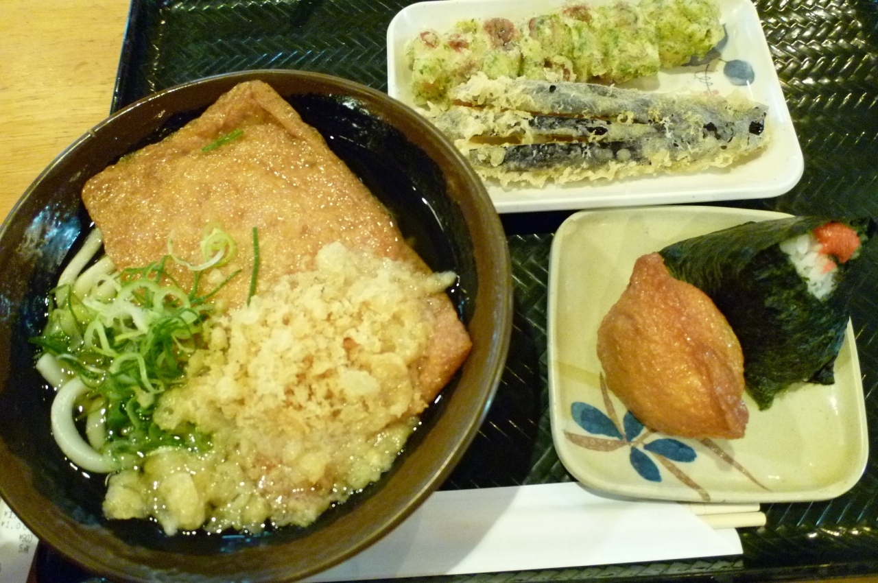 金山駅構内2階にあるセルフ式のうどん店。チャンポンの店が営業していないようなので、金山へ戻ってこちらのお店に。きつねうどんになす天と磯辺揚げ、明太子おにぎりといなりも追加。うどんは中太、出汁がうまい。アゲもいい味だ。天ぷらをうどんにのせると味もアップ。おにぎりといなりはコンビニのより5割増。ボリュームがあって味もすこぶるいい。気楽にうどんを食べられるお店だ。