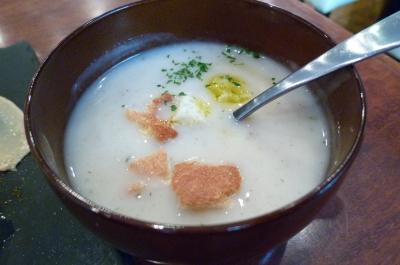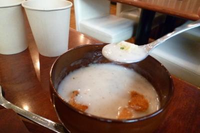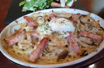 お店は二階、一階歩道側からは目立つ看板がないので隠れ家的存在かも。意外と店内は広い。椅子・テーブルなどの調度品はシックな感じで落ち着いた雰囲気だ。正午にはお客が増えるが、混雑するほどではない。オーダーしたのは、ベーコンとキノコのトリュフクリームの焼きパスタ温玉添えにランチAセット。焼きパスタはグラタン風でトリュフの香りが鼻をくすぐる。スープはクラムチャウダーでとても美味しい。少し高級感があって、ゆったりとした席で食事が楽しめる。都会の喧騒を忘れてしまうようなランチタイムでした。