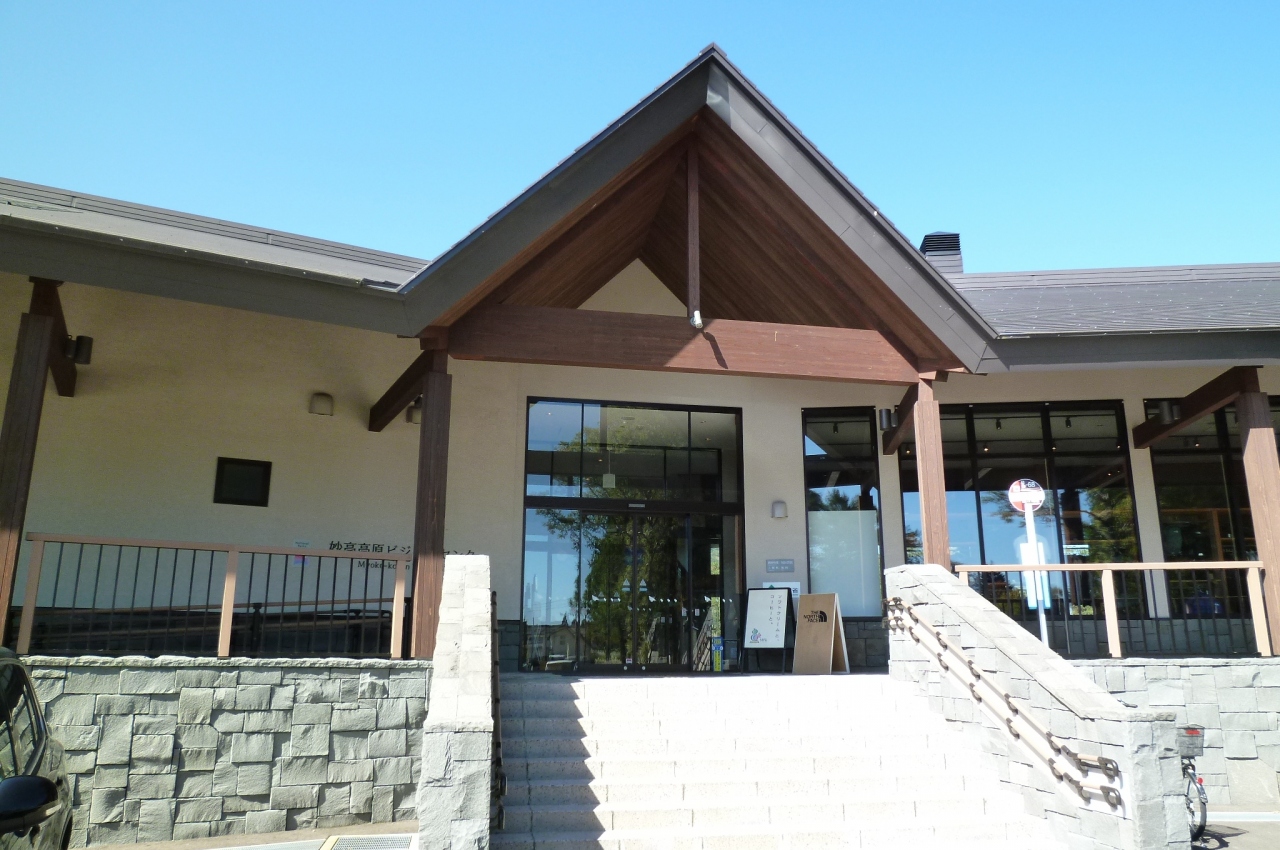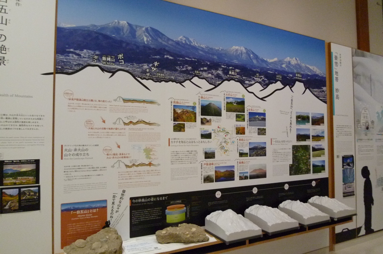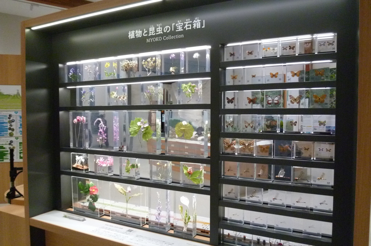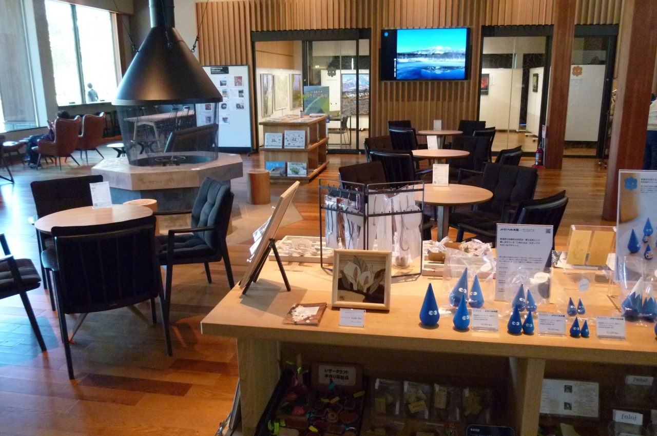 センター内はお土産などのショップと写真展示スペース、妙高山をバックにいもり池が見渡せるラウンジ、展示室となっています。ラウンジと外にあるテラスからの眺めは絶景そのもの。展示室は最近新設されて、中はミニ博物館のよう。妙高の自然、動植物、地理、など、わかりやすく工夫された展示がいっぱいです。オコジョやテン、キツネなどの動物のはく製がユーモアたっぷりに出迎えてくれます。無料で入室できるのも嬉しい。