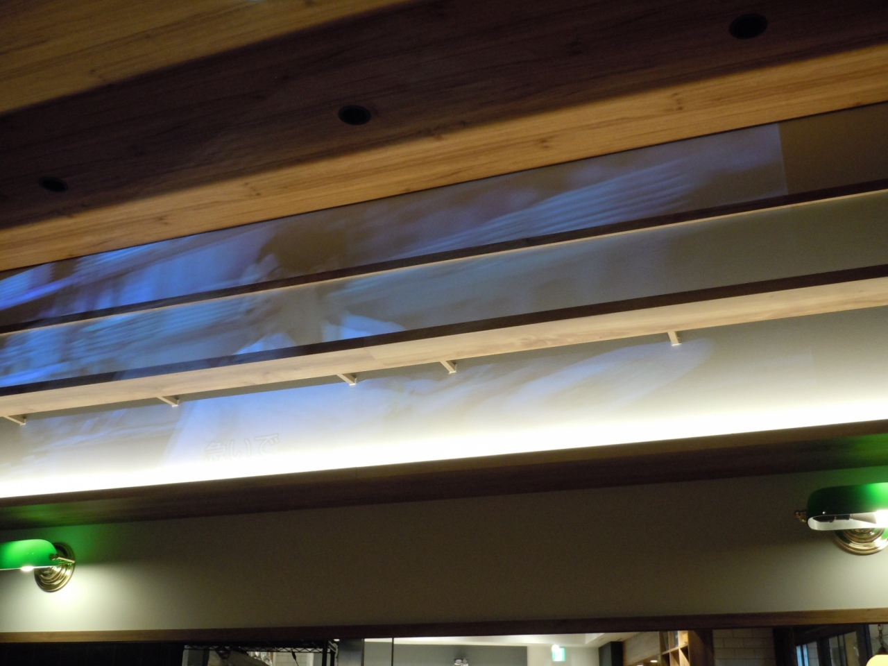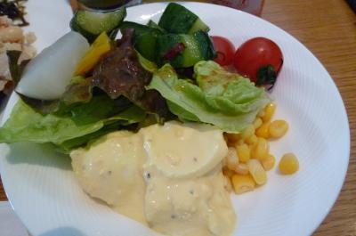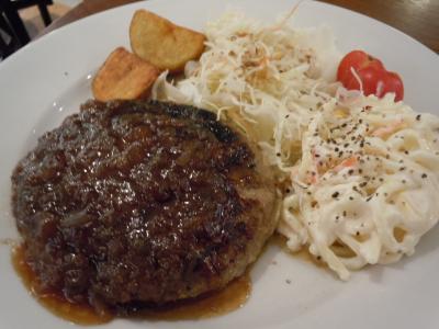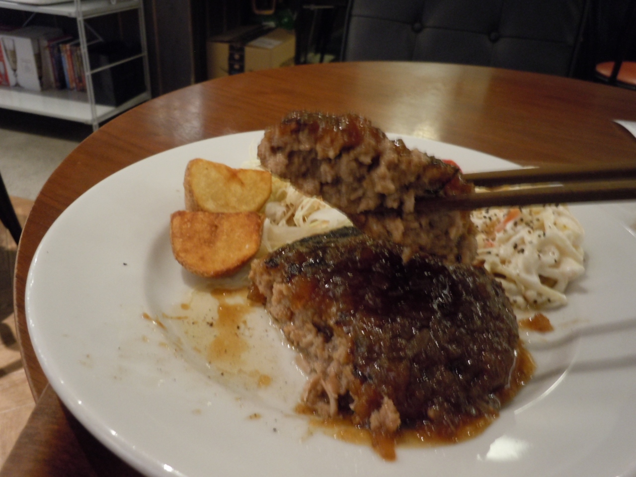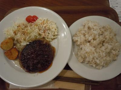 大名古屋ビルヂング地下一階の大名古屋ダイニングにあるカフェ。左側スペースはパン・調味料などのグローサリー販売、右半分が飲食スペース。午後2時前に入店。この時間は比較的空いている。おしゃれで少しレトロ的な雰囲気。プロジェクターでDVDムービーを壁に投影。オーダーしたのはランチセット。ハンバーグとライス、ジャスミンティー。ハンバーグは見た目より柔らかめ仕立てで、肉の旨味がいっぱいだ。ご飯は柔らかめ、玄米入りで実に健康的。ジャスミンティーも飲めてこのお値段はコスパ高。