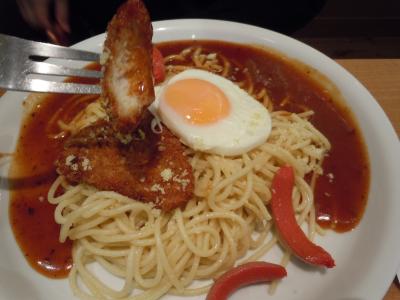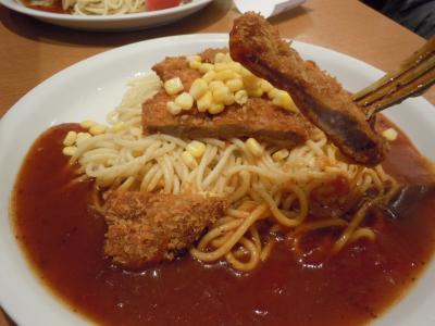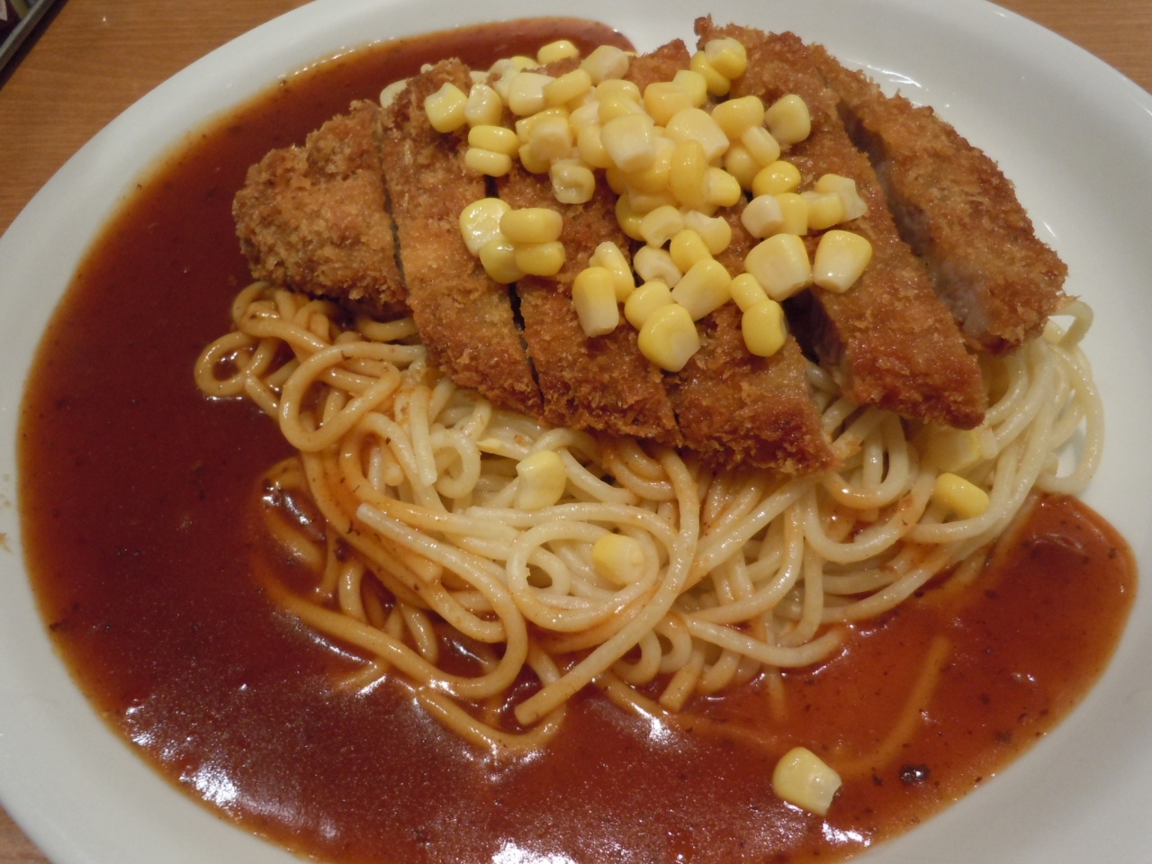 ランチタイム時は並んでいるお客が10人ほど。お客の回転が早いようだ。オーダーしたのはコートレット(レギュラーサイズ)\1100税込。ポークカツレツ・コーンがのっている。麺はやや硬めだが、そばのようにコシがあるように感じられる。たっぷりかかったソースはほんの少し辛めで、スパゲッティとの相性がいい。ポークがやや薄めにカットされたカツレツは、とんかつと違って噛み応えがいい。脂身が適度に加わっていて、カツレツの旨味にバランスよくプラスしている。次回は、家内が食べたバイキング(白身魚フライ・ウインナー・目玉焼きがトッピング)を食べてみようかな。