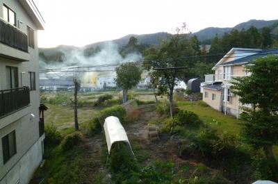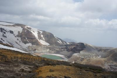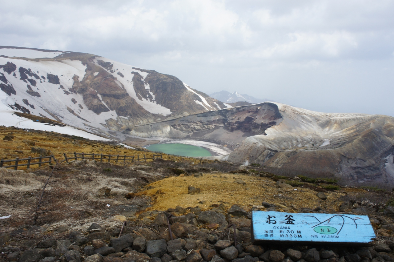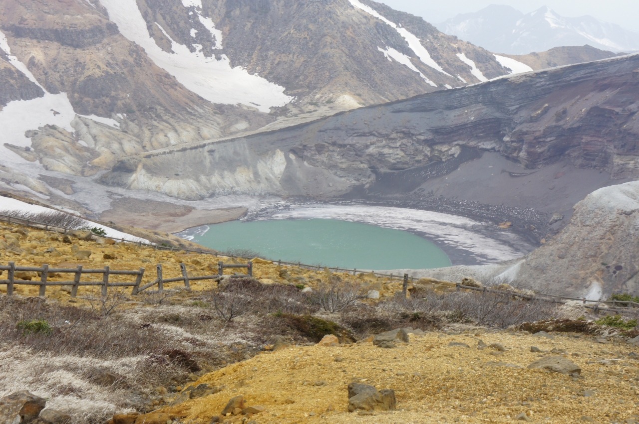 前日に寒冷前線が通り過ぎて、この日は山頂までのエコーラインに入ると、風が急に強くなりました。駐車場に到着した時には、台風並みの暴風が吹き荒れていました。呼吸はしにくく、目が開けにくい、体があちこちに持っていかれたりで、展望台までやっとの思いで着けました。でも、カメラを持った手が暴風で安定しないので、撮影には苦労しました。緑色のお釜がほんの少しだけ見られただけでもよかったと思いました。今度来るときは、穏やかな天気の日を選んで来ようと実感しました。