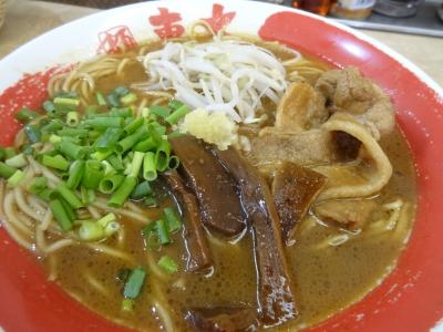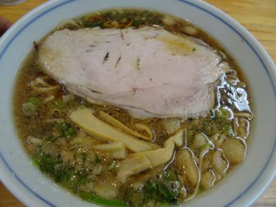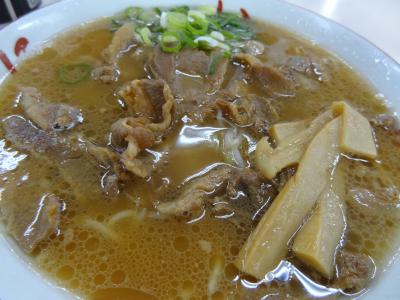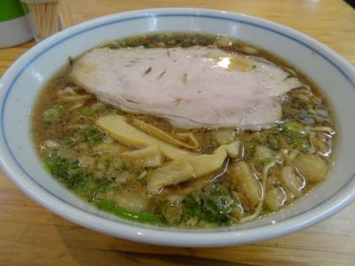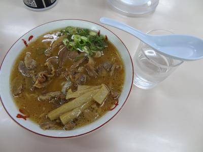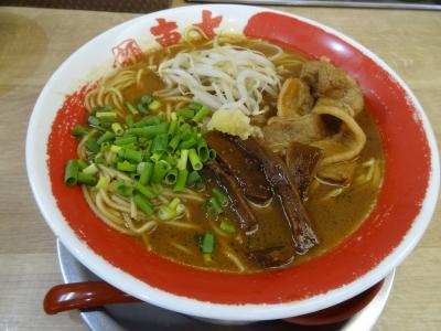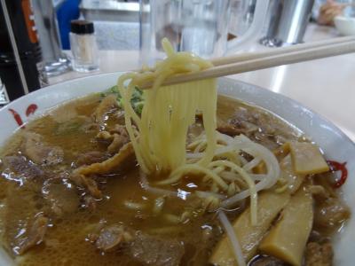 四国の観光旅行でこの徳島市にある、徳島ラーメン発祥の店と言われる、このお店に立ち寄りました。駐車場がお店の前だけで車を停められるかどうか気にしていたが、何と、お店の左側にも交差点の斜め向かいにもあり余裕をもって停められました。お店の入り口には赤く細長い暖簾がかかっています。ドアーを開けたら、もう満員状態、スッゴイ!テーブル席は一切なく、カウンター席が二か所、ほぼ口の字型。食券を券売機で購入。中華そば 肉入り大盛り700円をオーダー。徳島の人はラーメンとご飯を一緒に食べるとか。名古屋ではそういう習慣はないのでラーメンだけ。カウンターテーブルに中華そばが運ばれ、次に水が入ったコップの上に、何と蓮華を乗せてくれた。えっ!?と言葉が出そう。このお店ではこれが普通らしい。胡椒は高さ15cmはあろうかと言える業務用の缶に。麺は中太のやや平た目。スープは茶系。メンマはやや長めが3本。味付けされた肉がたっぷり。刻みネギが薬味としてのっかっている。さすが、徳島ラーメン。麺と味付け肉とスープとのバランスがよく、それぞれの持ち味がくっきり出て味わい深い。納得の味にスープまで飲み干してしまった。四国へまた来たら、このお店で中華そばを食べてみたい。