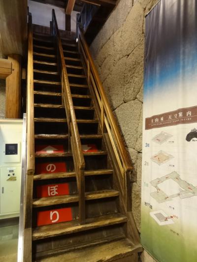 リフトを利用して天守閣の広場へやってきました。ここにはベンチも設置されていて、360度広がる松山市の市街地を一望できます。天守閣に登るにはまだ時間があったので、ベンチに座って休憩。お弁当があればピクニック気分で景色も食事も楽しめます。天守閣の中は意外と広く、上の階に上がるには急な木造階段を利用するしかないです。よろいや