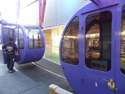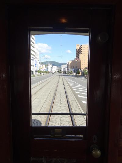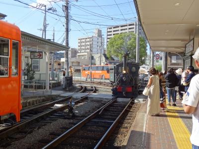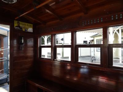 記念碑の前で坊ちゃん列車が展示されています。と、思いきや、展示専用車両でなく、実際に路面を走るとは意外や意外。引込み線までバックしてホームへやってきました。客車は二両。それもマッチ箱のようなかわいいサイズ。最後尾の客車に乗車。ベンチはクッションがなく木そのもの。車掌さんが連結部に立っていて、次の駅名を案内してくれます。平日だと運行本数が減るので注意が必要です。乗車料金は800円と高め。でも、乗車してみる価値は十分にあります。