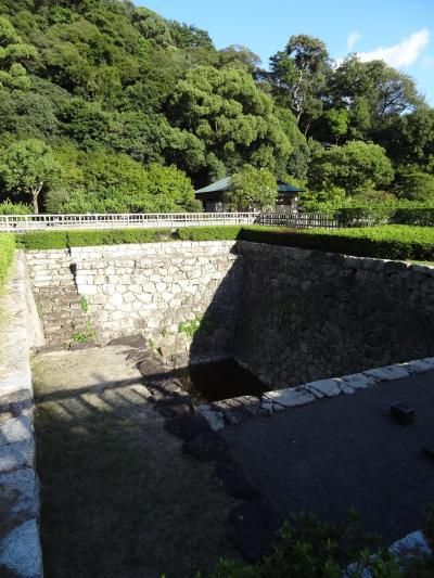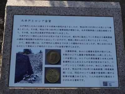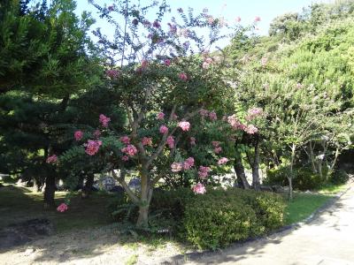 二の丸庭園を初めて訪れました。園内では百日紅などの花が咲き誇り、赤とんぼが池の石の上で一休みしていました。お茶会などのイベントができる建物がいくつか建っていました。思っていた以上に園内は広く、松山城の勇壮な天守を間近に見上げることもできました。大井戸とロシア金貨にまつわる碑石が立っていて、興味を持って説明文を読ませてもらいました。昔のロシア兵と日本の看護師とのロマンスについて触れていました。羨ましいお話です。