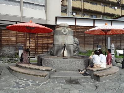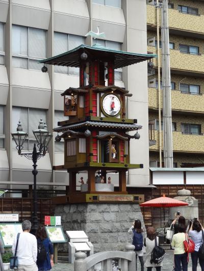 坊ちゃん列車を撮影し終わり、何やら賑やかなメロディーがどこからか聞こえてきました。振り返ると、からくり時計の前には人だかり。時間を見ると午後一時ちょうど。どうやら毎正時にからくりが始まるらしい。一見すると、時計らしくない。お神輿のような感じがします。上のほうに伸びていくと思ったら、中段当たりの扉が開き、中から人形が躍り出ます。いやはや、賑やかそのものです。道後温泉に似合っているかどうかは観光客の判断にお任せします。
