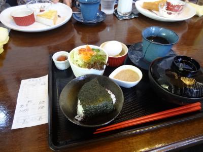 娘と家内を連れて、モーニングで人気のあるこの喫茶店で朝食を取りました。駐車場は十数台停められます。店内はこの時期らしくハロウィーンの飾り付け。お米をレジ横で販売しているのにはビックリ!左奥には希少価値の高いアップライトピアノが据え付けてありました。壁に飾ってある絵やシーリングライトなどのインテリアはお店の雰囲気にピッタリ!メニューは数えきれないくらい多いです。私は事前にネットで見て気に入っていたあさがおモーニング、娘と家内はレギュラーモーニングなどをオーダー。レギュラーモーニングは三角トーストや玉子などでモーニングとしては定番中の定番。あさがおモーニングはモーニングとしては珍しい和食。おにぎりと野菜サラダ(胡麻ドレッシングソース付き)、ゆで卵、赤味噌汁(名古屋では当たり前)、梅干し、もちろんホットコーヒーのモーニングセット。私好みの胡麻ドレッシングをかけていただく野菜サラダは新鮮そのもの。おにぎりは店内手製のおにぎりなので、なぜか温かみのあるような感じさえします。500円台で和食モーニングが食べられるのはお得感バッチリ!娘や家内もとても満足してくれてよかったです。今度はランチを食べにまた来ようかな。