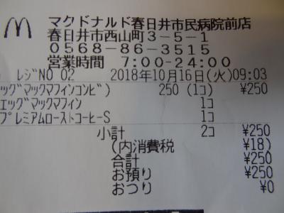 春日井市民病院に用事があり、お目当てのモーニングの喫茶店が閉店のため、近くにあるこのお店を利用しました。朝マックの二種類のうち、エッグマックマフィンのコンビ(ホットコーヒー)をオーダー。エッグサンドはコンビニで買ってよく食べるが、ハンバーガーは久しぶり。エッグ・ハム・チーズがほどよく入ったハンバーガーは思ったよりはいい味。セットのホットコーヒーとの相性もよく、これで250円はかなりリーズナブル。店内はそれほどお客で混雑することなく、ゆったりできる雰囲気のお店でした。手軽に安く朝食を済ませるにはぴったりです。