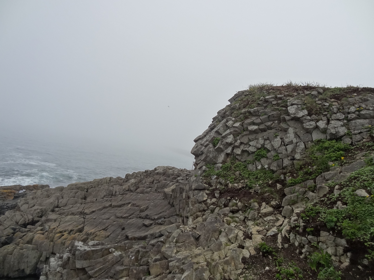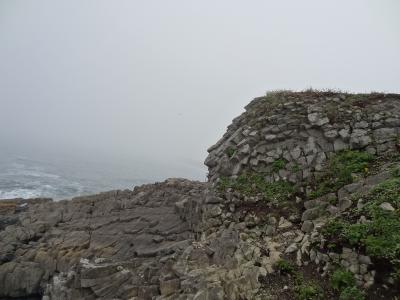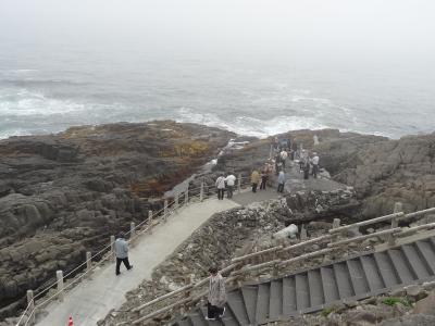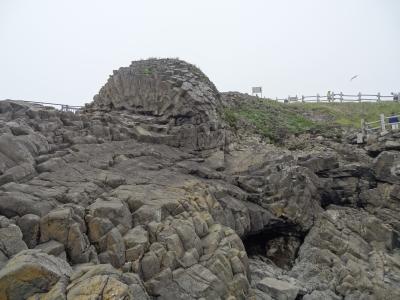 駐車場から岬の見どころまで徒歩2分ほど。箱型の小さな灯台を右手に見ながら歩いて行くと、下にまで伸びる遊歩道が海近くまで続いています。周りは、柱状節理の岩肌がグニャっと曲がって車輪のようになっています。これが国の天然記念物「根室車石」です。実に見事です。海面近くまで来ると、波が打ち付けて下の岩が滑りやすくなります。柵がありますが、足元には十分注意しなければなりません。この岬では海の景色よりも岩の凄さに圧倒されます。