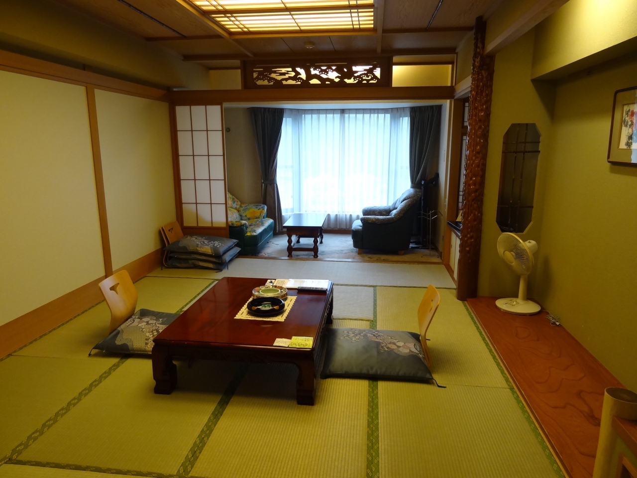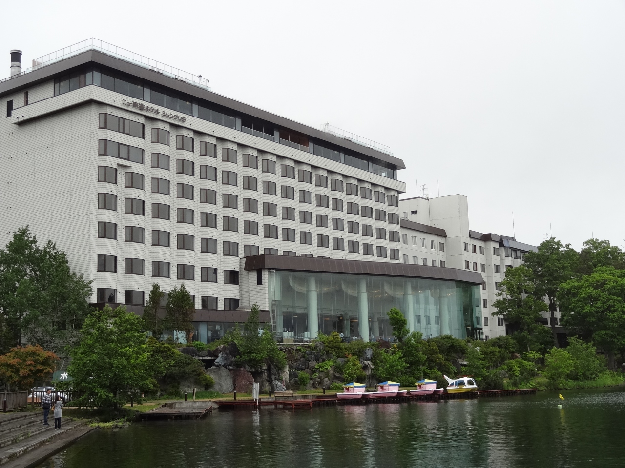 北側に阿寒湖を望める大型観光ホテルです。徒歩7分ほどでアイヌコタンまで行ける立地がいいです。ツアーで8階の和室に一泊。畳がきれいなのは良かったです。部屋の風呂は普通のビジネスホテル並みのユニット式。扇風機があるのはいいが古さを感じます。加湿空気清浄機を部屋に備えて欲しいです。南向きの部屋のため、出窓風の窓からの眺望は町並みが見える程度。9階にある大浴場を利用。脱衣場のロッカーは二段になっていて、防犯のためか低めになっています。窓ガラスが大きい内湯に上の部分が何もない半露天風呂になっています。夕食・朝食とも、一階にあるレイクビューのレストランで。和洋中のブッフェ式でメニューの種類は多いほう。北海道らしい食材を扱った料理が並んでいました。料理の味はまずまずと言ったところ。翌朝、ツアーのバスでホテルを出発する際、ホテルの従業員は誰一人の見送りもなかったのが残念。阿寒湖のホテルにしてはアカンですね(苦笑)。評価の星を一つマイナスにさせてもらいました。