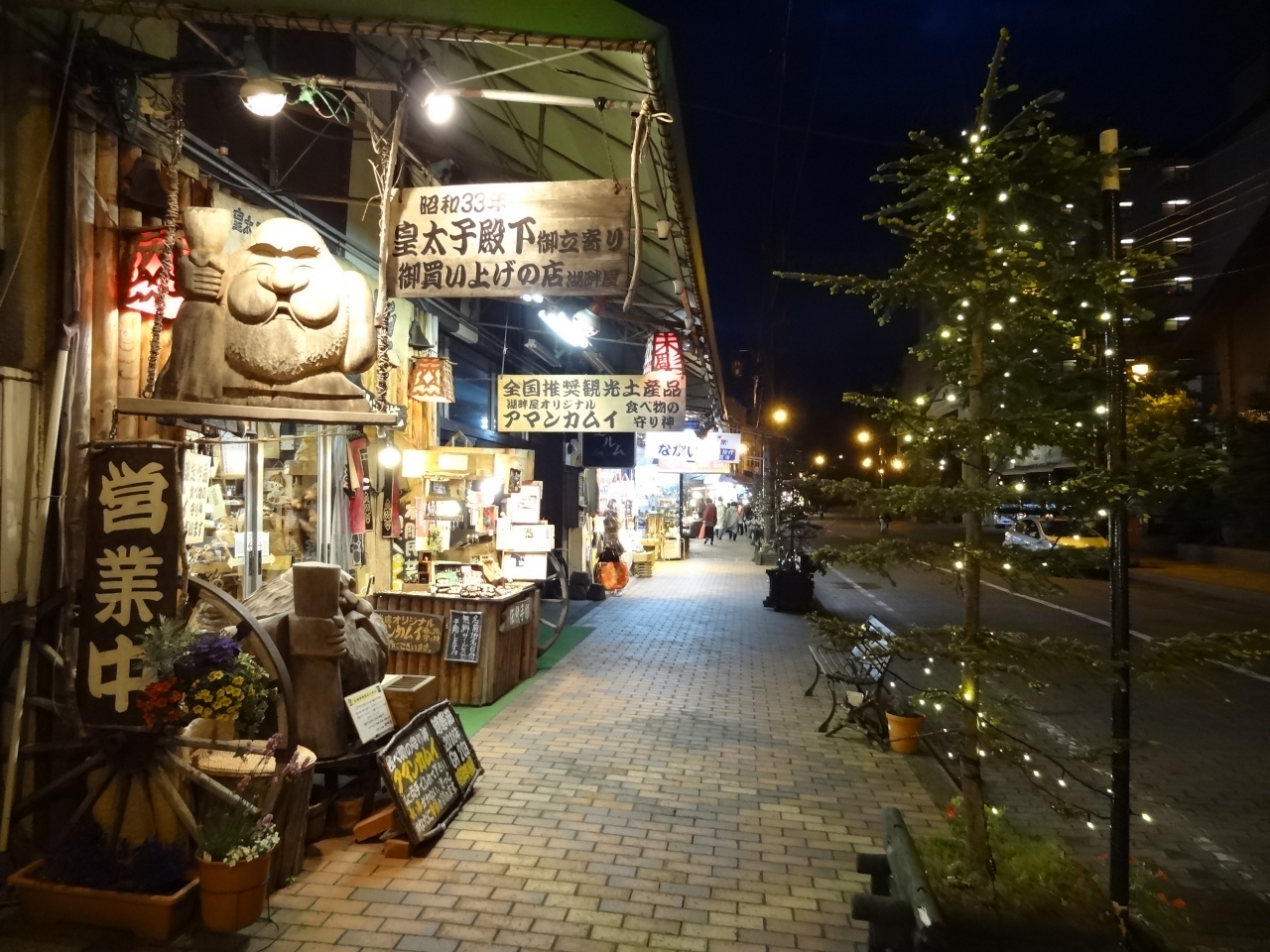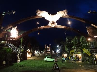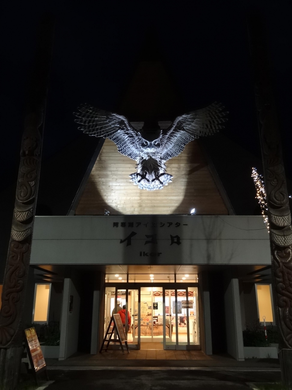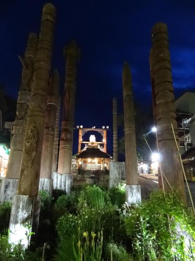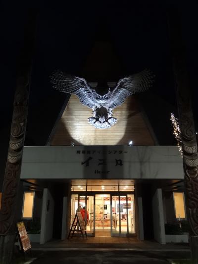 アイヌコタンに午後7時過ぎに出かけました。入口までの歩道沿いに並ぶお土産店は、この時間でも多くの観光客が出入りして賑やかです。中には「皇太子殿下お立ち寄り・お買い上げの店」と書かれた看板が出ているお土産店まであります。さらに歩いていくと、緩い上り坂の広場に出ます。頭上にはカーブした門の中央に、ライトアップされて浮かび上がるシマフクロウのオブジェが羽を広げて歓迎しています。広場の両側にも10軒ほどのお土産店が並んでいます。広場の中央には、エスキモーのトーテンポールによく似た柱が何本も立っていて見事です。広場の右奥にあるアイヌ古式舞踊のシアターではイオマンテの火踊りを実演していました。広場の左奥には、アイヌが実際に生活していた住居が復元されていて中に入れる住居もあります。昼間の明るい時間もいいですが、夜のライトアップされたアイヌコタンもオブジェや展示物が強調されてインパクトがあります。