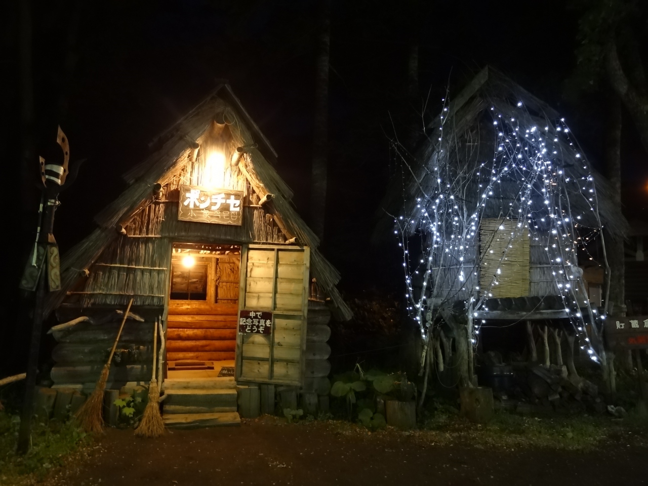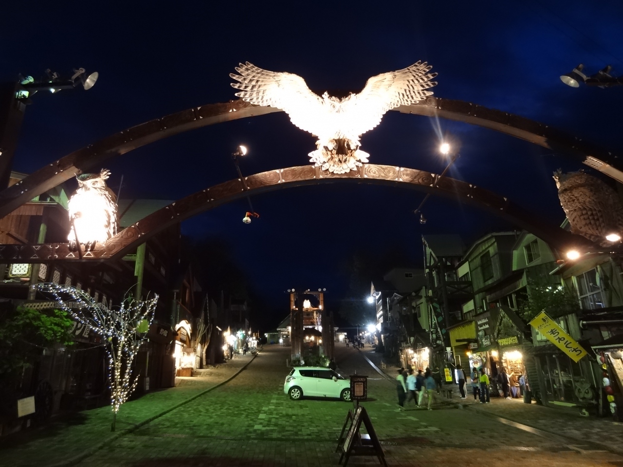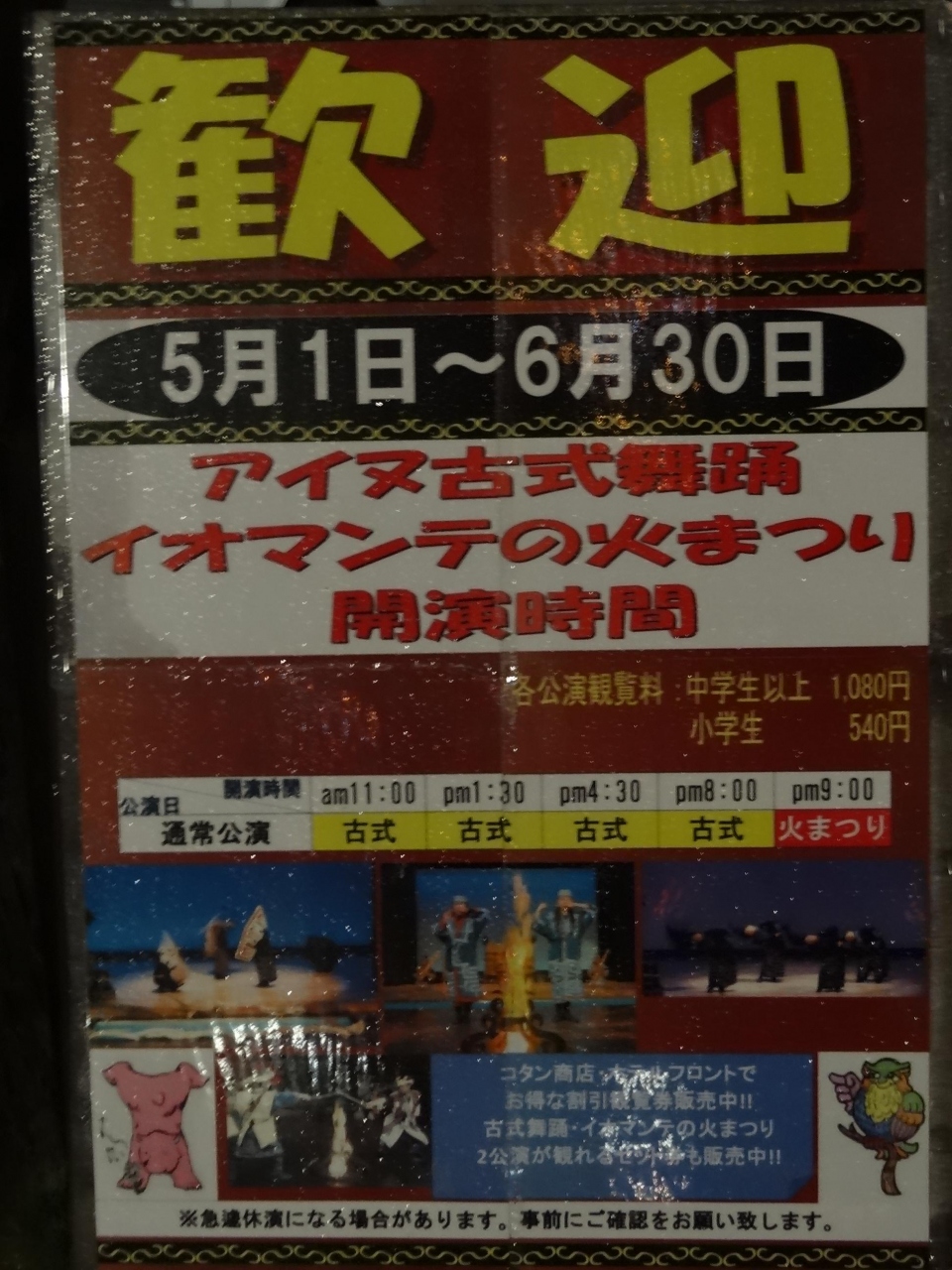 アイヌコタンに午後7時過ぎに出かけました。入口までの歩道沿いに並ぶお土産店は、この時間でも多くの観光客が出入りして賑やかです。中には「皇太子殿下お立ち寄り・お買い上げの店」と書かれた看板が出ているお土産店まであります。さらに歩いていくと、緩い上り坂の広場に出ます。頭上にはカーブした門の中央に、ライトアップされて浮かび上がるシマフクロウのオブジェが羽を広げて歓迎しています。広場の両側にも10軒ほどのお土産店が並んでいます。広場の中央には、エスキモーのトーテンポールによく似た柱が何本も立っていて見事です。広場の右奥にあるアイヌ古式舞踊のシアターではイオマンテの火踊りを実演していました。広場の左奥には、アイヌが実際に生活していた住居が復元されていて中に入れる住居もあります。昼間の明るい時間もいいですが、夜のライトアップされたアイヌコタンもオブジェや展示物が強調されてインパクトがあります。
