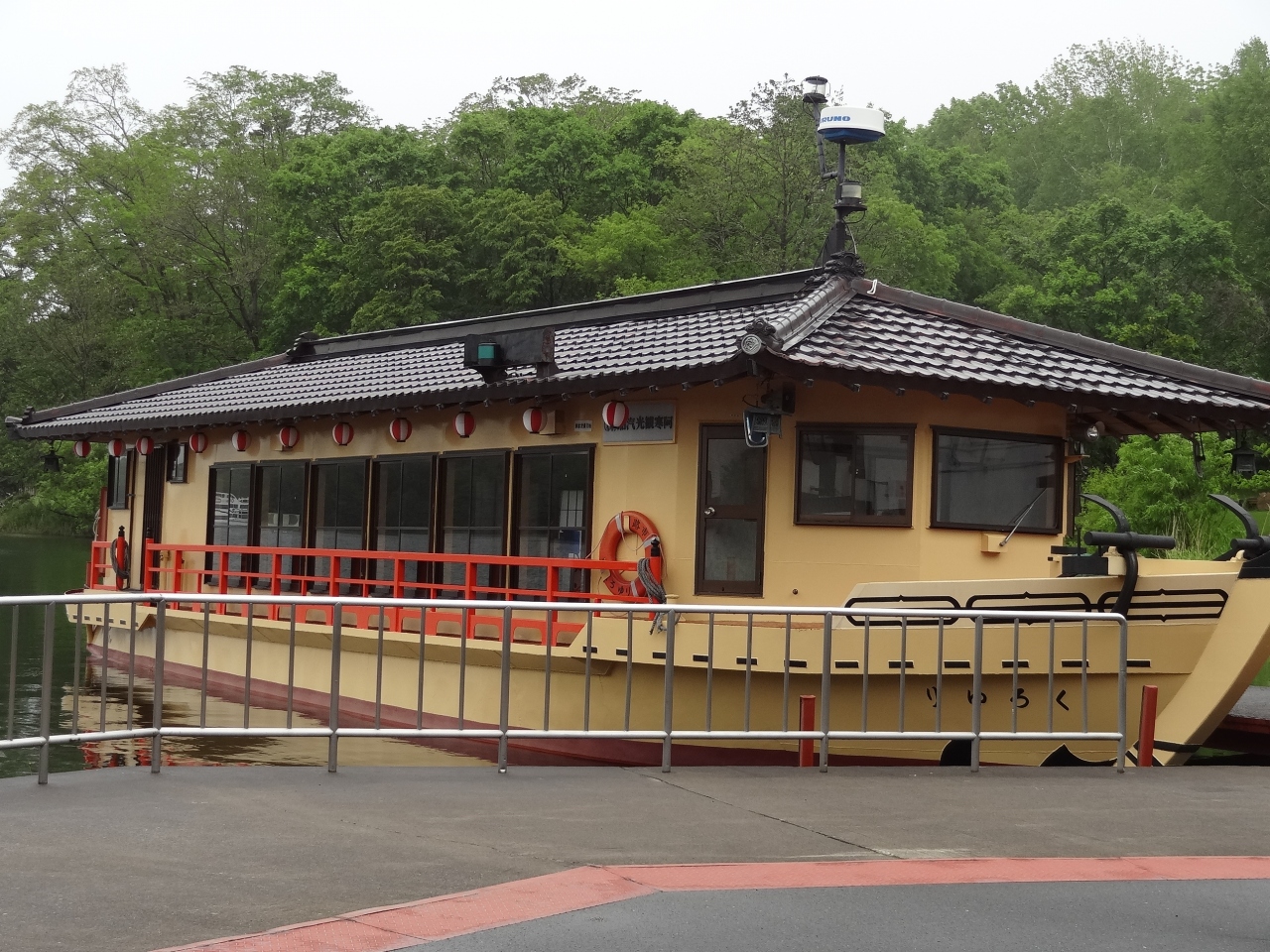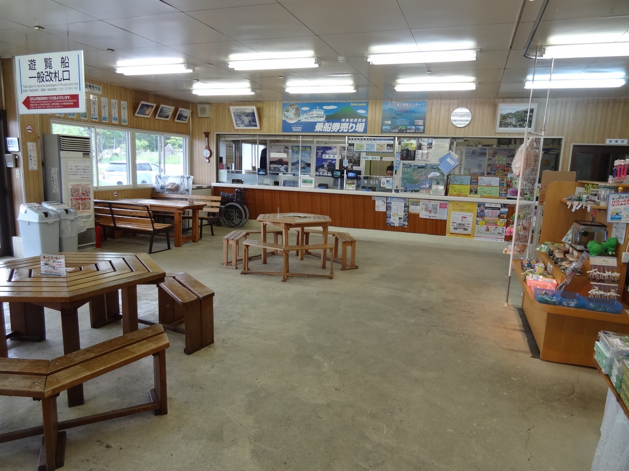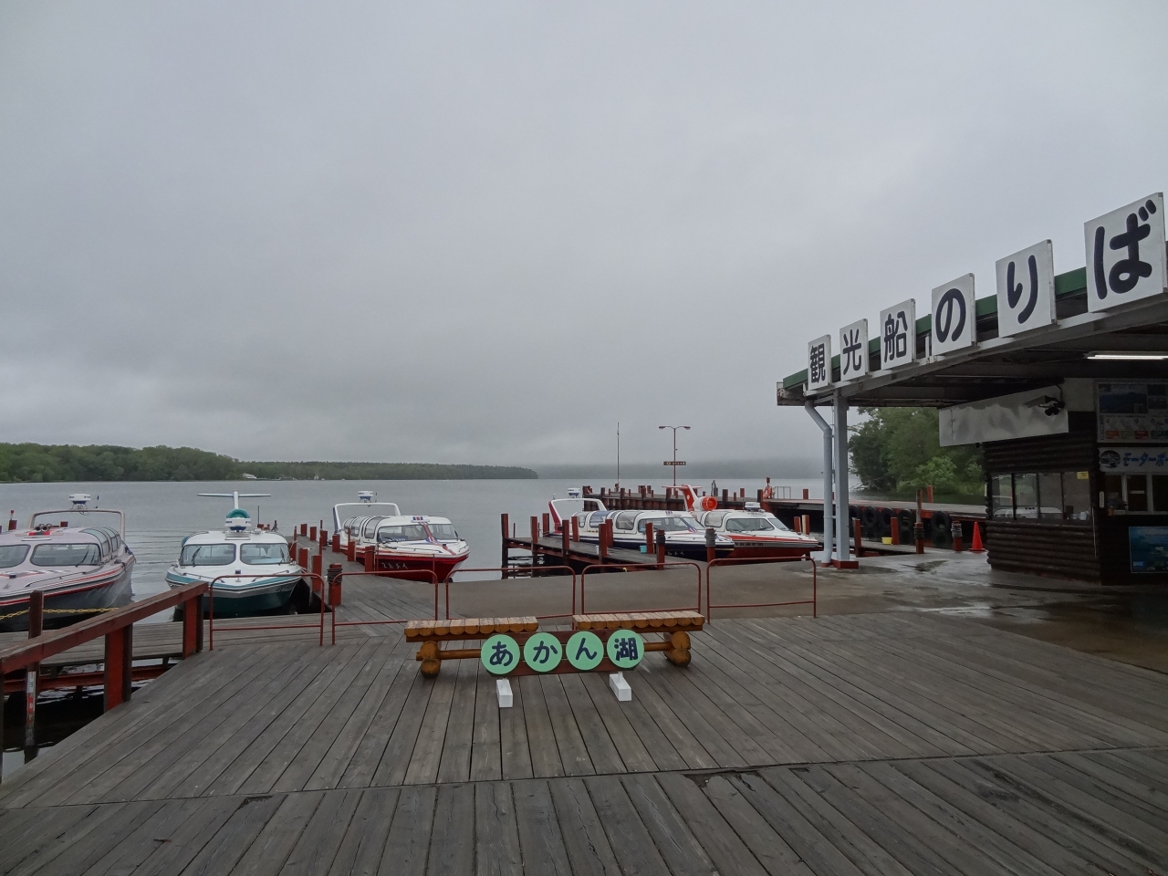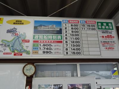 あいにくの曇り空でしたが、それでも空気が美味しく湖の湖畔を早朝に散策してみました。観光客はほとんどいなくて、観光船乗り場のデッキから見える湖の景色が素晴らしい。週末には大勢の観光客で観光船はフル回転しそうです。乗り場にある建物に入ると休憩できるスペースがあり、缶コーヒーを買ってしばし休憩。観光客がいない乗り場もあたりがずーっと見渡せて気持ちがいいです。次回来るために、遊覧船の運航時刻の看板も撮影しておきました。