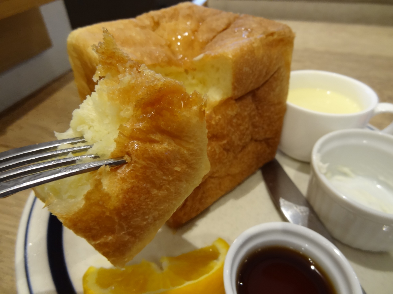 午前8時少し過ぎにこのお店の駐車場付近に来たら、すでに50人ほど並んでいました。50台ほどのスペースの駐車場にかろうじて駐車。さっそく列の最後尾に。8時半の開店と同時に40人ほどは店内に。私の前の7・8人までが入店できず。30分ほ待って、ようやく店内に。人気のサイコロトーストをオーダー。サイズにびっくり!何と10cmの立方体です。上にホイップ状のバターが乗っかっています。他にはポテトサラダとコーンスープ、もちろんホットコーヒーも。エ!と思ったが、ナイフとフォークもあります。ナイフとフォークでこのビッグなトーストと闘う。中はフワフワとしていて、口に入れるとフワッとパンの甘みが口いっぱいに広がる。なかなかの美味。サラダとスープとの相性も抜群です。コーヒーも香り高く苦みとコクのバランスがいい。モーニング好きならイチオシのお店です。大人気店になるのも納得です。帰り際に店内の棚にあったパンを段ボールごと買っちゃいました。