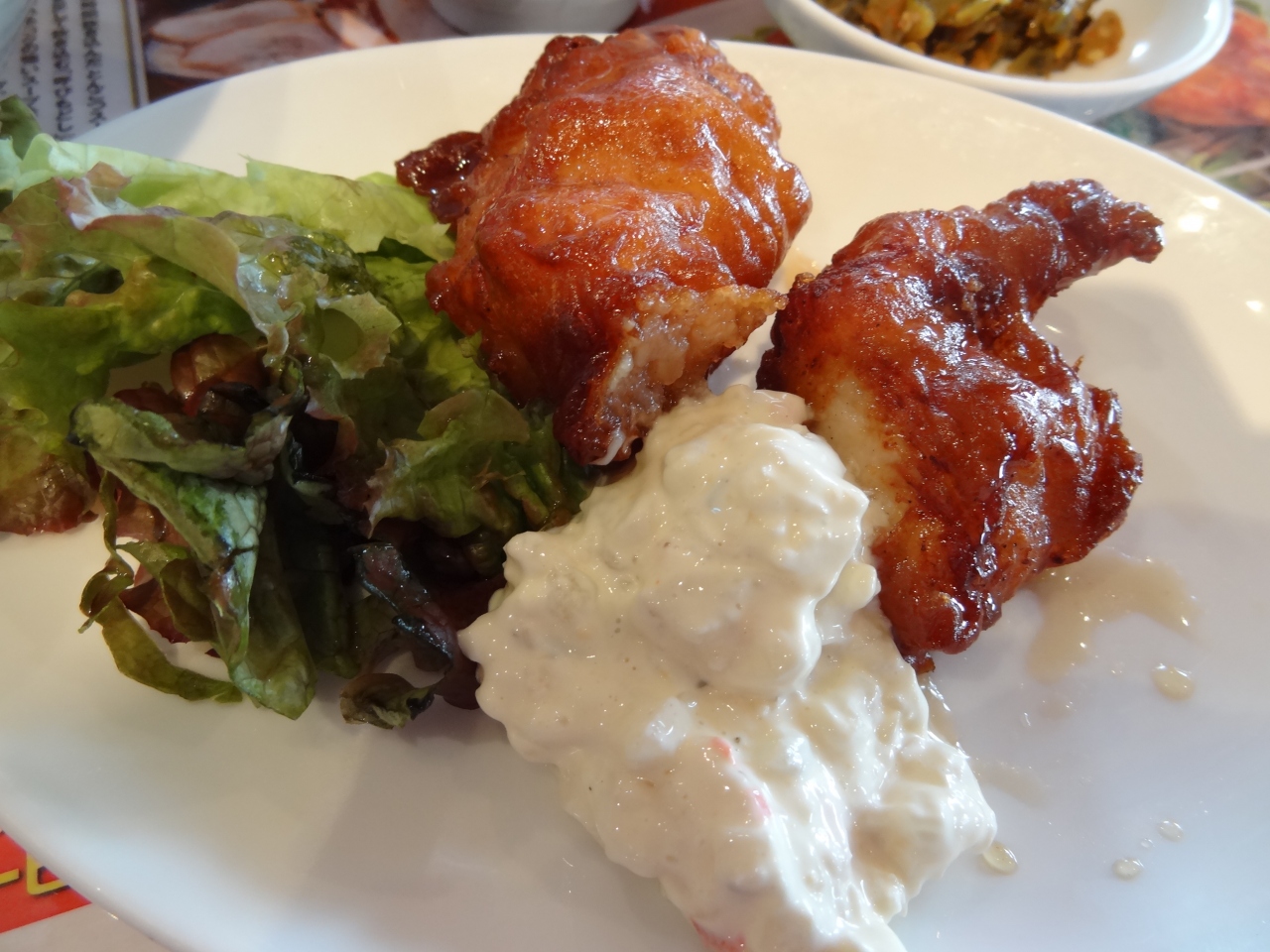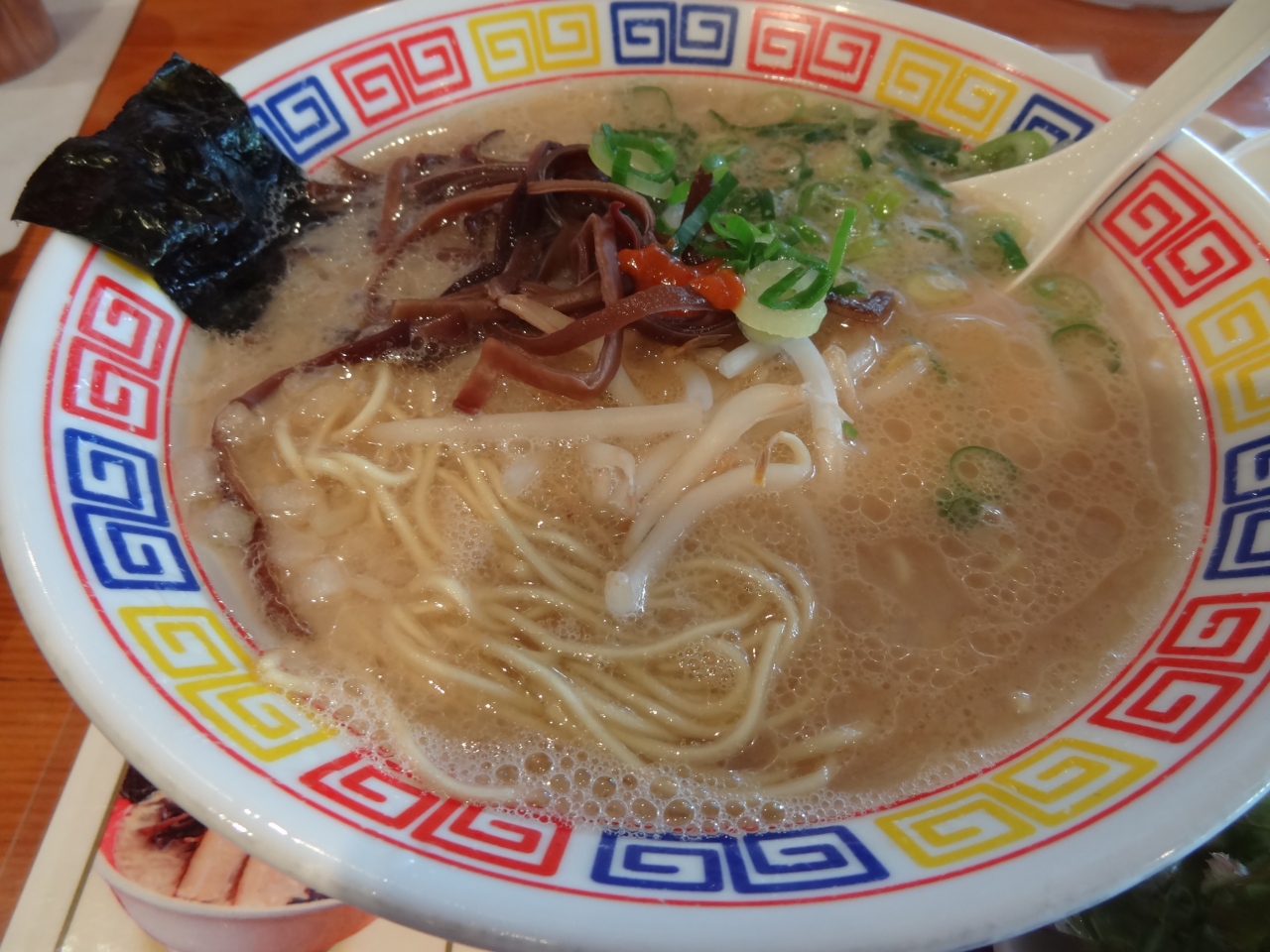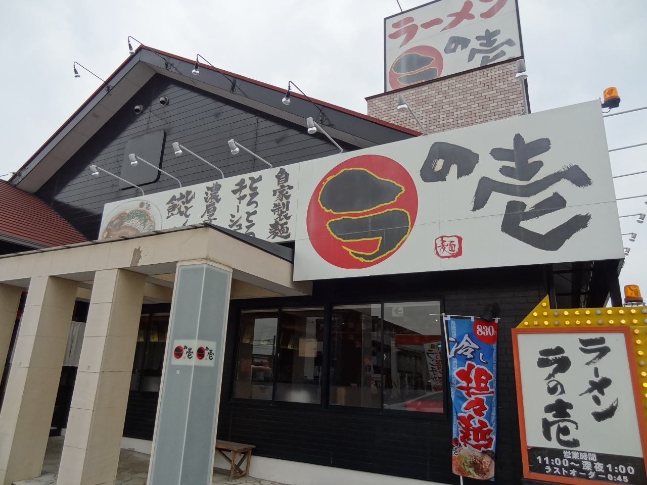 尾張一宮に用事があり昼時でラーメンが好きなので、このお店に初めて立ち寄りました。目立つ外装の建物は遠くからでもよく見えます。駐車場は20台ほど停められます。店内はやや混んでいて飾り付けがいい雰囲気を醸し出しています。オーダーしたのは平日限定の「とんこつラーメンチキン南蛮ランチ」。お漬物が二種類、食べ放題。濃厚そうに見えるスープは意外とあっさり味。麺にスープがよくからみ、スルスルっと喉に入っていきます。チキン南蛮は普通、トンカツのように平べったいのだが、骨付きチキンのような形。熱々ジューシーなチキン南蛮は噛み応えがあり、ラーメンとの相性もバッチリ!コスパが高いお店に満足しきり。