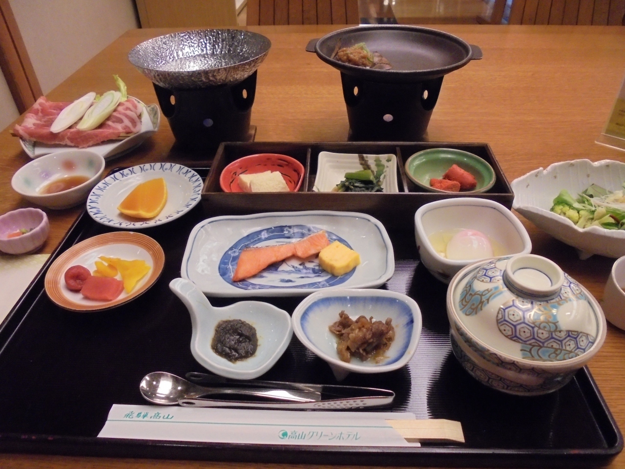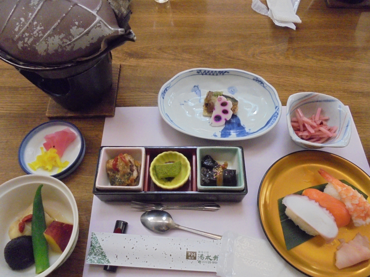 広縁付きの8畳の和室に宿泊。部屋からはJR高山線が見えます。独立型のエアコンや湯沸かし保温ポットなどの設備があり、トイレ・洗面台・バスルームは独立、部屋の風呂も温泉で快適に過ごせました。露天風呂はないですが、大浴場は自然石を随所に配していてゆったりと湯に浸かれました。加温・加水・環流なしの掛け流しの温泉で、ぬめり感が強い。肌はぬるぬる、ツルツルで最高です。食事は夕食・朝食共にセットメニュー。決まった量だけ食べられ、郷土色ある料理が多くので、実に健康的で美味しかったです。