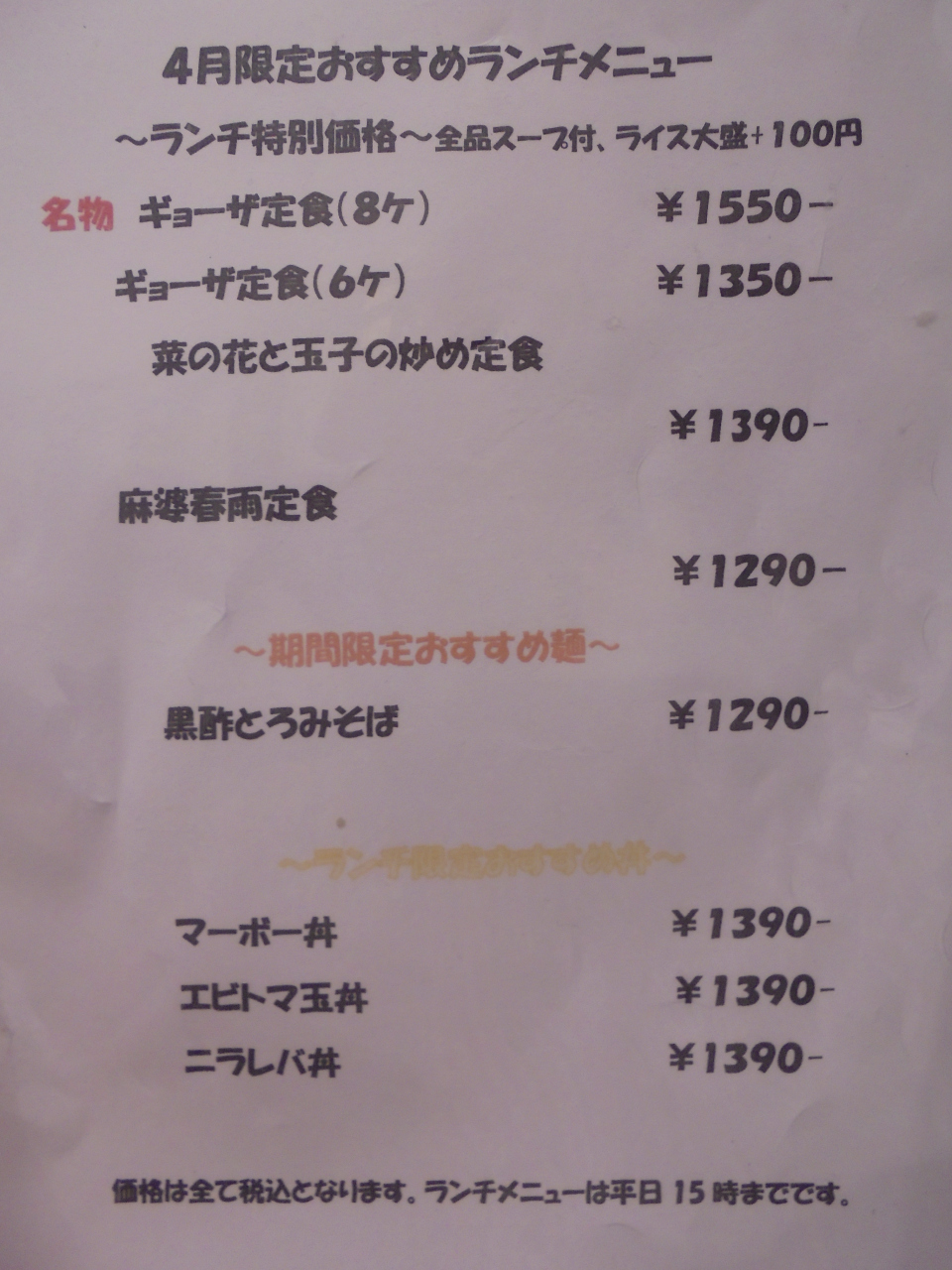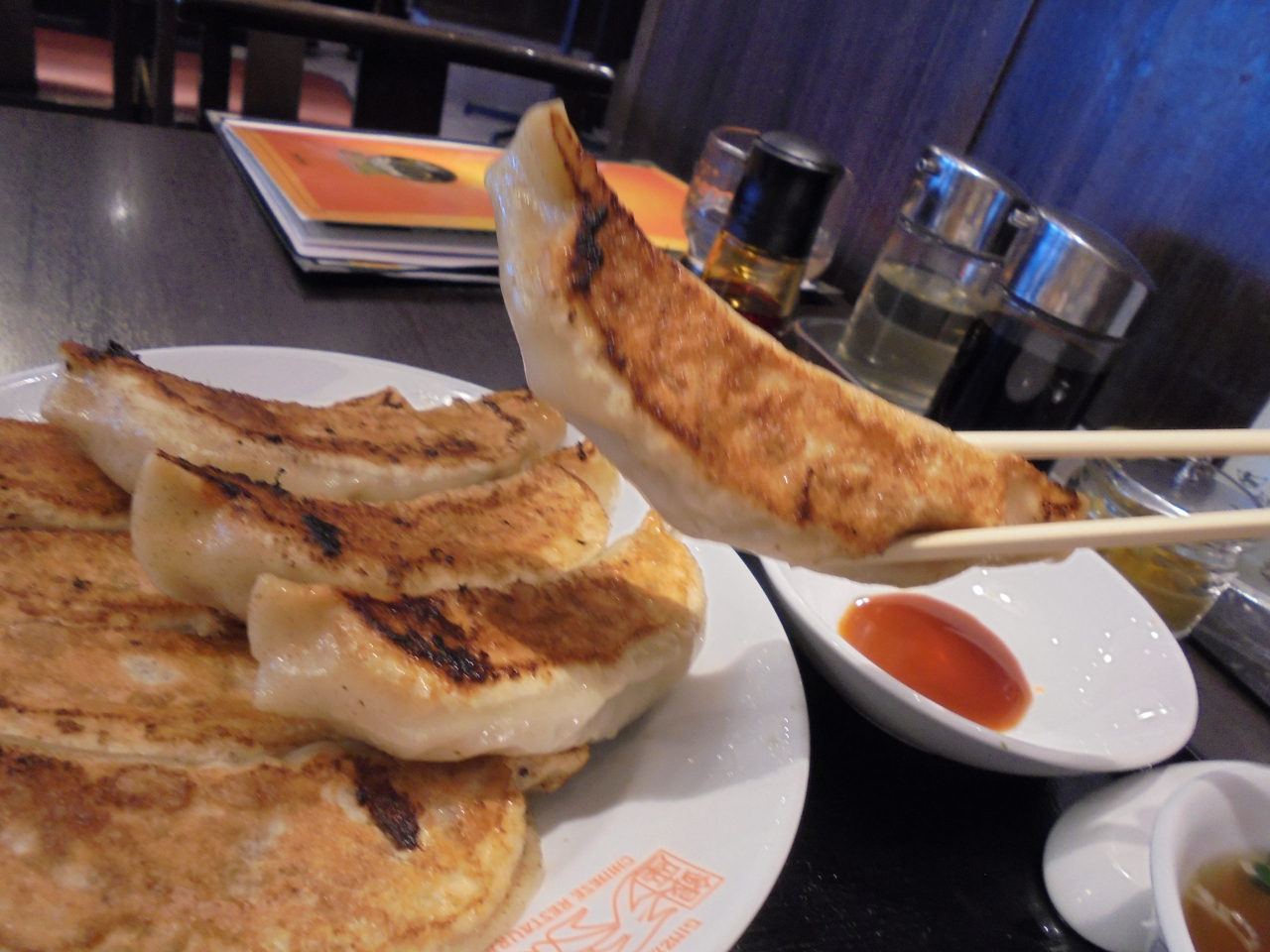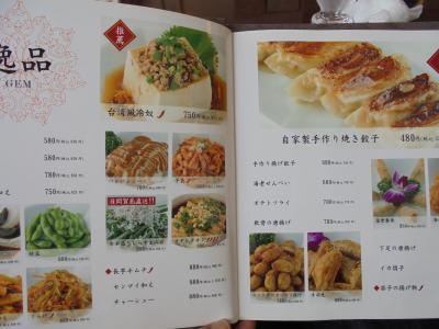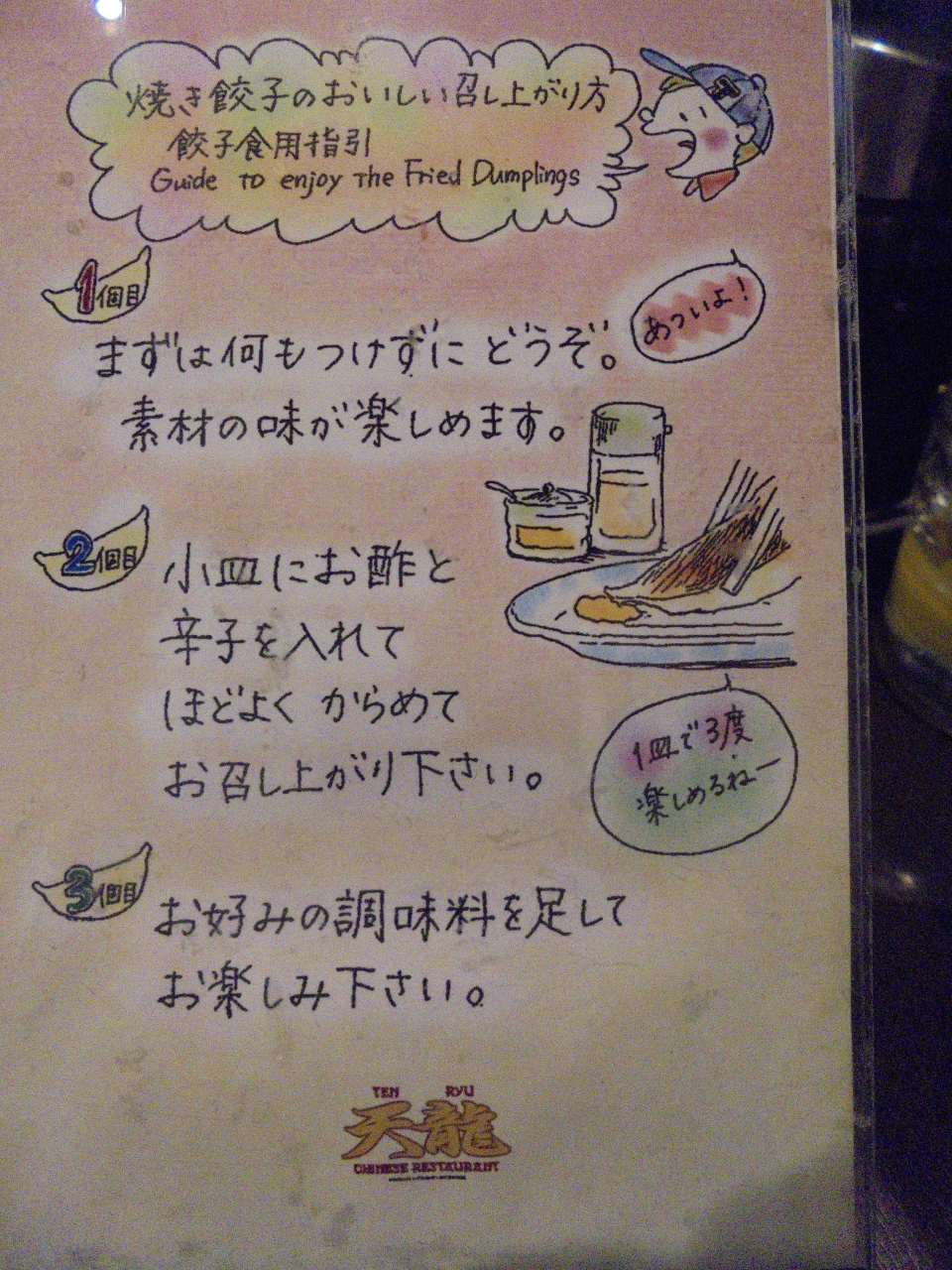 店内はこじんまりとした感じ。茶色を基調にして北京の中華料理店のイメージがよく出ている。ランプシェードに雲に乗った龍が描かれている。縁起がいい。オーダーしたのはギョーザ定食(8ケ) \1550。4月限定おすすめランチメニューだ。到着したギョウザにビックリ仰天。超ビッグサイズだ。長さ12センチはあろうかと。具は肉の量が多く、肉汁がたっぷり。餃子が大好きなら、なんとか食べられるボリューム。ご飯は大盛りにしなくてよかった。焼き餃子の美味しい食べ方の説明書きもあるので、参考にするといいかも。
