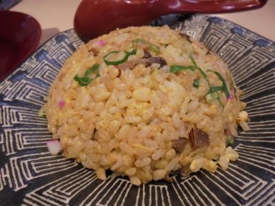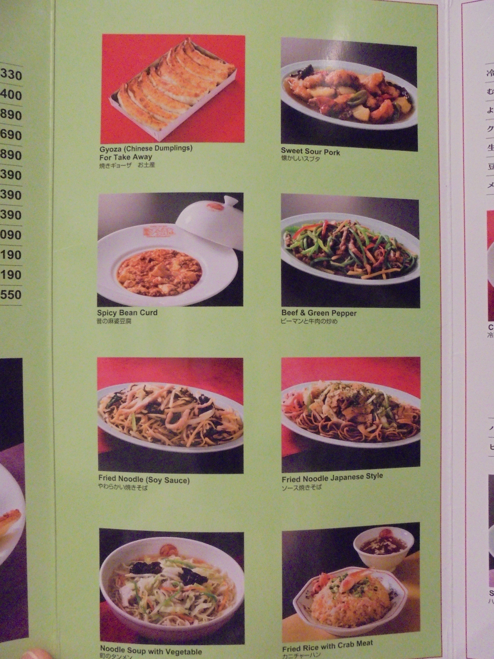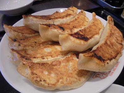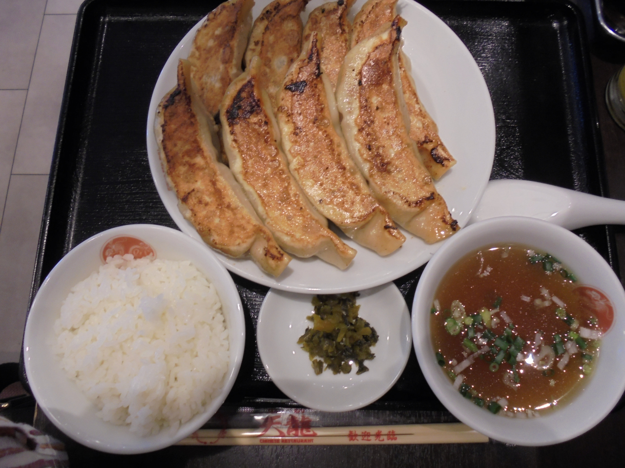 店内はこじんまりとした感じ。茶色を基調にして北京の中華料理店のイメージがよく出ている。ランプシェードに雲に乗った龍が描かれている。縁起がいい。オーダーしたのはギョーザ定食(8ケ) \1550。4月限定おすすめランチメニューだ。到着したギョウザにビックリ仰天。超ビッグサイズだ。長さ12センチはあろうかと。具は肉の量が多く、肉汁がたっぷり。餃子が大好きなら、なんとか食べられるボリューム。ご飯は大盛りにしなくてよかった。焼き餃子の美味しい食べ方の説明書きもあるので、参考にするといいかも。