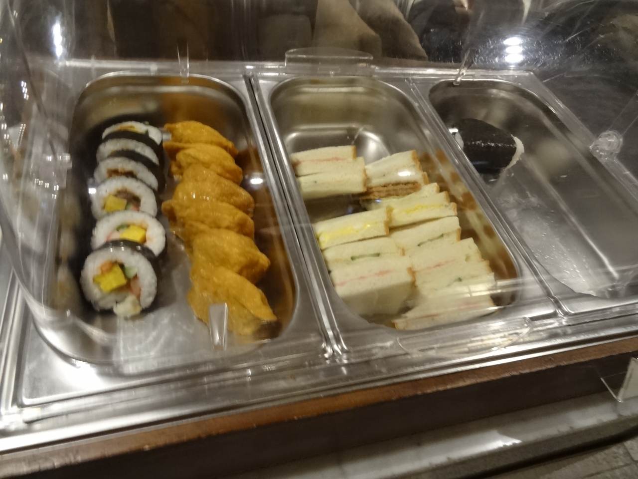 海外旅行でこのラウンジを初めて利用しました。さくらラウンジと比べてみると、ドリンク類はやや少ないものの、ゆったりできるソファー・椅子などの種類が多いです。比較的空いているので、ゆったり快適としたリッチ感覚が十分味わえます。食事のほうは、前述のようにドリンクの種類はやや少ないです。アルコール類はもっと種類が多いといいです。焼きそば・ポテトサラダの他に、助六・稲荷寿司、サンドイッチ、おにぎりが揃っているのもいいです。ミニカップヌードルが棚の上のほうに目立たないように置かれています。味のほうはまずまずという感じです。朝食をまだ済ませていない人にとっては、利用価値は十分あると思います。