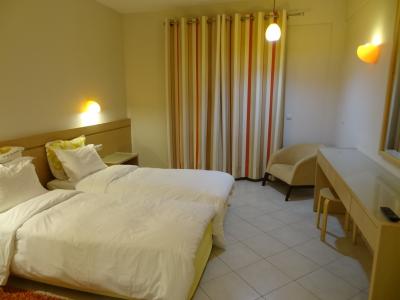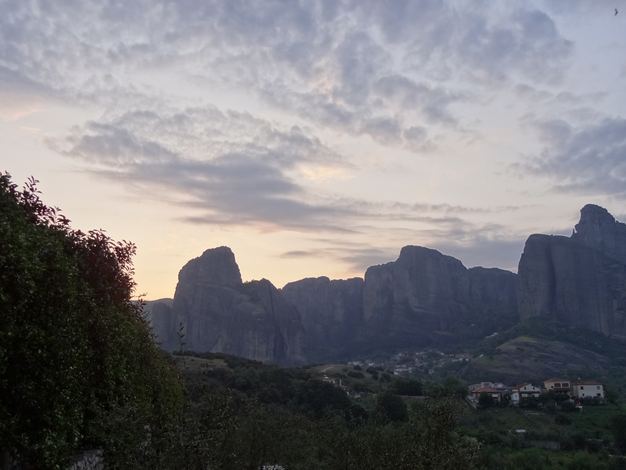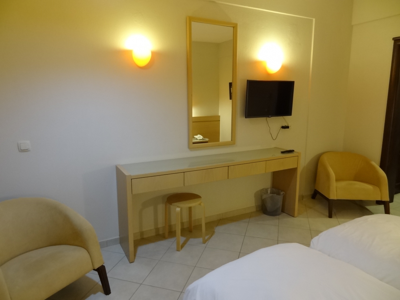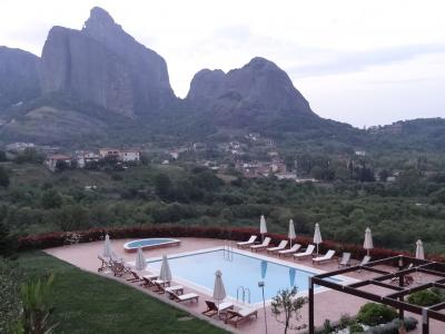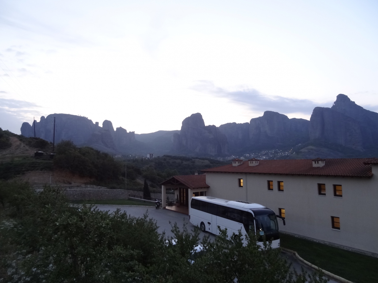 バックにメテオラの奇岩群を一望できる、ロケーション抜群のホテルです。3階がロビーになっています。 二階にレストランとプールがあります。団体の宿泊客が多いときには、湯がなかなか出なくなります。午後11時過ぎか早朝なら湯が出ました。ベッド幅は狭くて90センチほど、部屋の広さは家内と宿泊でも十分でした。床も壁もタイル張りのバスルームも広く、アメニティグッズも揃っていました。部屋には電源コンセントが多く、ライティングデスクも広くて使いやすかったです。 部屋からの眺望も奇岩がよく見えて素晴らしかったです。ブッフェ式の朝食のメニューはごく標準的、ハムが美味しくて生野菜・デザートも充実していました。
