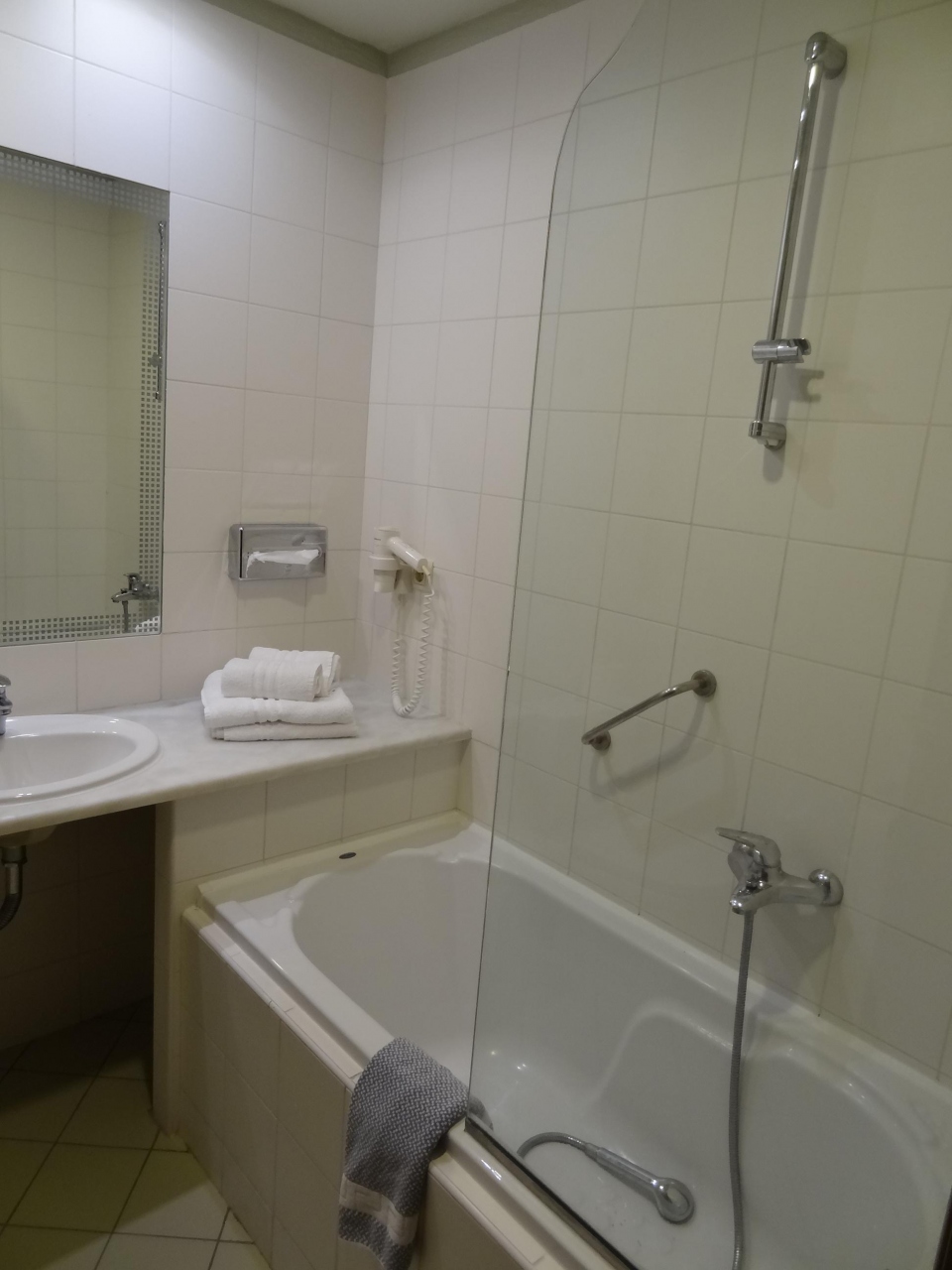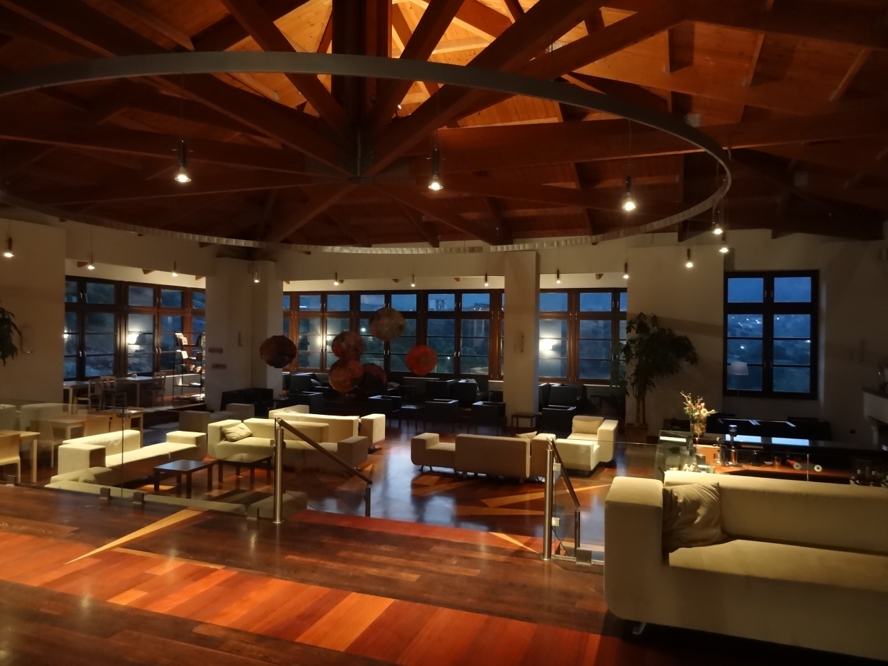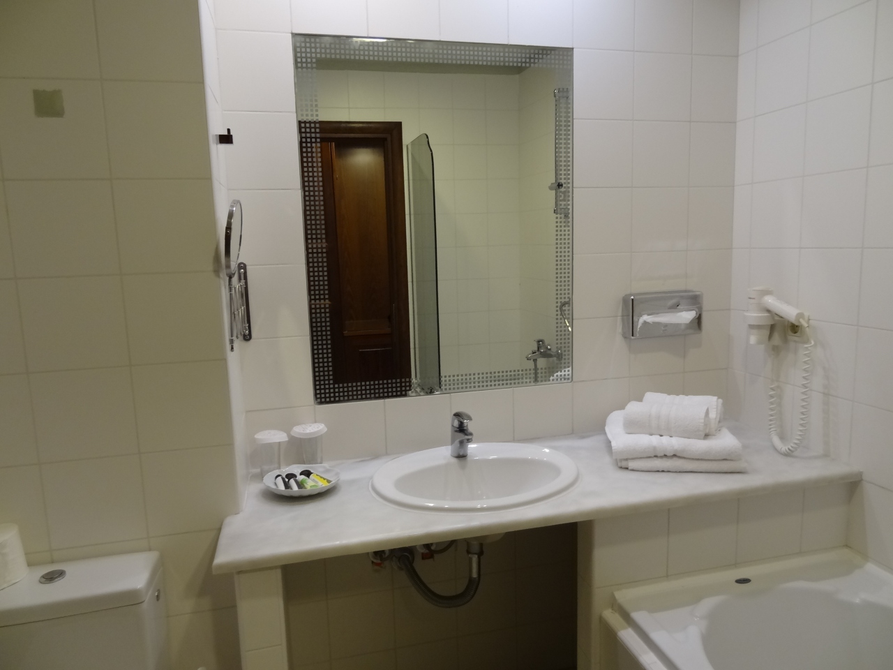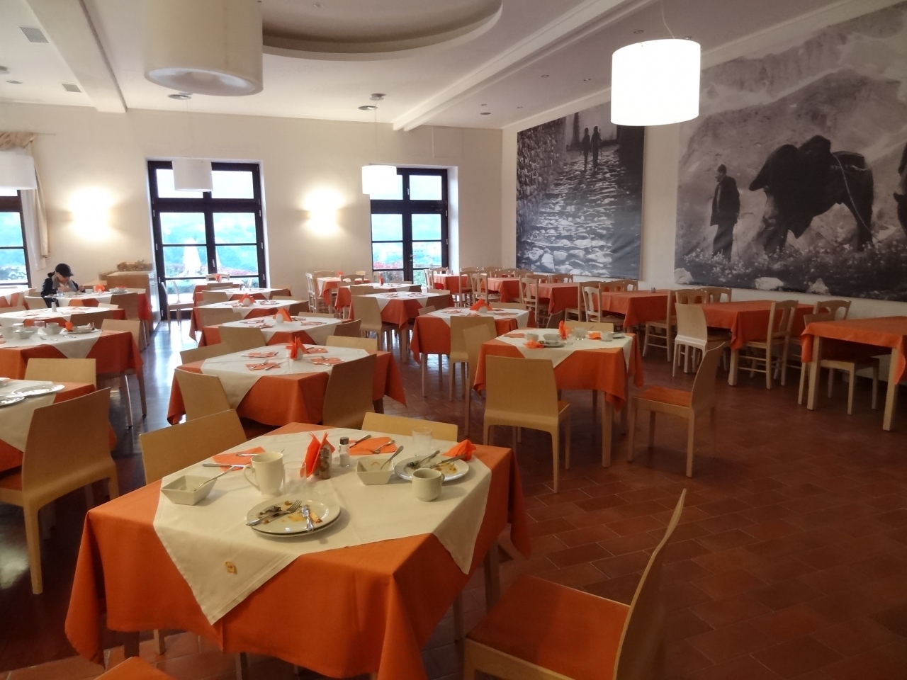 バックにメテオラの奇岩群を一望できる、ロケーション抜群のホテルです。3階がロビーになっています。 二階にレストランとプールがあります。団体の宿泊客が多いときには、湯がなかなか出なくなります。午後11時過ぎか早朝なら湯が出ました。ベッド幅は狭くて90センチほど、部屋の広さは家内と宿泊でも十分でした。床も壁もタイル張りのバスルームも広く、アメニティグッズも揃っていました。部屋には電源コンセントが多く、ライティングデスクも広くて使いやすかったです。 部屋からの眺望も奇岩がよく見えて素晴らしかったです。ブッフェ式の朝食のメニューはごく標準的、ハムが美味しくて生野菜・デザートも充実していました。