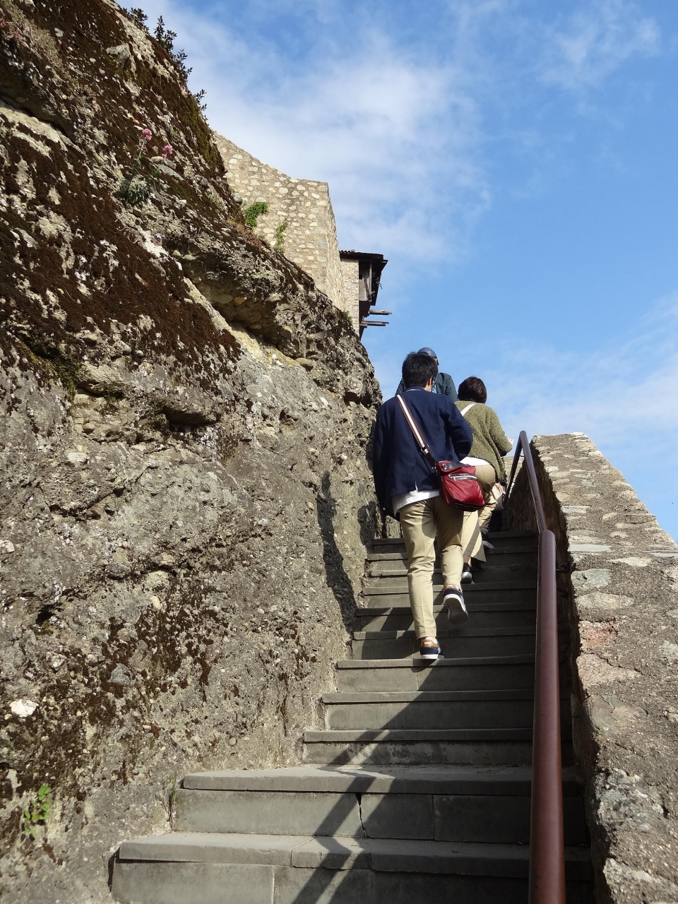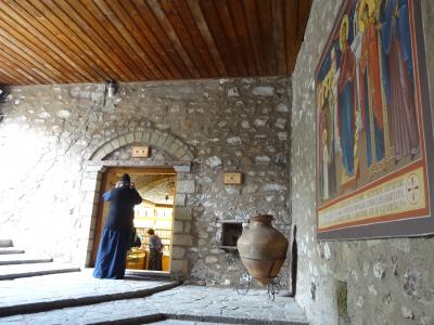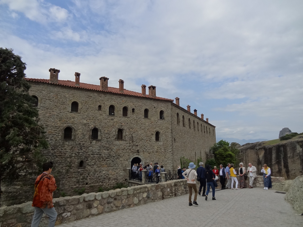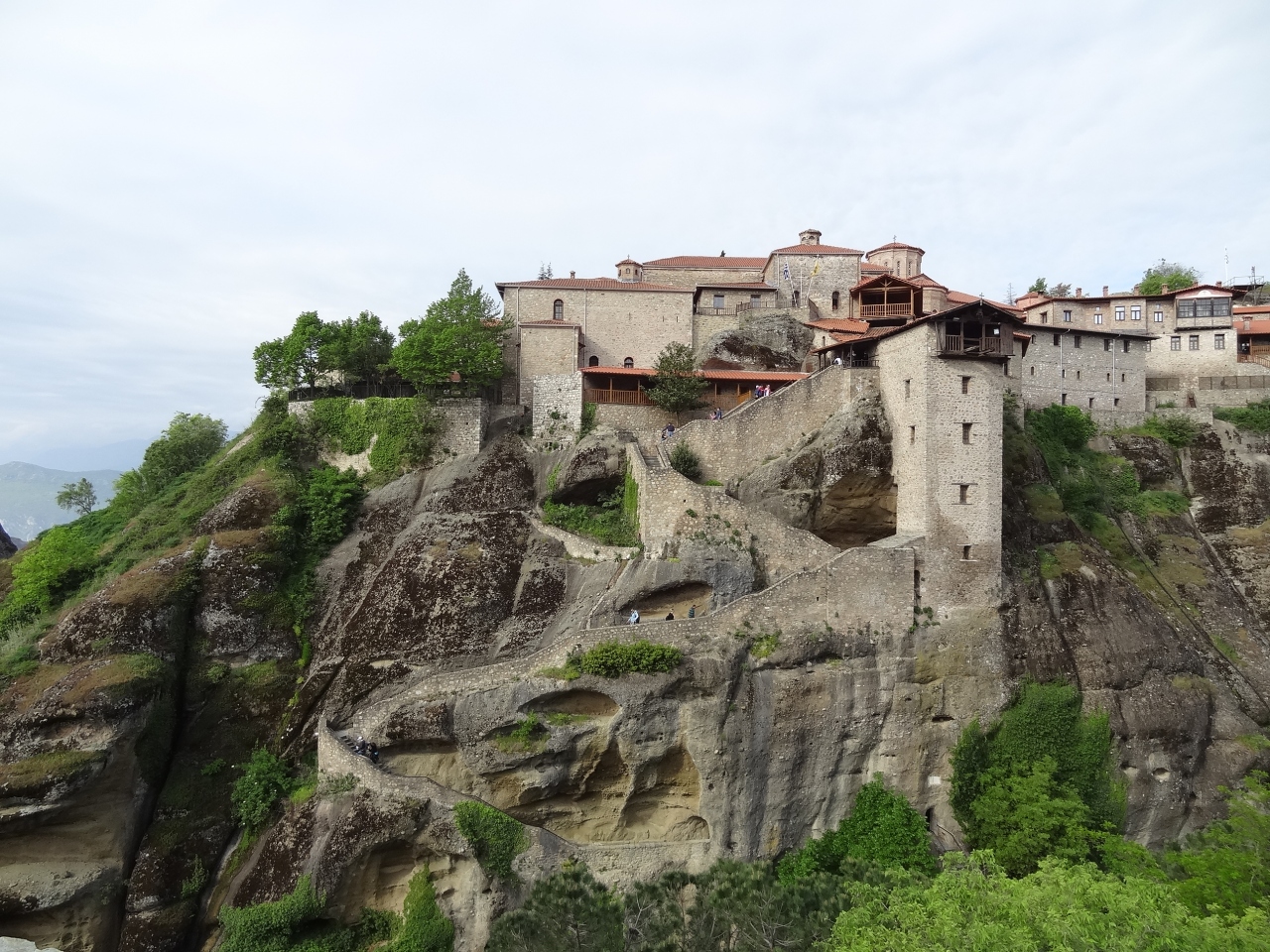 メテオラの奇岩の上に建つ、6つの修道院の中では一番大きな修道院です。駐車場から下へ降りていき、真上にそびえる修道院を下から眺めると、想像を絶する高さに驚きます。三百段くらいはありそうな階段を上がって建物にやっとの思いで入ります。