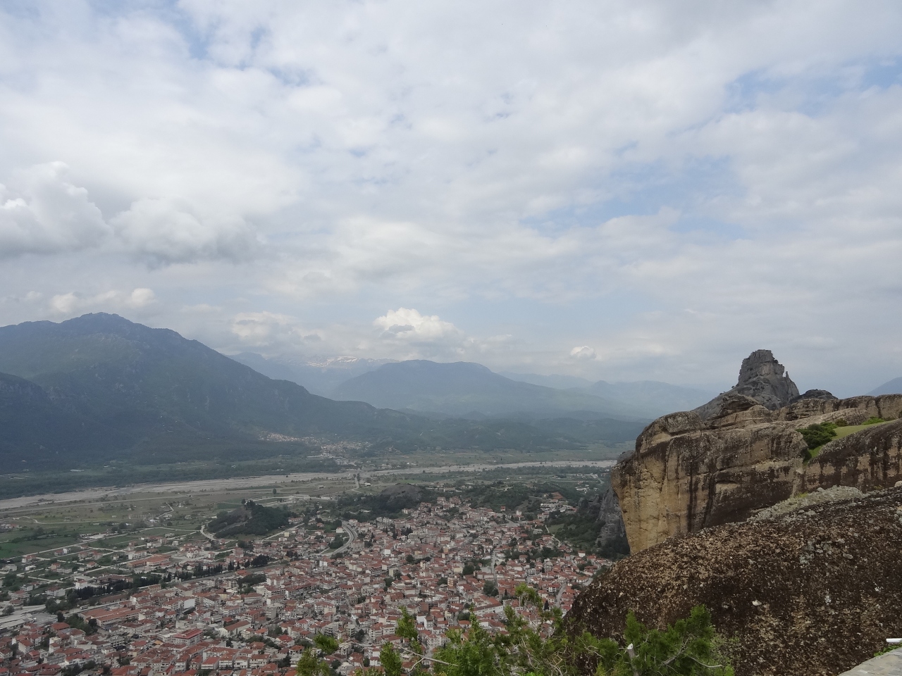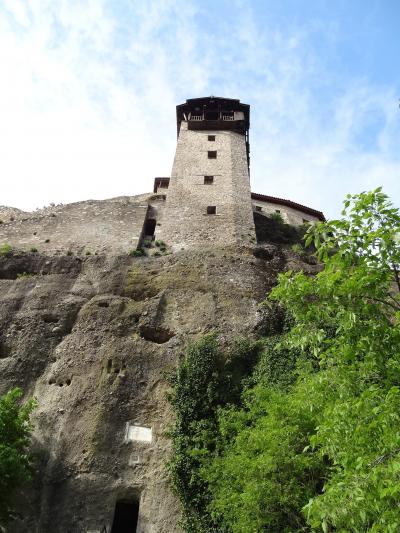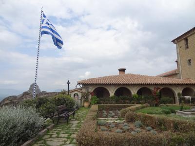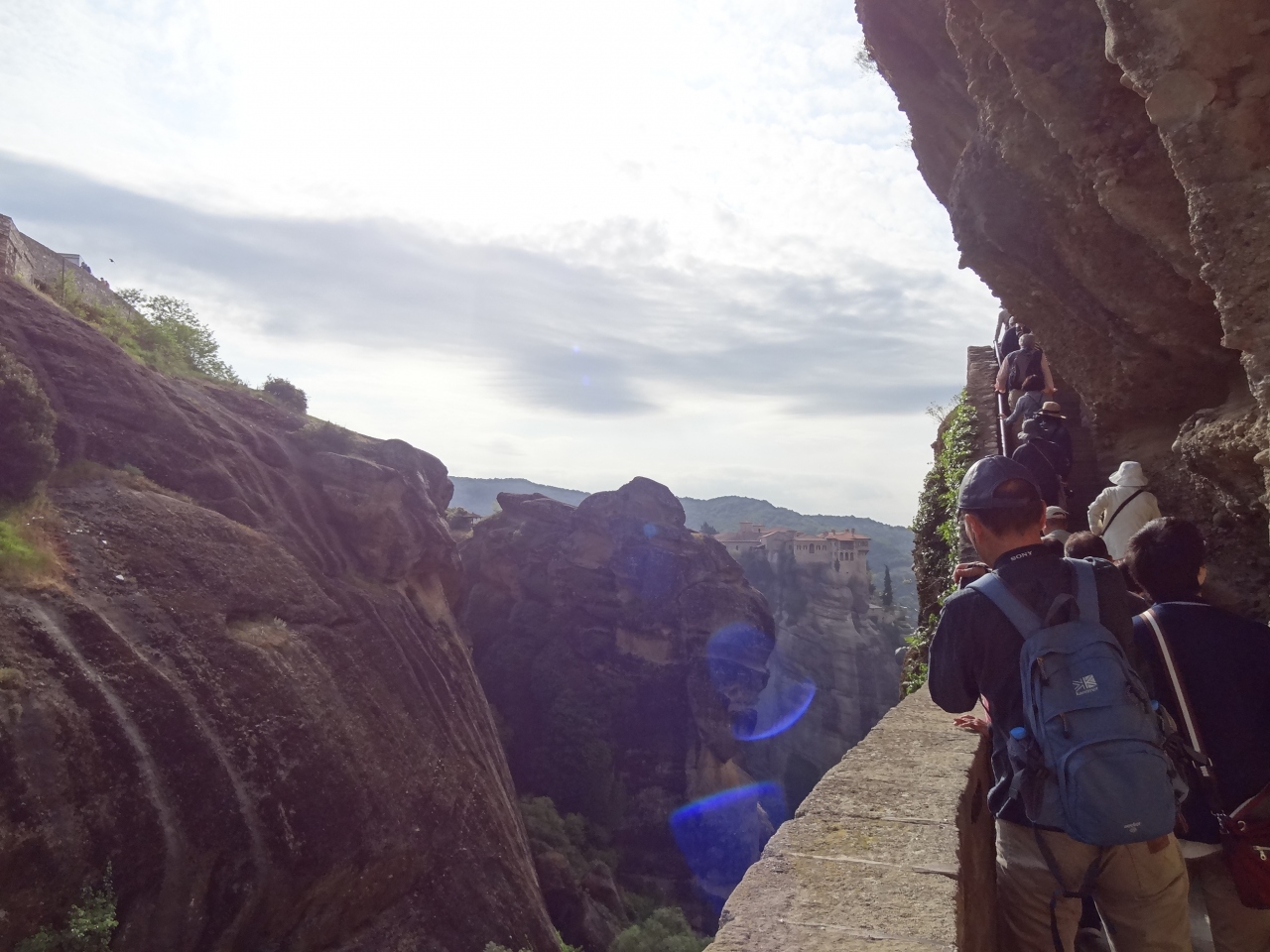 脱帽して建物の内部へ。中は撮影禁止になっています。壁や天井に描かれたフレスコ画はかなりの歴史を感じさせるほど見事に描かれています。外の通路をずっと奥に行くと、展望台のある広場に出ます。ここから見える景色は絶景そのもの。そそり立つ巨岩の上に建つ修道院がいくつも見えます。ヘリコプターもない五百年ほど昔に、どうやって巨岩の上に修道院が建てられたのか、不思議でなりませんでした。- 旅行時期