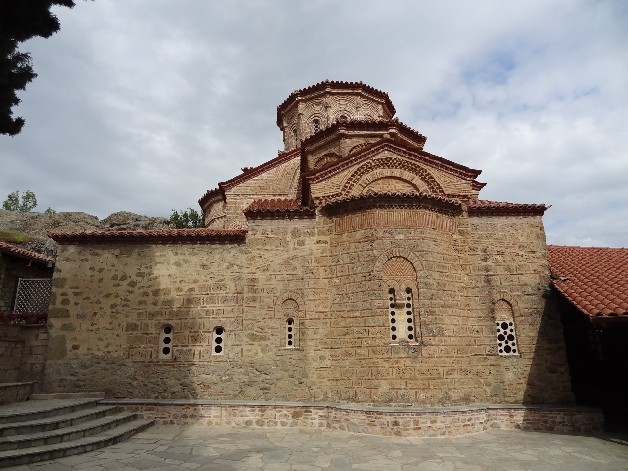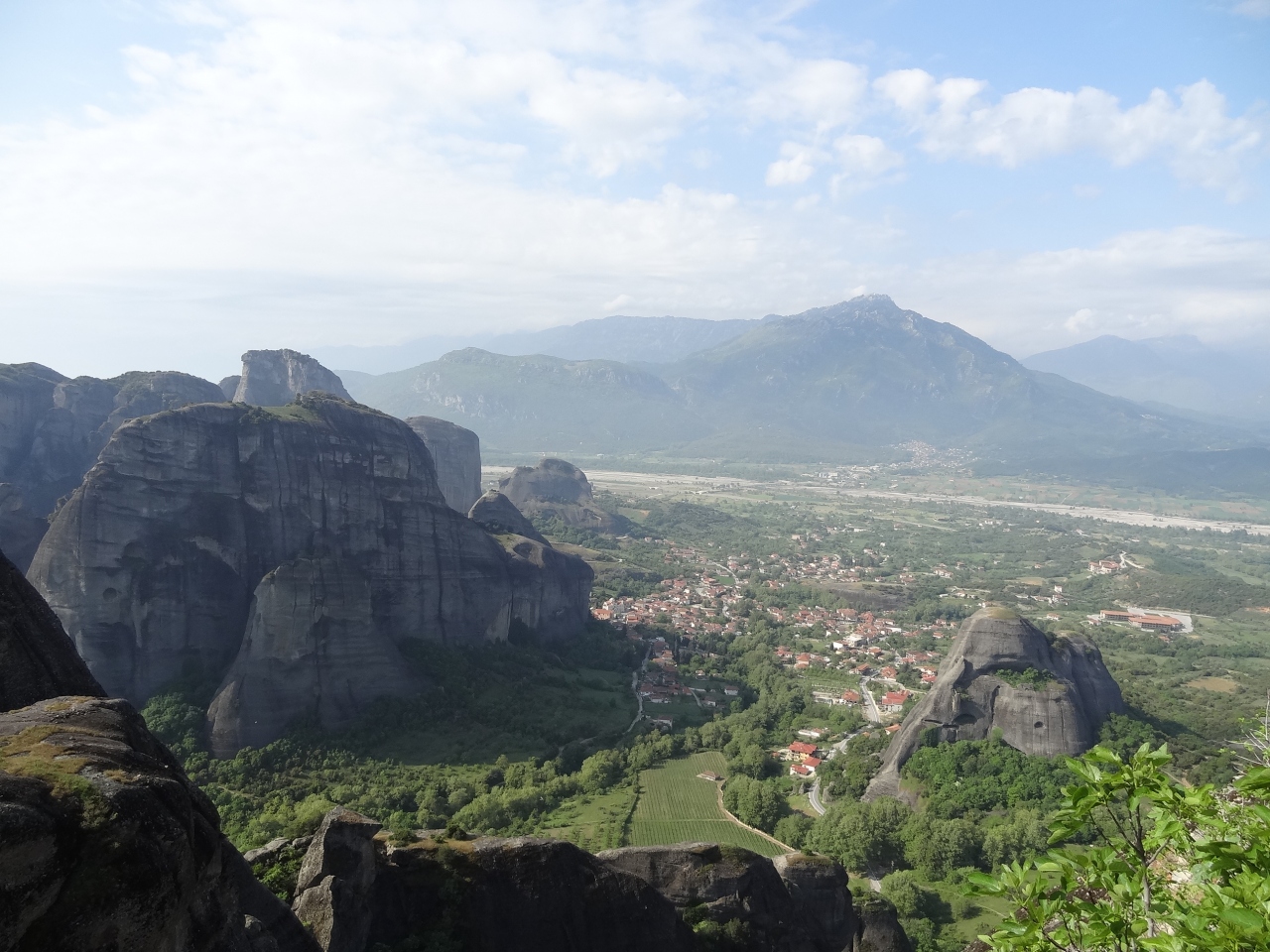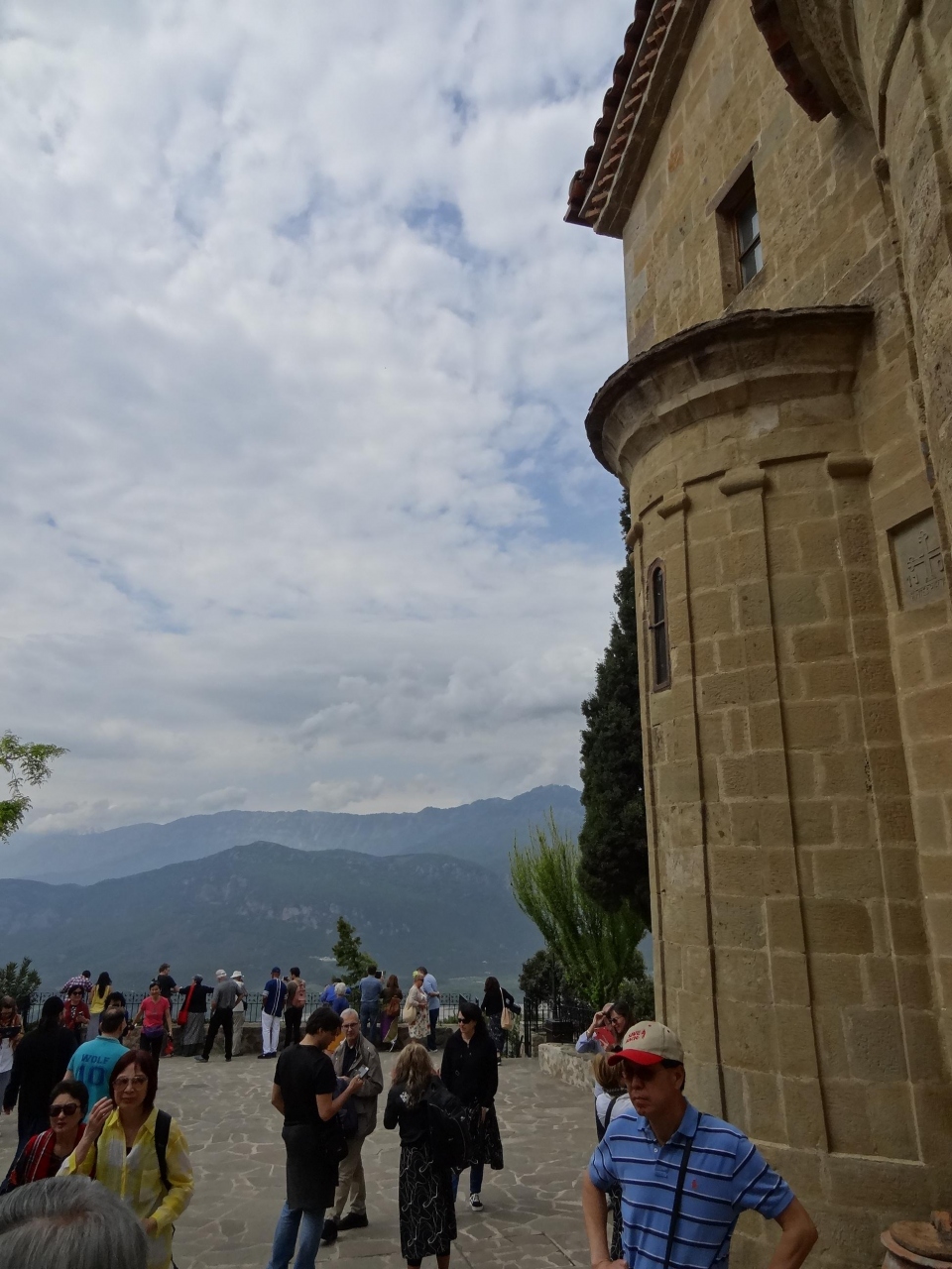 脱帽して建物の内部へ。中は撮影禁止になっています。壁や天井に描かれたフレスコ画はかなりの歴史を感じさせるほど見事に描かれています。外の通路をずっと奥に行くと、展望台のある広場に出ます。ここから見える景色は絶景そのもの。そそり立つ巨岩の上に建つ修道院がいくつも見えます。ヘリコプターもない五百年ほど昔に、どうやって巨岩の上に修道院が建てられたのか、不思議でなりませんでした。- 旅行時期