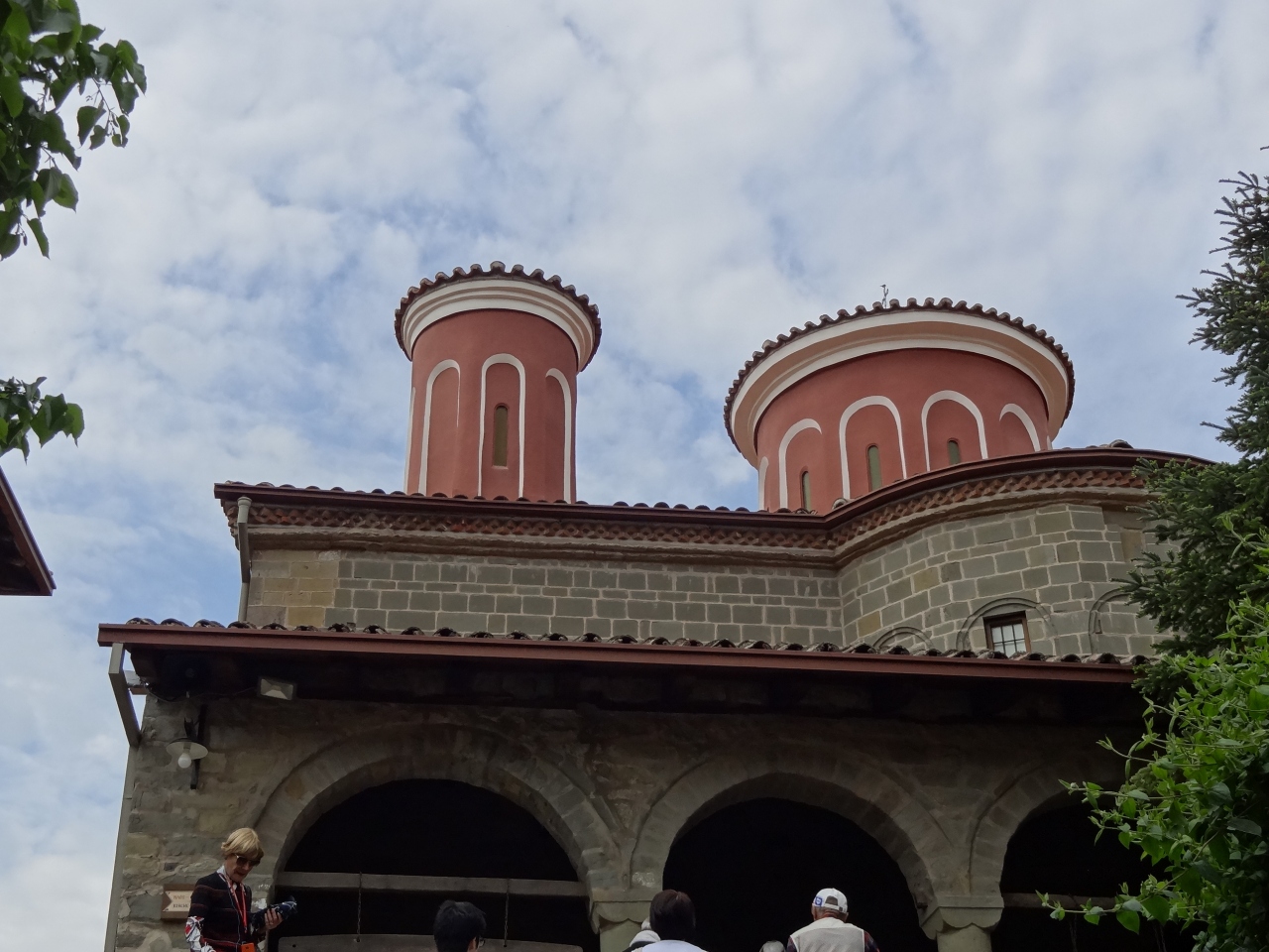 メガロ・メテオロン修道院を見学した後で、この修道院を訪れました。この修道院への入り口までは階段はなく、岩と岩の間に架けられた石橋を渡るだけですので、入場は楽でした。修道院の建物内は脱帽・写真撮影禁止となっています。建物内の壁や天井画は思ったよりも色鮮やかな色彩で描かれています。現地ガイドさんの説明では、10年ほど前に絵の修復が行われ塗り直されたとか。道理で色が鮮やか過ぎると思いました。外に出ると、結構広い広場があり、眼下にカランバカ市街地を一望できます。手前横には奇岩がいくつか見えて、オレンジ色の屋根の住宅街と不思議なマッチングになっています。
