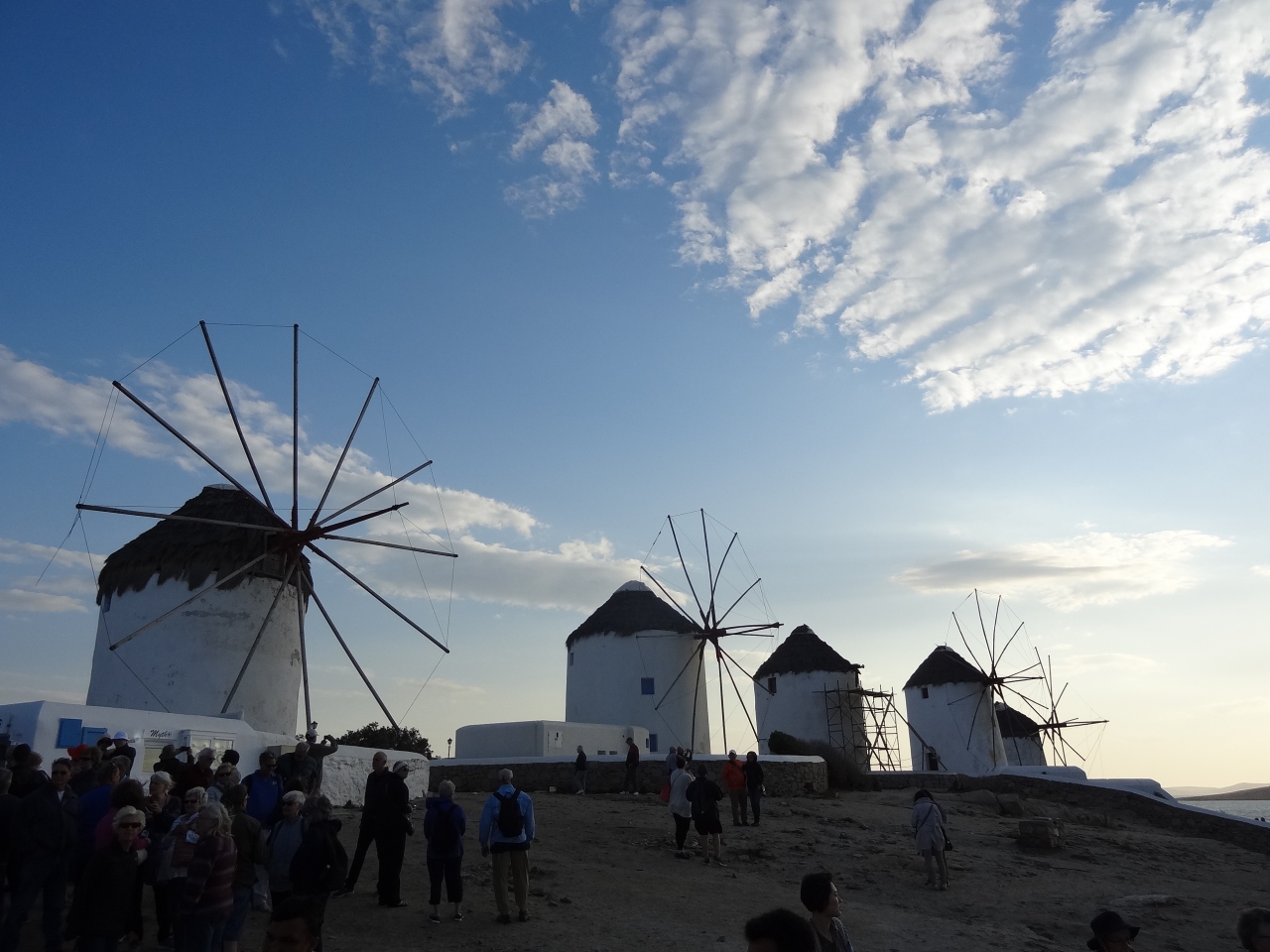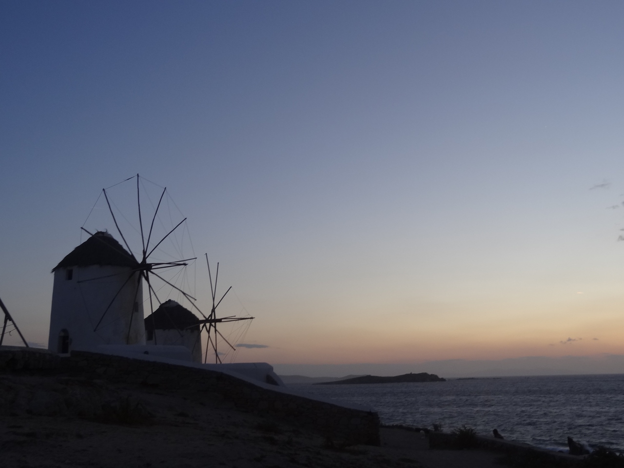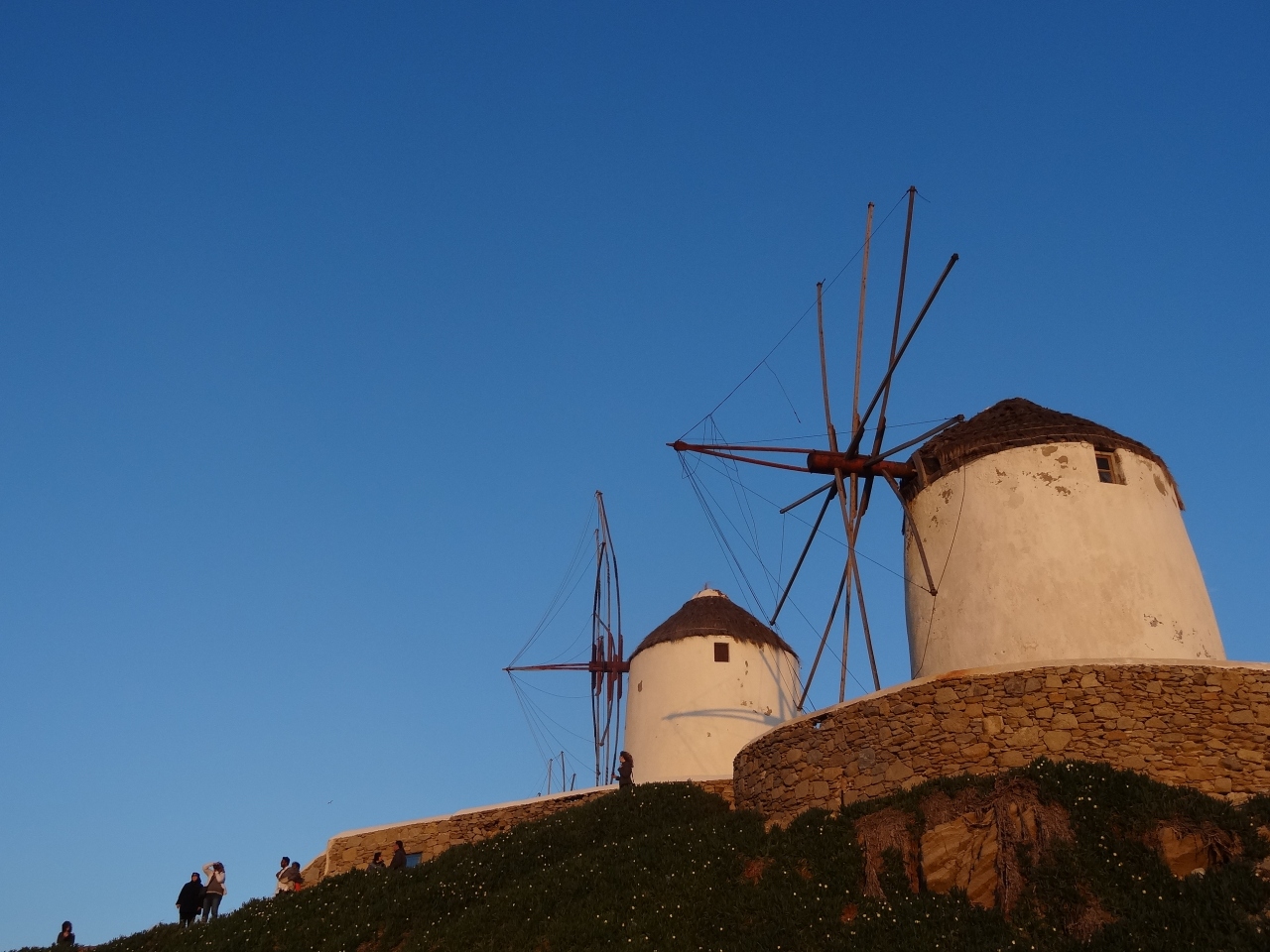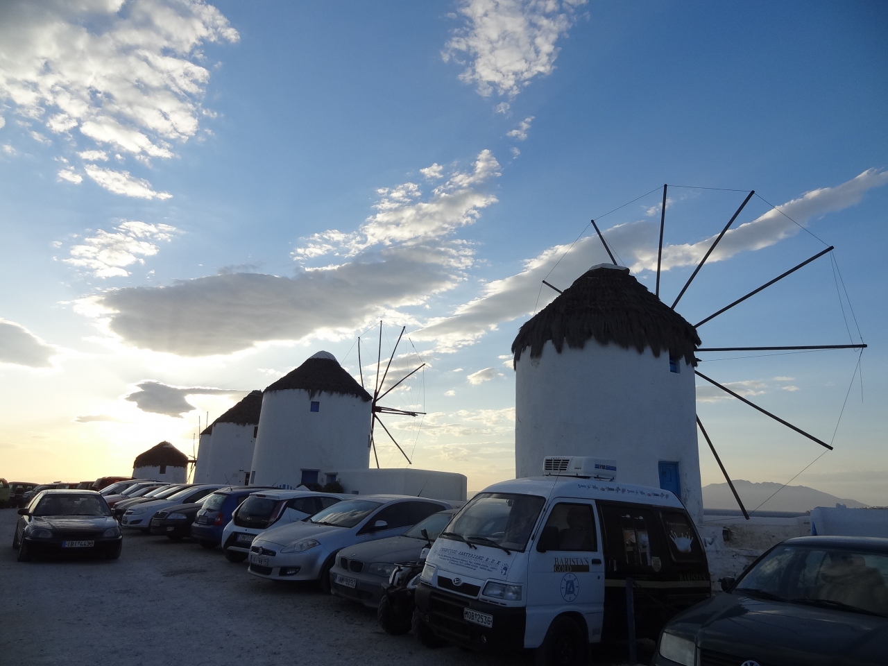 エーゲ海に浮かぶ白い真珠とも言われるミコノス島。エーゲ海に思いをはせるかのように並んで立つ風車群。一部羽根が無い建物もあるが、それがかえって風車の彩りを増しているかのようです。海を背にして眺めてもいいし、駐車場から風車の背中越しに見るのもいいです。訪れたこの日はちょうど日没前の時間で、夕日に染まる風車を撮影することができました。素晴らしい絶景に魅了された日となりました。エーゲ海の絶景としては、是非お勧めしたいスポットと言えるでしょう。