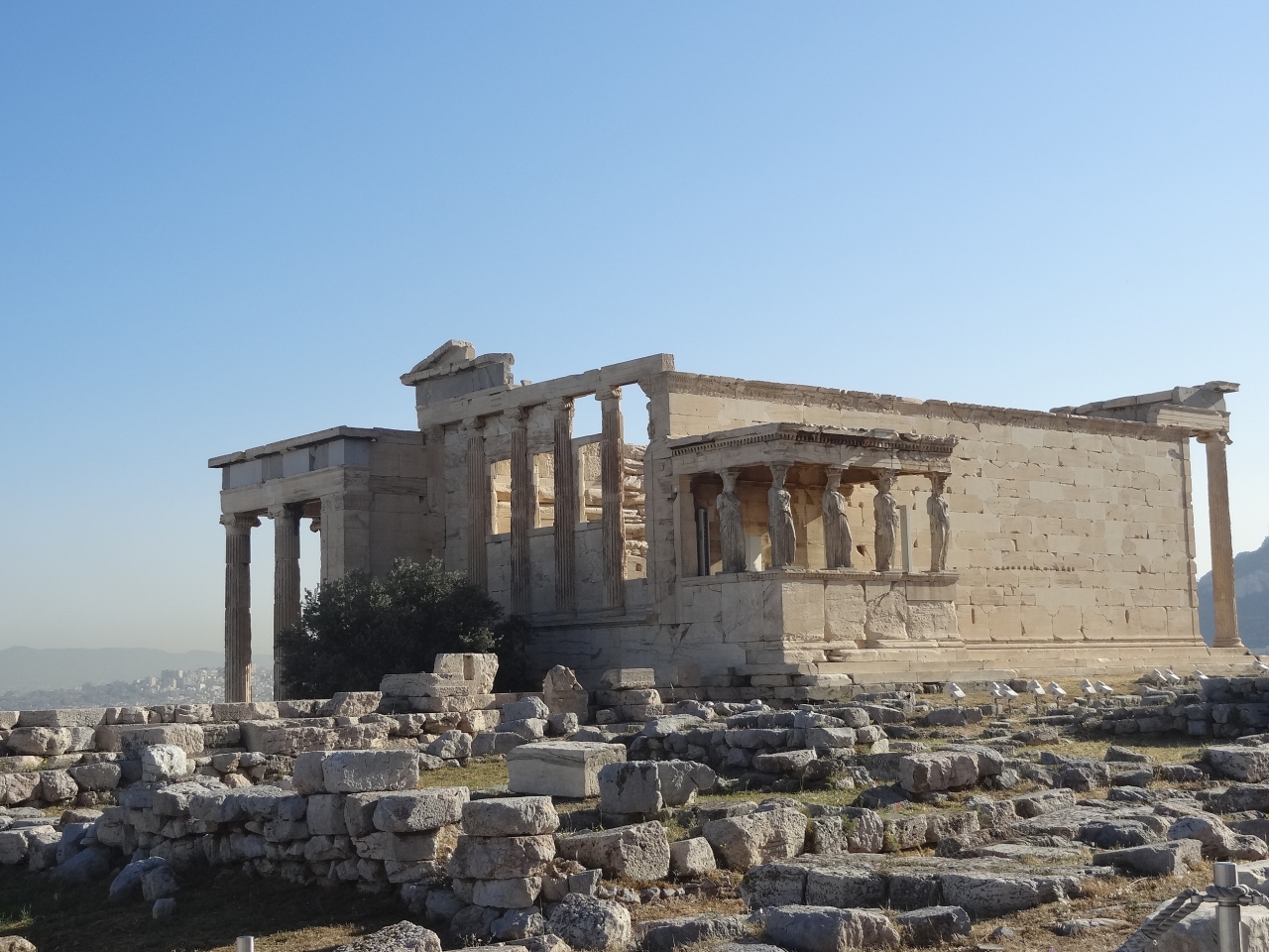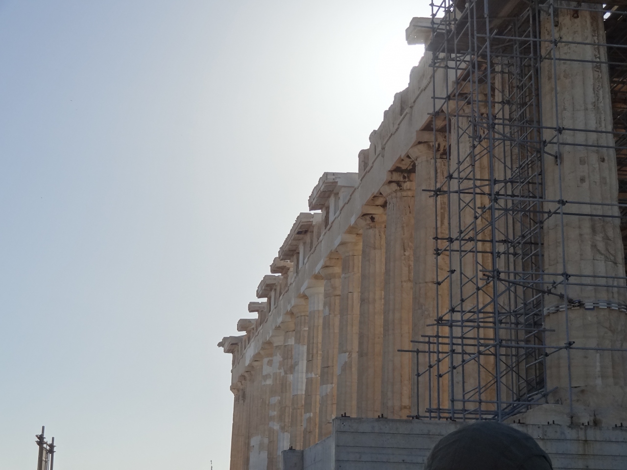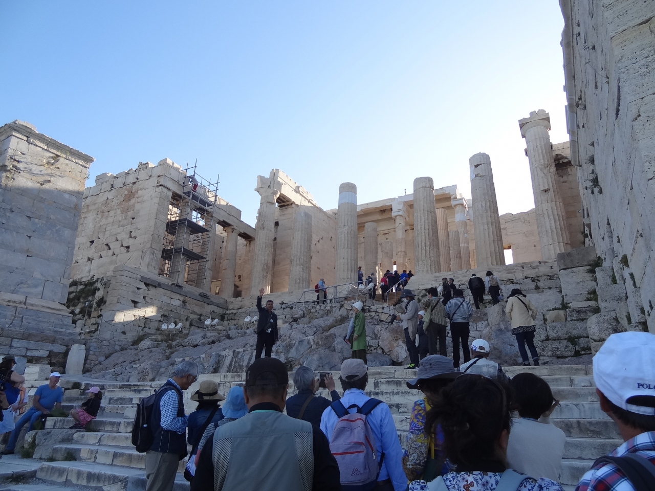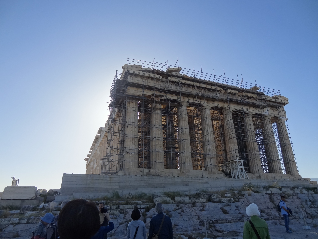 入場ゲートに着いたのが午前9時過ぎ。それほど観光客はいなくてスムーズに入場できました。石畳の緩い上り坂を上がって行くと、あちこちに神殿や円形劇場を見ることができます。階段上にある高い門をくぐると、かの有名なパルテノン神殿と左側に6体の少女像を持つエレクティオン神殿が目の前に迫ってきます。ギリシアの神々に近づいて来たような錯覚さえ覚えました。