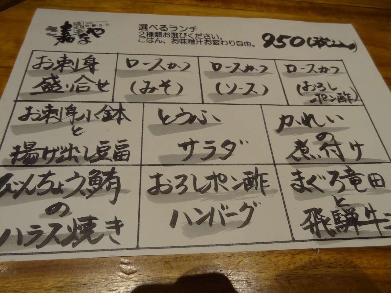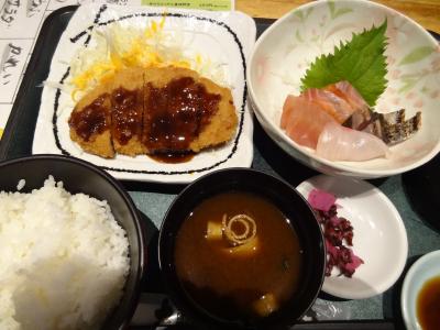 栄のオアシス21の南側にあるお店です。お昼時でしたので、安くて美味しそうなランチをやっている店を探していて、偶然この店の前にある看板に目が留まりました。選べるランチに誘われて入店。10種類ものメニューから二品を選びます。刺身とトンカツをオーダー。ご飯とみそ汁はお代わり自由なのもうれしい。刺身は4種類。カツオ、サーモン、マグロ、タイ。どれも新鮮でおいしい。トンカツは豚肉の旨味を逃がさないように揚げてあり、サクサクとした歯ごたえがあります。ご飯とみそ汁をお代わりして税込み950円はコスパ最高!この店のリピーターになりそう。