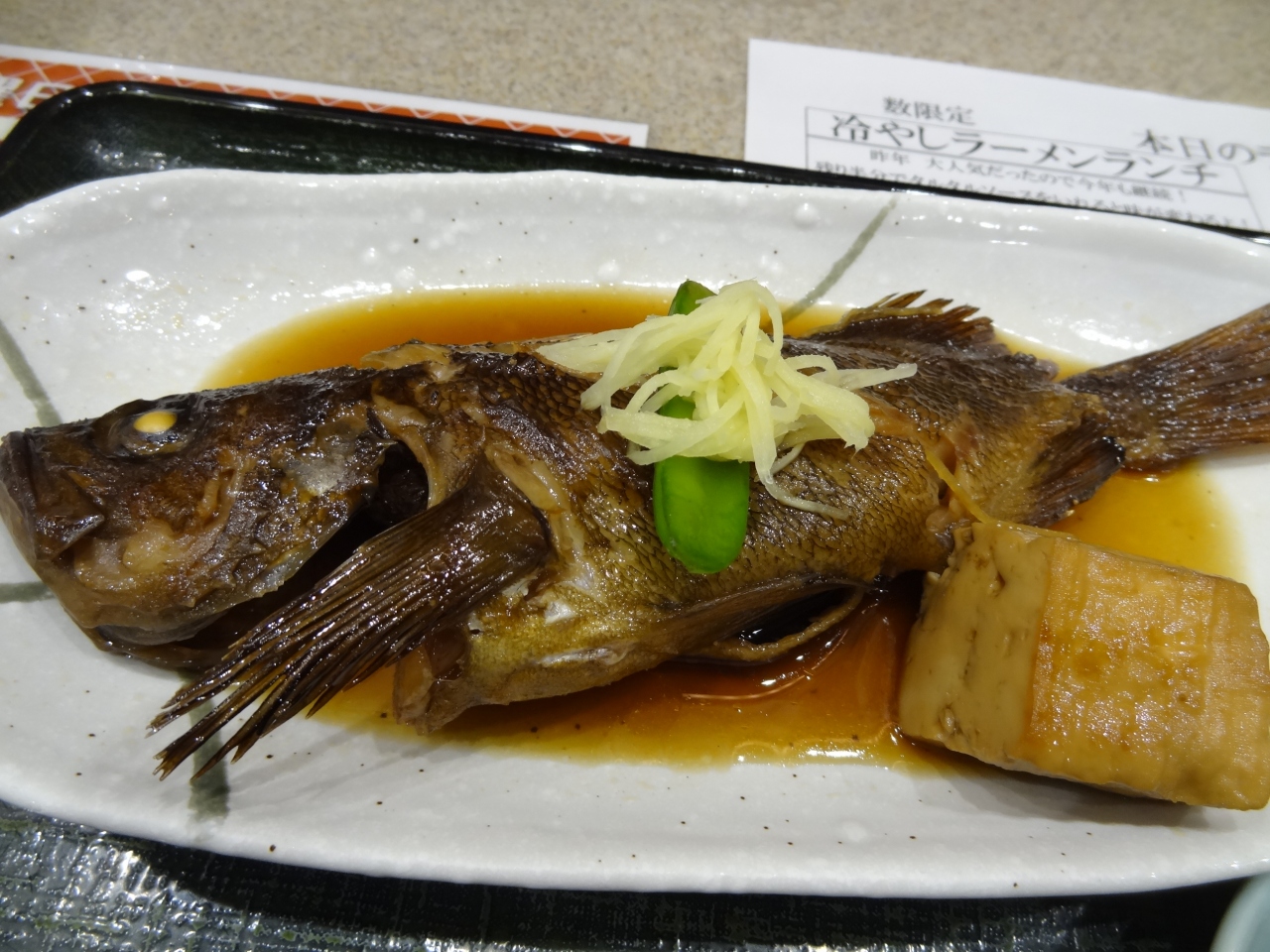 総合金山駅のバスターミナル東側、地下にあるお店です。初めて利用しました。地下にある店だと息苦しさを感じる人がいるかもしれません。でも、結構店内は思いのほか広いので、そういう先入観は不要でした。平日の昼時でも店内は混みあっていて、カウンター席へ。オーダーしたのは「お昼のランチ、煮魚ランチ」。がやめばるの煮つけに刺身が付いた定食。お代わりできるご飯は五目飯。刺身が二種類だけなのには少し寂しさが...しかし、めばるの煮つけは見事な出汁でめばるの旨味を損なわないように丁寧に料理されている。魚の煮つけがこれほど旨いと感じたのは久々。これで税込み900円とはリーズナブル、この店のリピーターになるのも間違いなし。