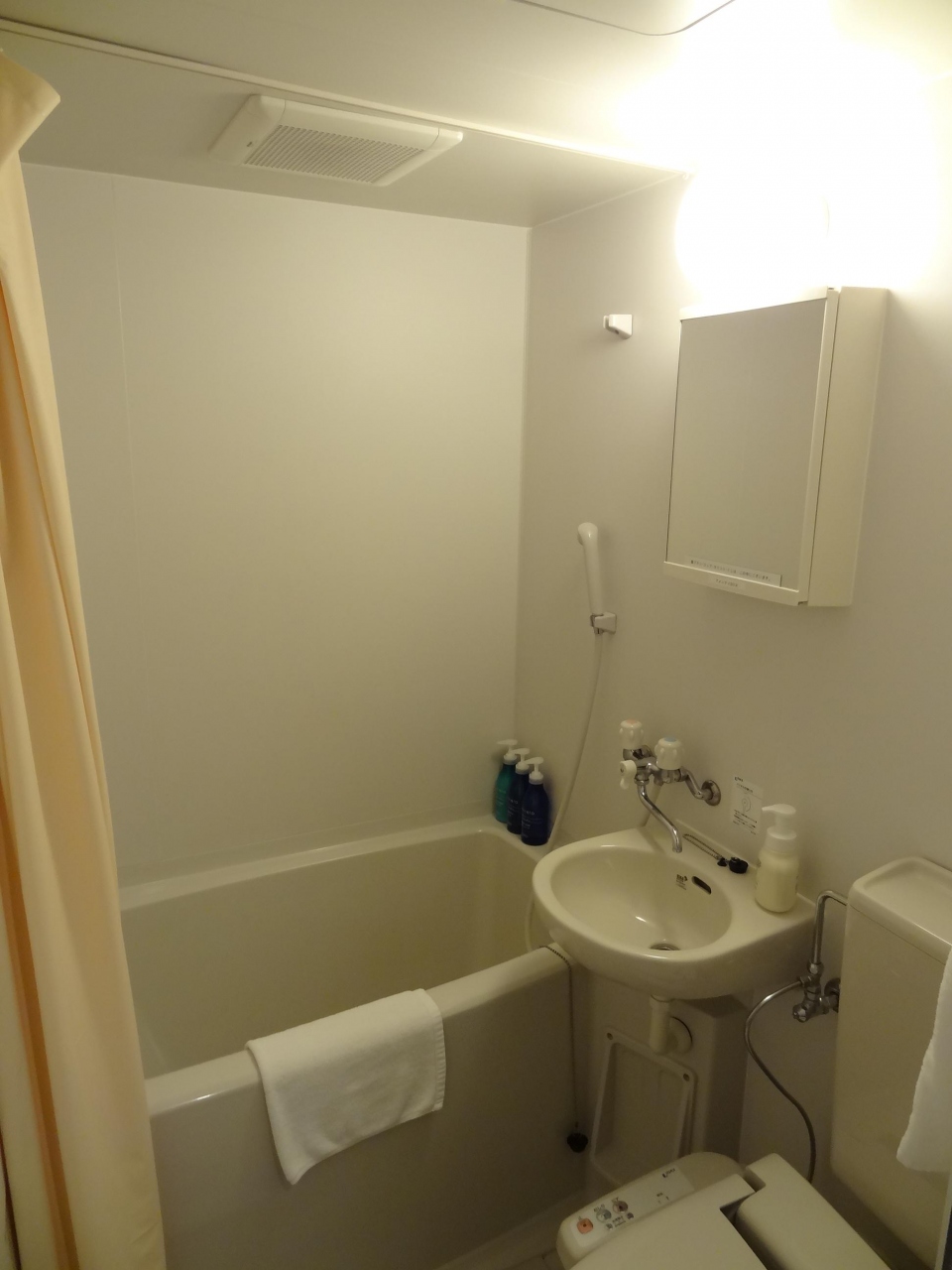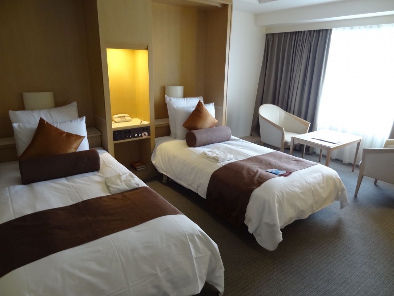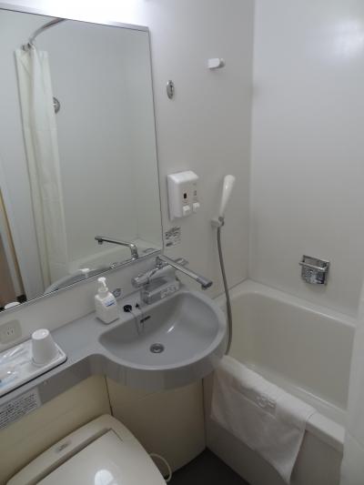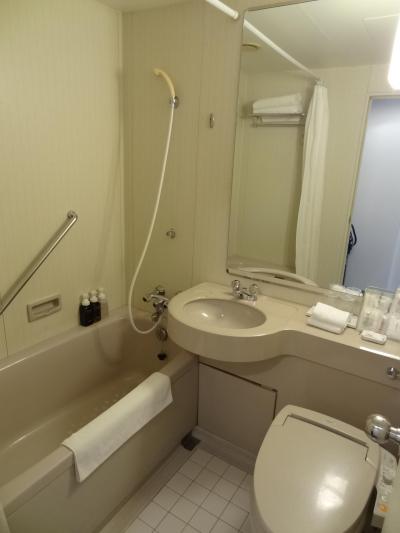 JR姫路駅の西北西、徒歩5分ほどのところにあるホテルです。いわゆるビジネスホテルで、泊まった部屋はセミダブルベッドが置いてあり、一人ならちょうどいい広さでした。テレビ台と兼ねたライティングデスクは使い勝手のいい広さ。バスルームはユニット式で、アメニティグッズが鏡の中に置いてあるのが珍しい。部屋にグラスと加湿空気清浄機があれば言うことないです。夕食はごく普通のカレーライスとうどん。朝食はブッフェ式、値段からみればメニューの多さは望めないが、まずまずの品揃えといったところ。二食付きでコスパは高いと実感できました。