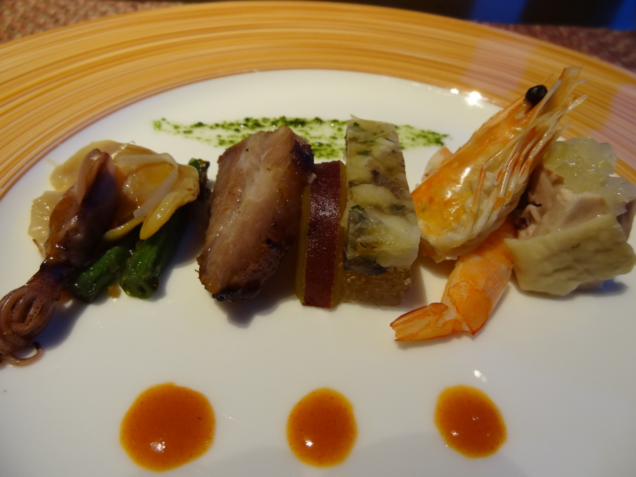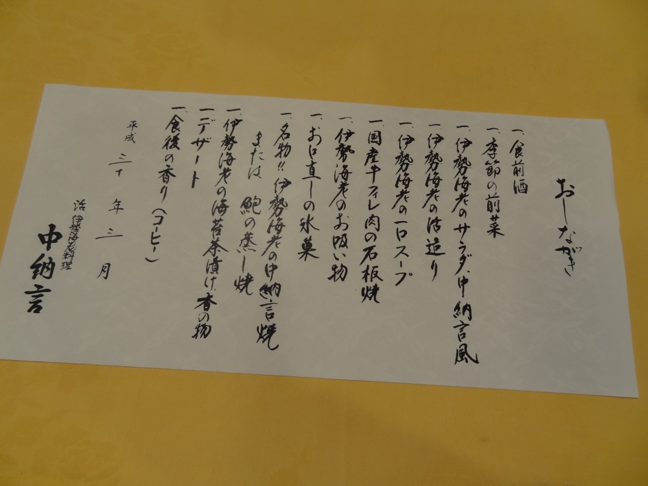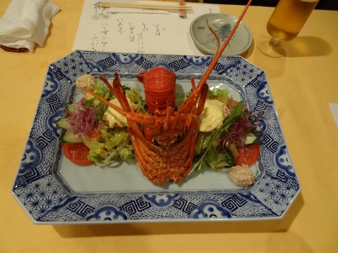 宿泊したホテルと同じビルにある高級レストランです。伊勢海老料理に徹したこだわりのあるお店です。店内は落ち着きのある調度品が揃っていて、テーブル席だけでなく個室もあるので、ゆっくり食事を楽しむことができます。予約済みの喝采コースは伊勢海老料理はもちろんのこと、国産牛(丹波牛?)ステーキの石板焼き、伊勢海老の一口スープなど、どの料理をとっても普段味わうことができないほどのハイレベルな味でした。特に、国産牛のステーキは口に入れた瞬間、歯で噛まないうちにとろけてしまうステーキ、牛肉の旨味がギュッと詰まっていて口の中いっぱいに広がってきます。まさに絶品!家内も大満足のディナーでした。