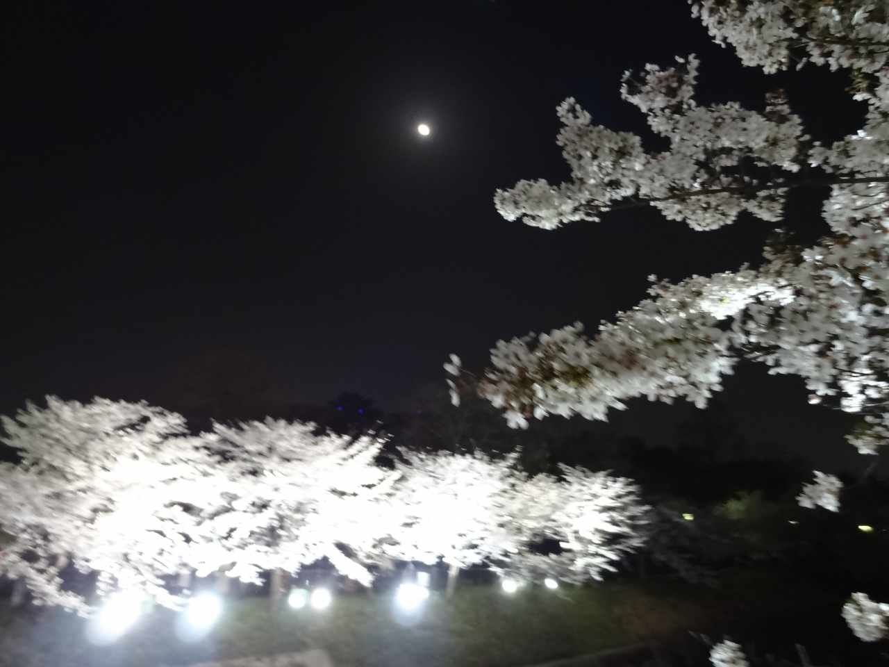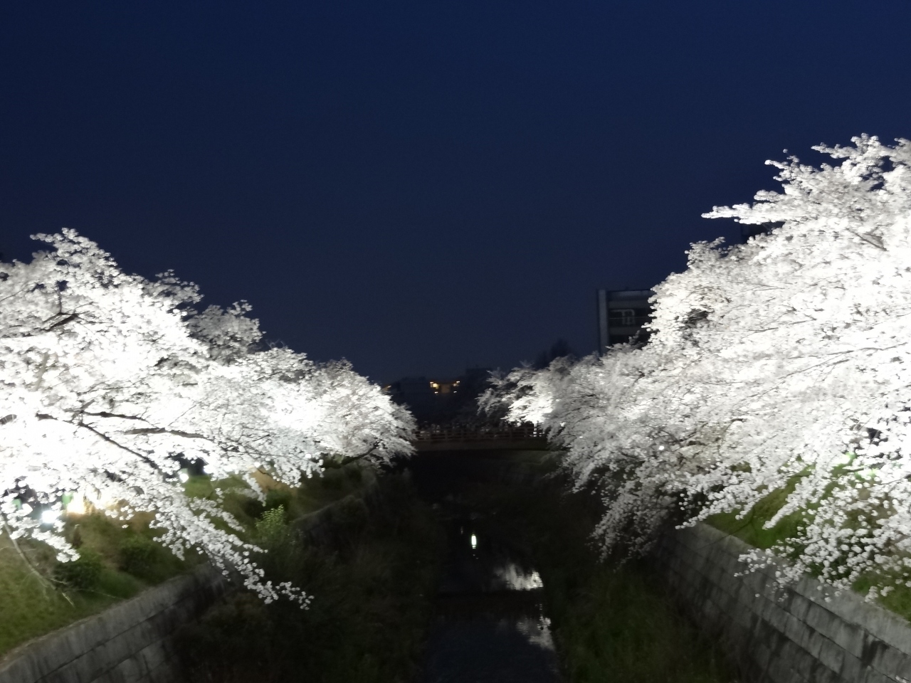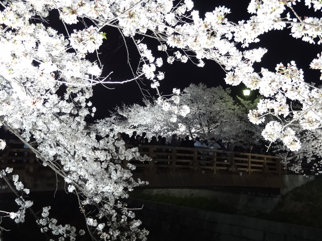 今年の桜は10日ほど早く咲き、3月末にはすでに満開。ライトアップが始まる頃には散り始めるか?とヤキモキしていました。29日からライトアップ開始。初日の夜に山崎川へ。平日でも鼎橋から鼎小橋まですごい花見客!特に木造の鼎小橋には100名ほどの花見客でごったがえし!橋が崩落するのでは?この橋の上と橋のすぐ南側から見える桜が一番の見所です。ライトに照らされて夜空に浮かび上がる桜は薄いピンクの雲が湧き上がってくるようです。すごく幻想的な景色には都会の雑踏を忘れさせる雰囲気をもたらしてくれます。