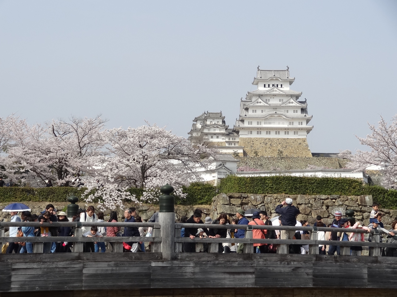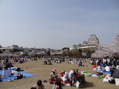 姫路城で桜が満開になるころを目指して訪れてみました。今年は例年になく、桜の開花が一週間早く満開になるのも昨年より5日間早かったようです。訪れた日は日曜日ということもあり、大混雑。お城前の大広場には広げられたシートの上に花見客がズラリ。満開の桜のピンクとお城の白、青空の青、この3色が織りなす景色はこの世のものとは思えないほどの美しさ。大感動の姫路城への旅でした。