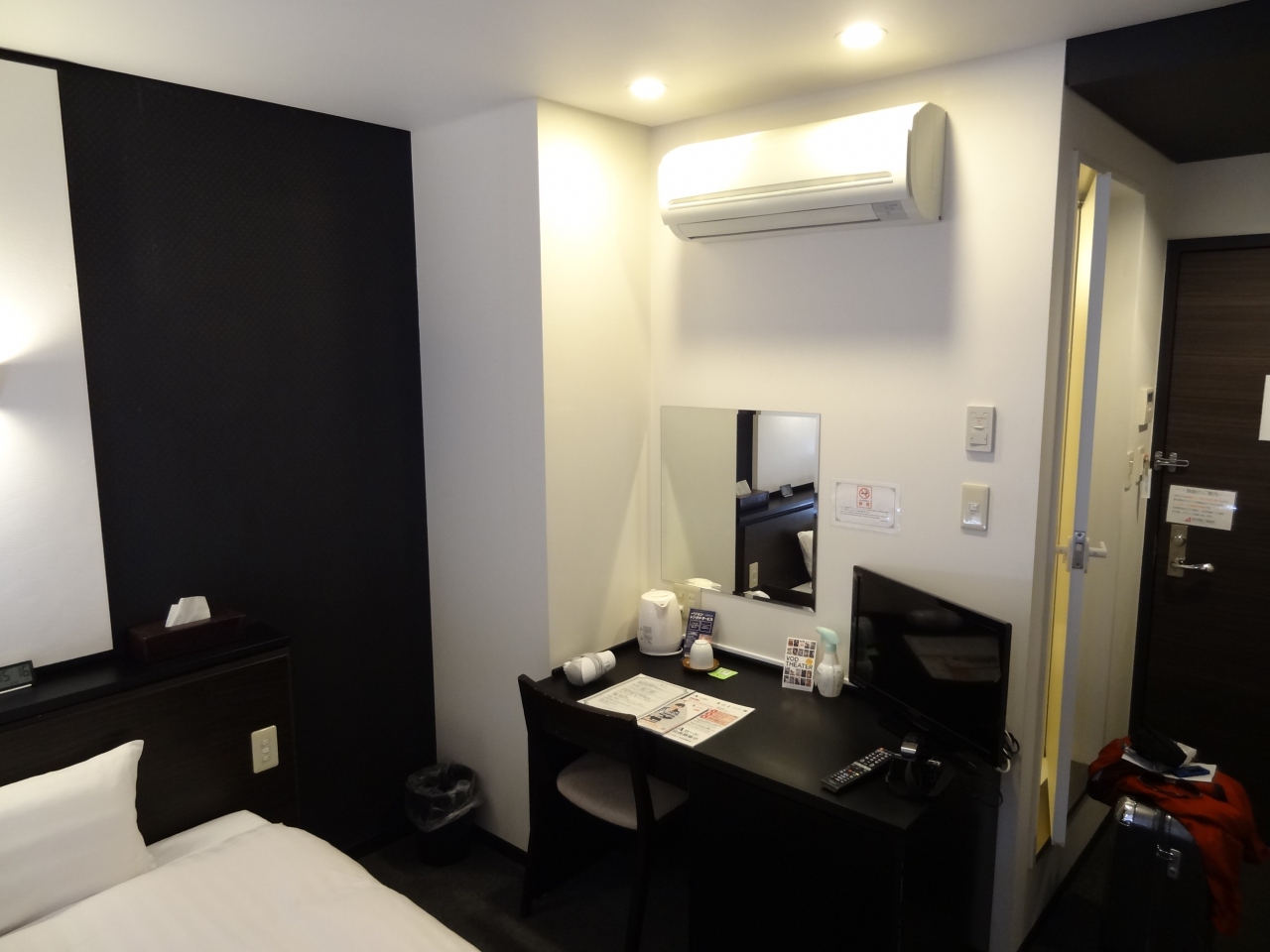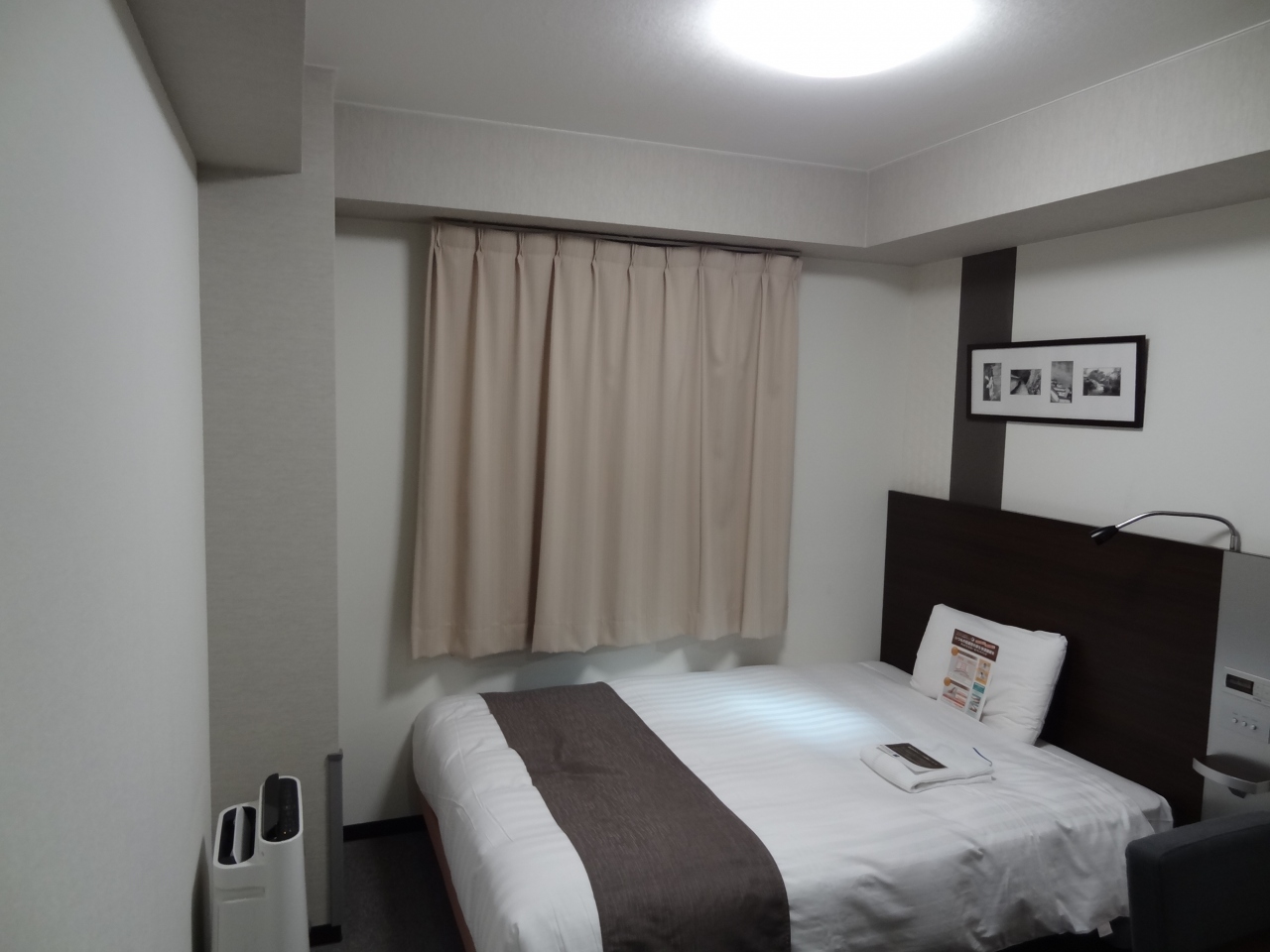 JR姫路駅から東北東へ歩いて7分ほどのところにある、9階建てのホテルです。泊まった二階の部屋にはセミダブルのベッドがあり、スーツケースを広げても十分な広さがありました。バスルームはビジネスホテルでは普通のユニット式です。一人で使うには満足できる設備です。うれしかった備品としては、加湿空気清浄機とスーツケーススタンド、それにグラスがあったこと。それに、朝食が無料というのいいです。ブッフェ式でそれほどメニューの種類は多くないですが、おにぎりや巻き寿司までがあるのには満足できました。コスパは高いホテルなので、また姫路に来る時があれば、リピーターとして宿泊、いや連泊しようと思いました。
