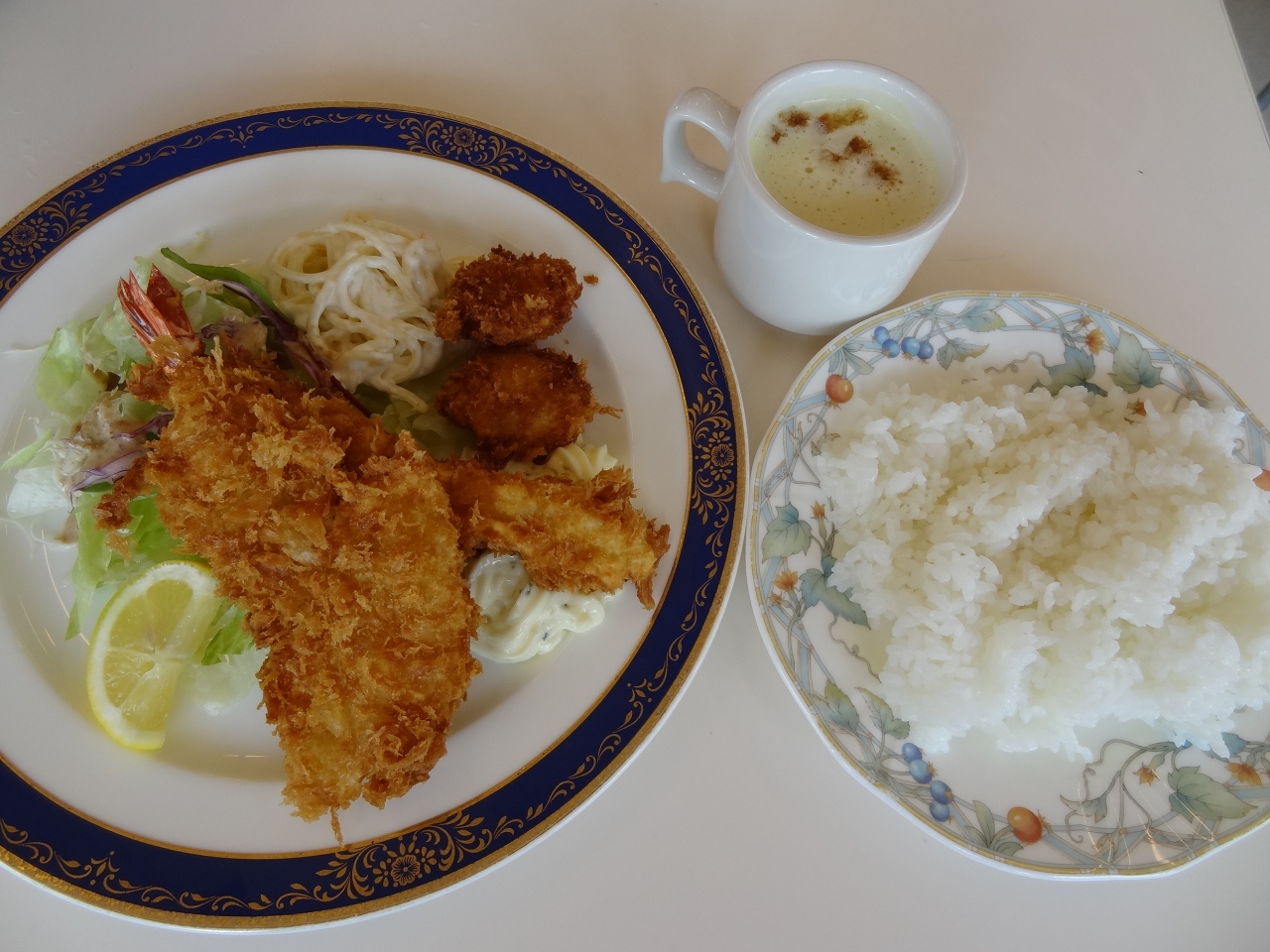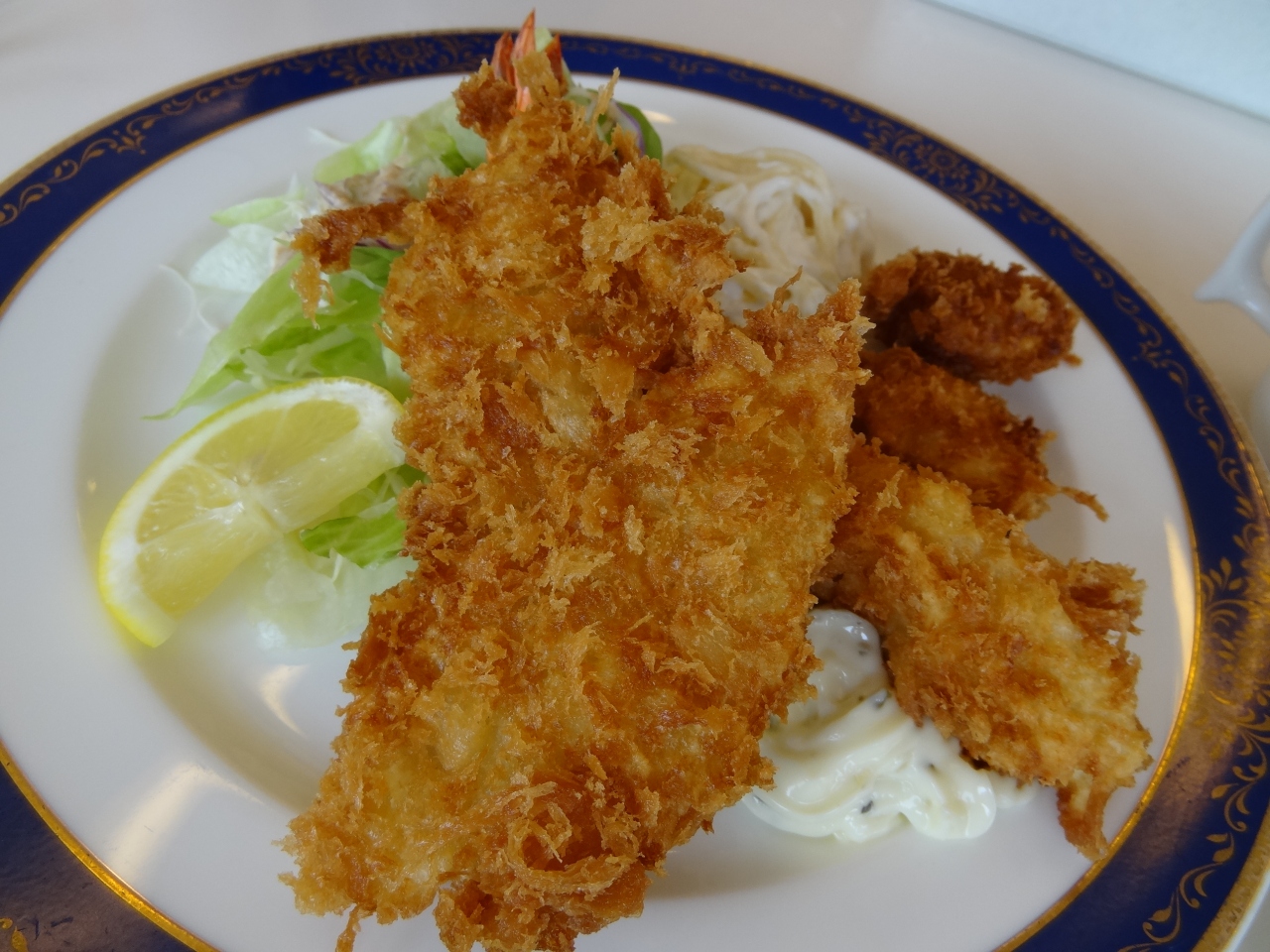 須磨海浜水族園の中にある、海鮮料理をメインメニューにしたレストランです。小さなお子さんの口にも合うような、ハンバーグ料理などもメニューに入っています。窓が海の方向に向かっていて、窓側はソファー席になっています。もちろん、4人がけのテーブル席もあります。シェフお勧めの淡路産牛を使った「和楽御膳」も魅力的でしたが、オーダーしたのは「シーフードフライ定食」。白身魚やエビなどのフライに