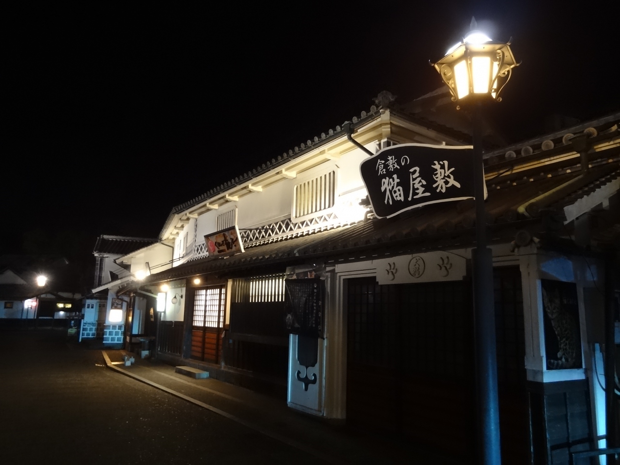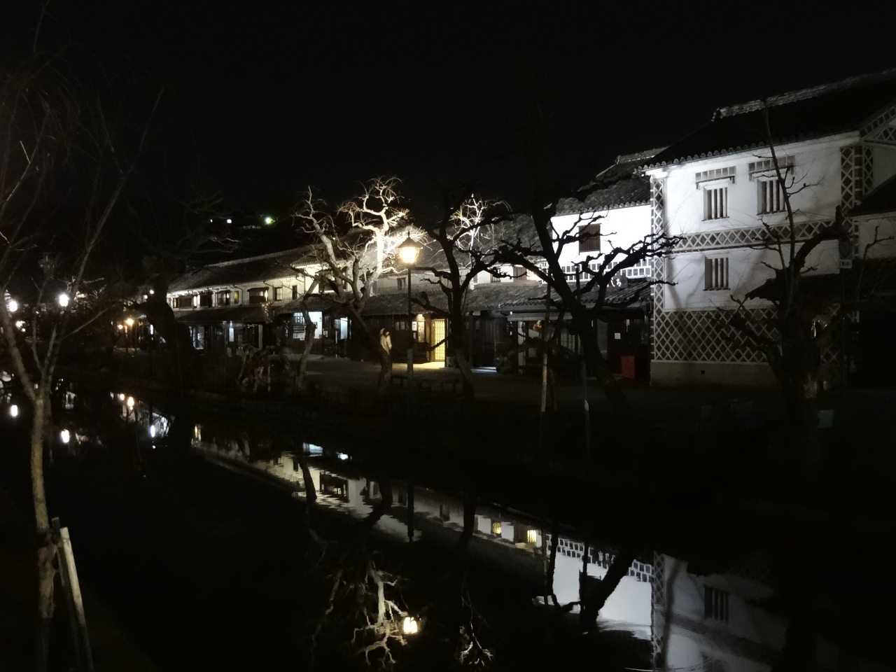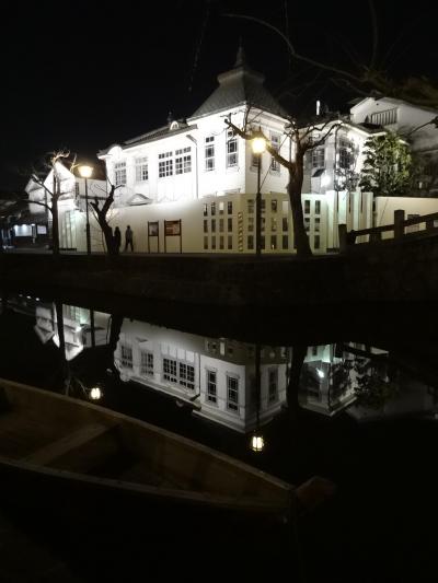 以前、この美観地区を訪れたことがあります。今回は、夜の美観地区の景色を撮影したくて再度訪問。明るすぎるライトアップより、民家から漏れるほのかな灯りで照らされる景色は最高でした。影絵のように和服を着た女性がチリ桜を見ながら座っている絵が玄関引き戸に映し出されるのは、美観地区の趣をより一層高めてくれます。蔵の白い壁が運河の川面に映る風景はこの世のものとは思えないほどの幽玄さがあります。午後七時台の夜景が観光客もまばらにいて最適なようです。午後八時台になると観光客はほぼいなくなり、民家からの灯りも減ってくるので、撮影には不向きになるみたいです。