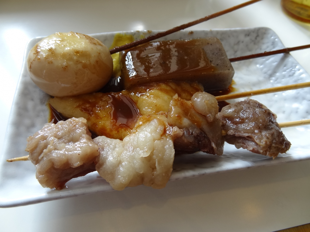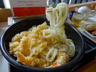 丸亀城内観光案内所で紹介していただき、さっそくこのお店でランチを食べました。店内には有名人の色紙がいっぱい壁に飾られていて、人気店だとすぐわかります。注文したのは、海鮮天ぷらぶっかけ(大盛り)。待っていると、お店の奥のほうから「ドンドン」という音が聞こえてきます。うどんを打っている音です。これはかなり期待できそう。近くにおでんや塩むすびもあります。おでんが安いことにはビックリ!玉子・こんにゃく・練り物は各50円、牛すじ肉は100円。かなりリーズナブルです。いい出汁がおでんに染み込んでいて美味しい。あとで、知ったのですが、うどん屋さんにはおでんがメニューとしてあるのはごく普通のこととか。うどんの出汁がそのままうどんにも使えるからです。うどんに乗っかっている海鮮天ぷらはサクサクとしていい味をしています。カニの爪やエビ天が乗っているのは豪華な感じがします。うどんは手打ちということだけあって、コシがある太めタイプ。土瓶に入っている出汁をかけていただきます。もう、味は絶品そのもの!天ぷらとの相性も抜群!一切、手抜きがなくて素材の味を大事にした料理をいただけて大満足でした。名古屋から丸亀市に来てよかったと実感できました。