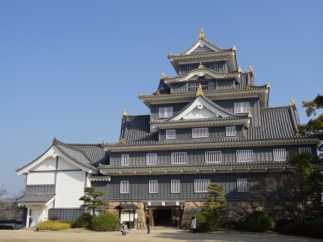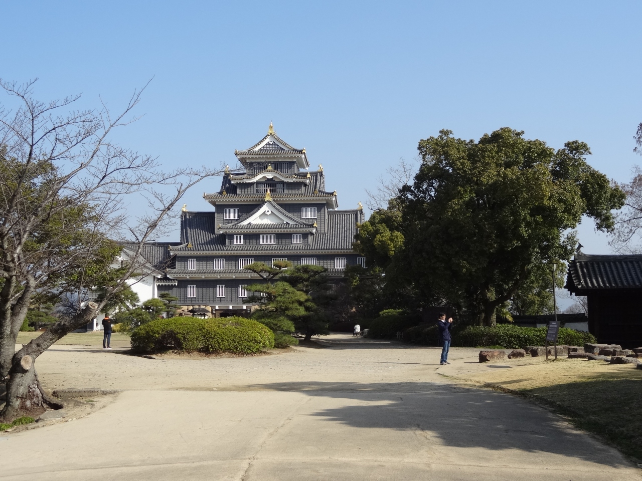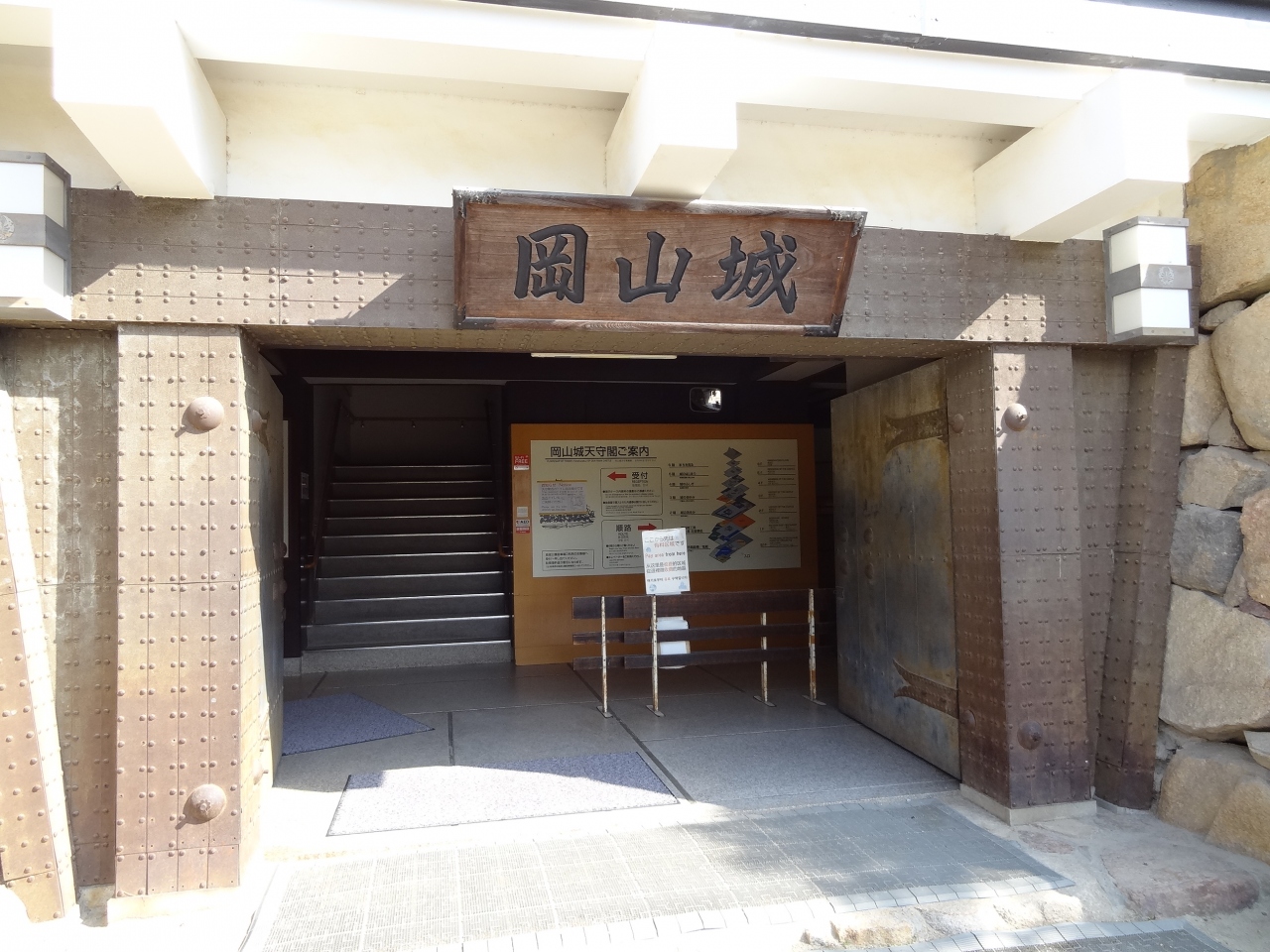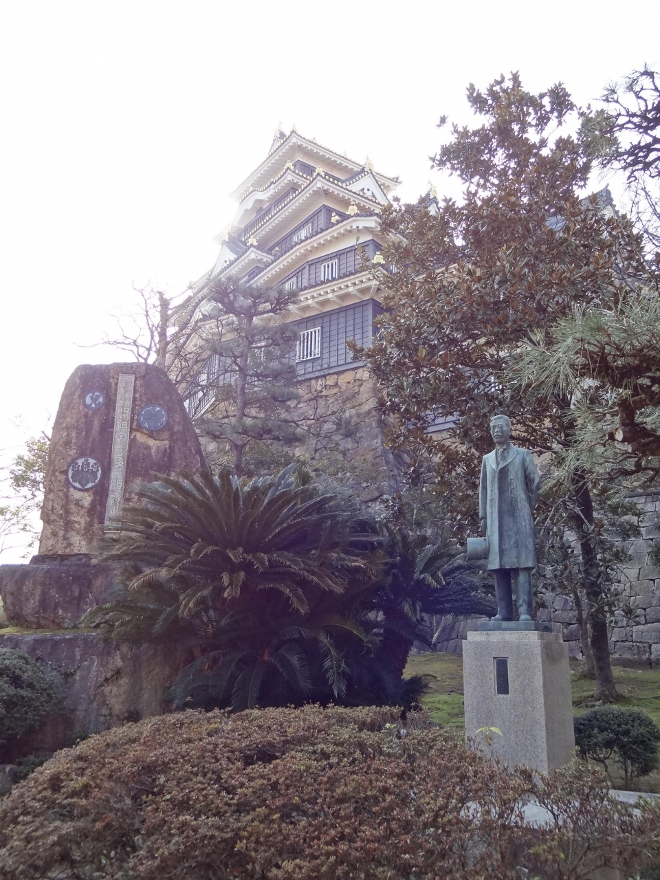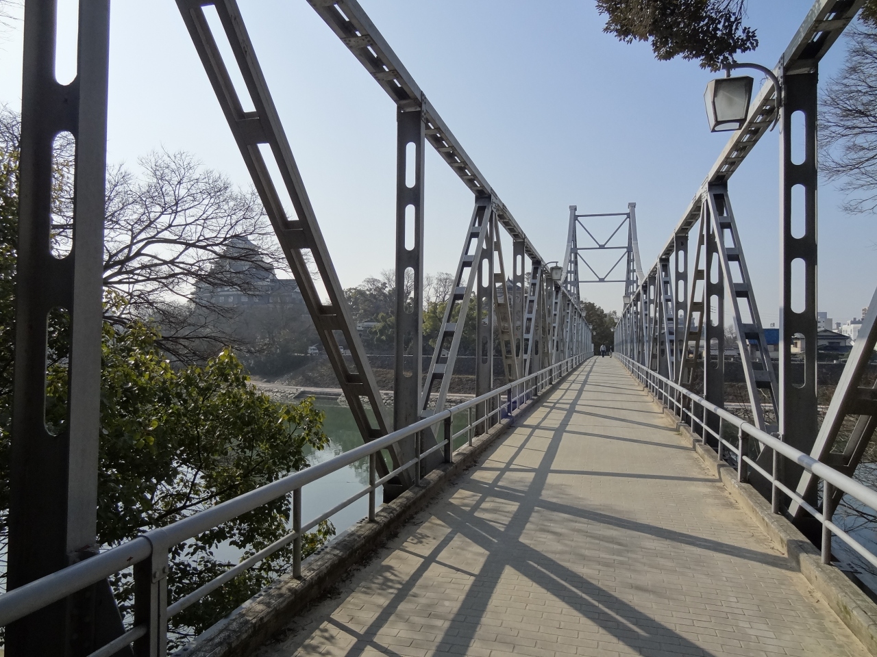 初めて後楽園を訪れてみて、園内から岡山城が見えるのに気づきました。なーんだ、意外と近くにお城があるんだ、と思い、お城の方向へ向かうとお城への入り口がありました。そこを通って右へ曲がると鉄橋があり、ここから見えるお城もいい景色になっていました。天守閣まではそれほど上り坂を歩かなくても、楽に天主前の広場に出られるのがいいです。広場から見えるお城は、全体的に黒く烏城の異名を持つ松本城を思い出させてくれます。多層階の天守閣は空のほうに向かって上がっていく感じがして、威厳があります。広場の両脇にはライトアップ用のライトが設営されているので、今度こちらへ来る機会があれば、ぜひ夜の時間帯に来てライトで浮き上がる岡山城を見たいと思います。
