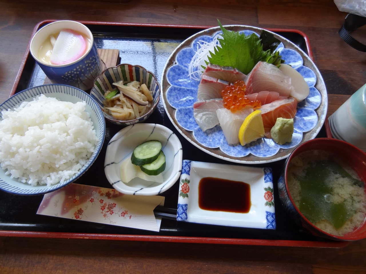 日生諸島巡りの観光を終えて日生駅へ行く途中で、このお店に立ち寄りました。他の店では好んでつけない店名に惹かれました。店の前には旗が6本はためき、メニューサンプルがないので少し不安に思いながらも店の中へ。店内はすべて木造で、木のぬくもりが感じられます。テーブル席の横には座敷もあります。一人なのでカウンター席に着席。手書きの品書きにこの店の温かみを感じます。オーダーしたのは刺身定食(1200円)。値段が安いのでそれほど期待しなかったが、これが一転! 出された刺身は、はまち・鮭・ほたて・いくら、このボリュームに圧倒!肉厚で歯ごたえがしっかり感じられるプリプリ感。魚も入った具沢山の茶碗蒸し、これも味がすごくいい。トータル的にみて、もう500円は高くてもいいのでは?と思うくらいです。日生駅近くの観光センターでもこのお店はおススメしていますとのこと、なるほど!と実感できました。