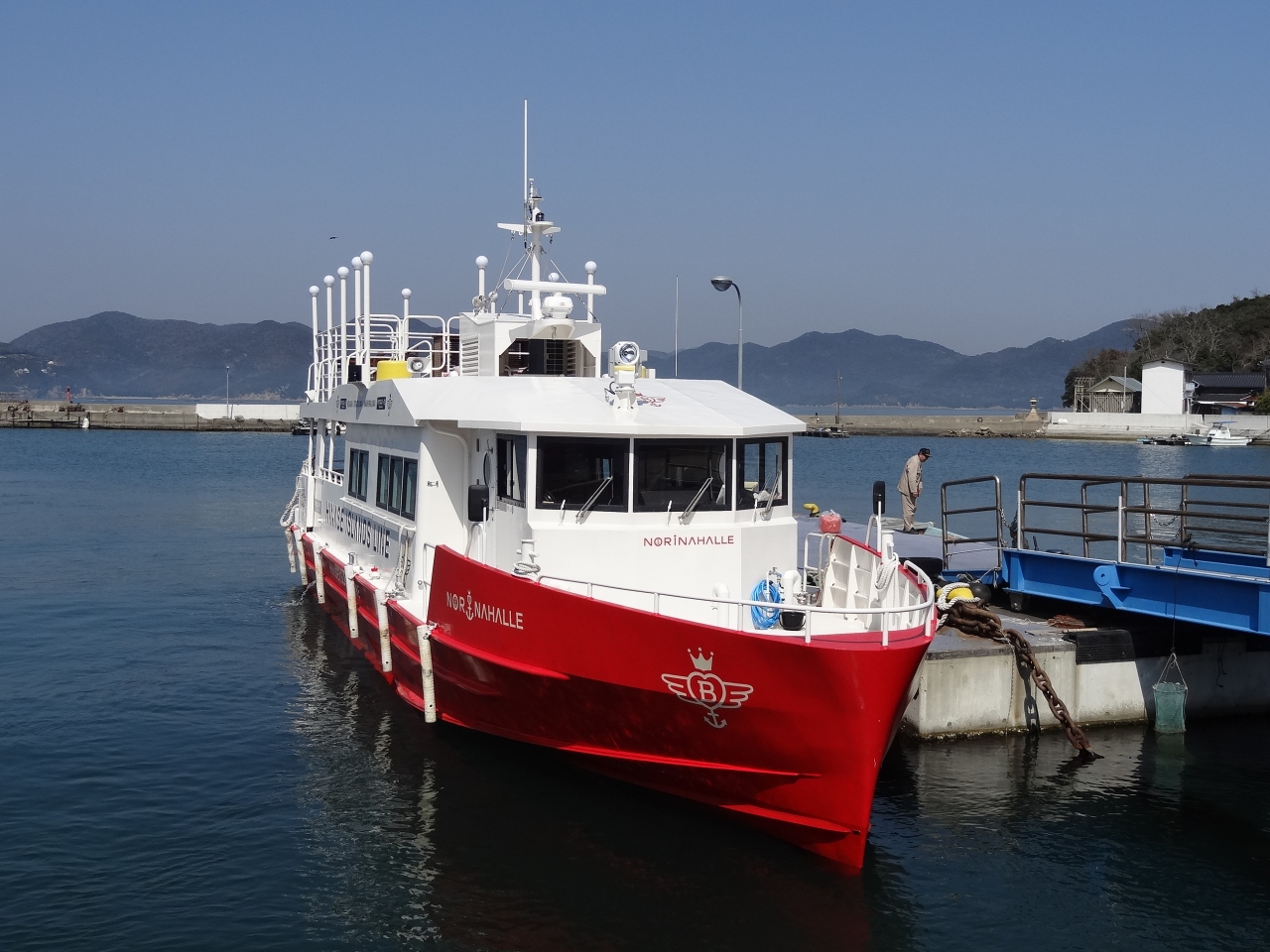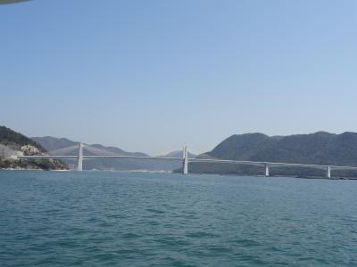 「のりなはーれ」の片道乗船券をひょんなことから入手でき、さっそく乗船しました。船体は白と赤のツートーンカラー。半年ほど前に就航したばかりで、船内の設備は新しい。特に、座席はベージュ色で背もたれが高くてヘッドレストがあるタイプ。高級感があります。二階には展望デッキがあって、テーブルと椅子は固定式。ここからの眺めは抜群。個人のクルーザー船を借り切ったような気分で最高です。船からの見所は出港してまもなく左手に見える備前・日生大橋。吊り橋のスタイルが瀬戸内海に似合っています。小さな無人島の数々が、瀬戸内海に散りばめたようでいい景色となっています。立ち寄る島は大多府島と鴻島。鴻島のほうが民宿もあり、みかん狩りで賑わいます。地元の定期便にしておくにはもったいない感じがします。たとえば、日生諸島クルーズのような名前にして、もっと観光化できる価値があると思いました。