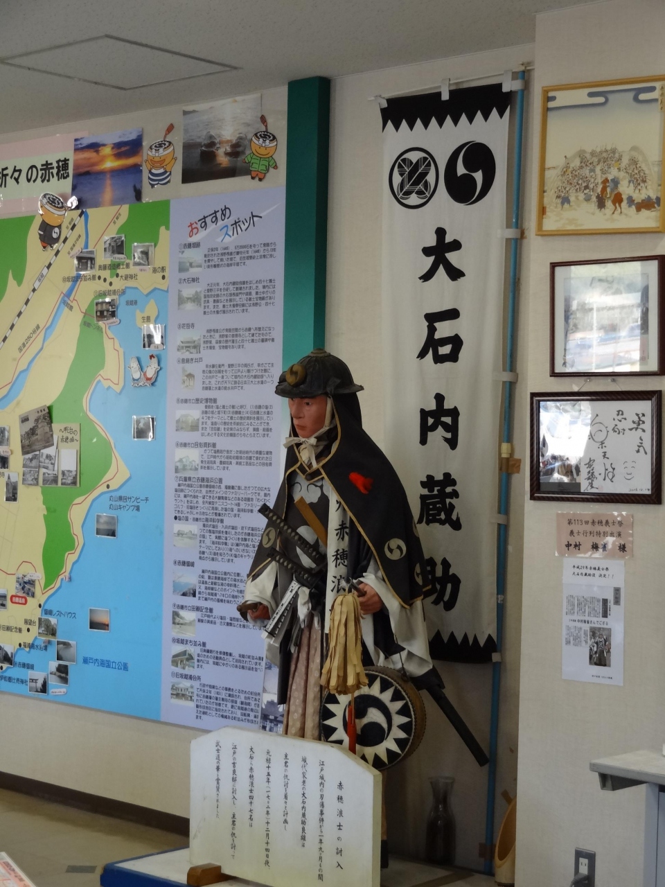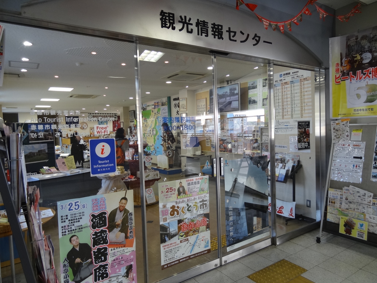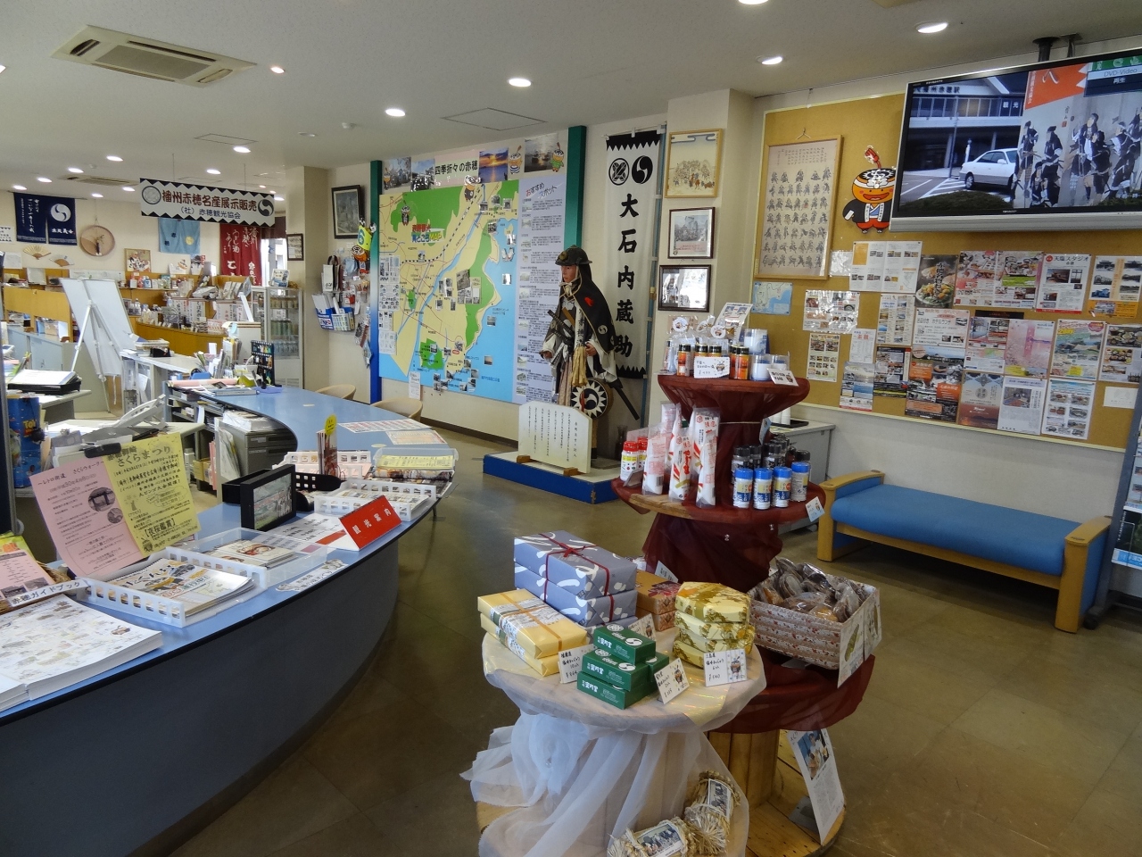 岡山県観光を終えて、兵庫県の播州赤穂市の観光情報を知りたいと思い、JR播州赤穂駅を下車。改札を過ぎてすぐ左側にこのセンターがあります。事務所が1/3を占めていますが、観光情報のパンフやモニターなどわかりやすい展示となっています。女性の職員がとても気さくで親切に対応してくれます。センターの中ほどには大石内蔵助の人形が立っていて、討ち入りの雰囲気がよく出ています。奥には赤穂市のお土産、何と言っても塩関連のお土産の種類が多いです。播州赤穂市の観光を知りたければ、このセンター利用を絶対おススメします。